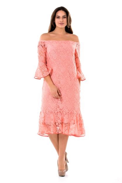 Φόρεμα Δαντέλα ελαστική μίντι, τετράγωνο ντεκολτέ εμπρός και πίσω. Στο τελείωμα του φορέματος και στα μανίκια διακριτικό βολάν. Σε Α άνετη γραμμή