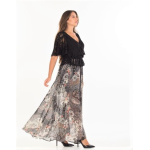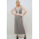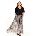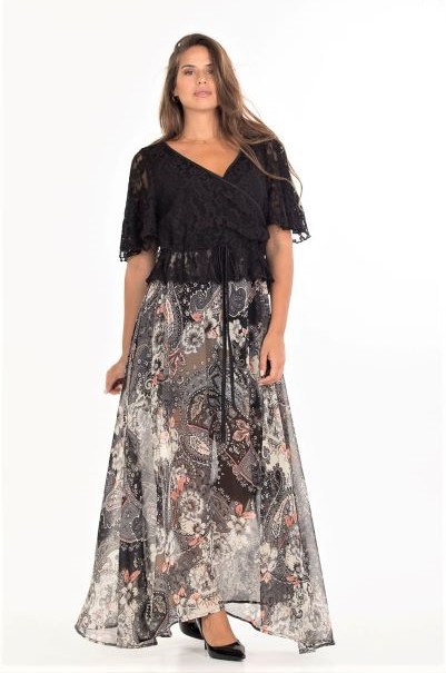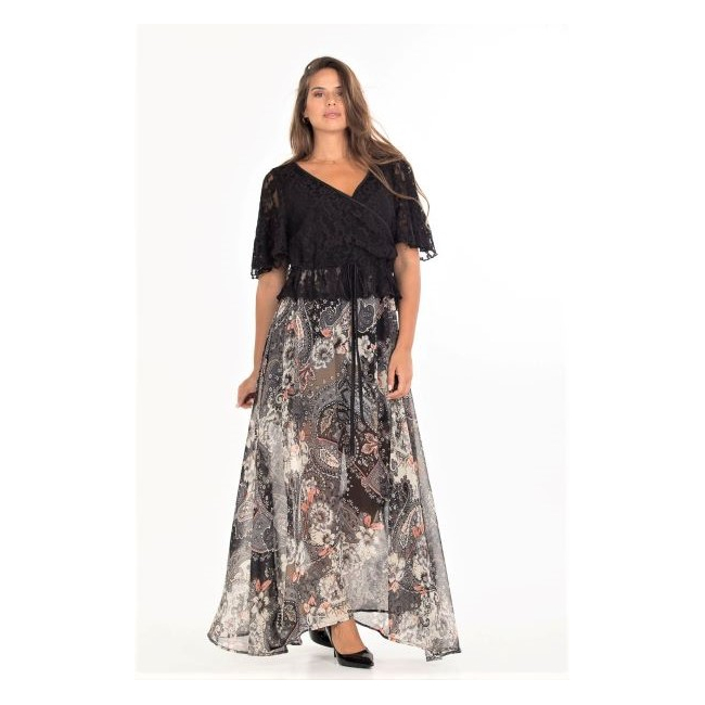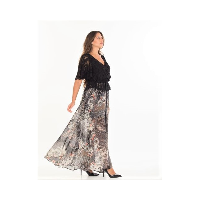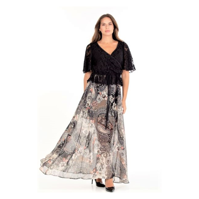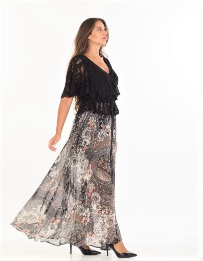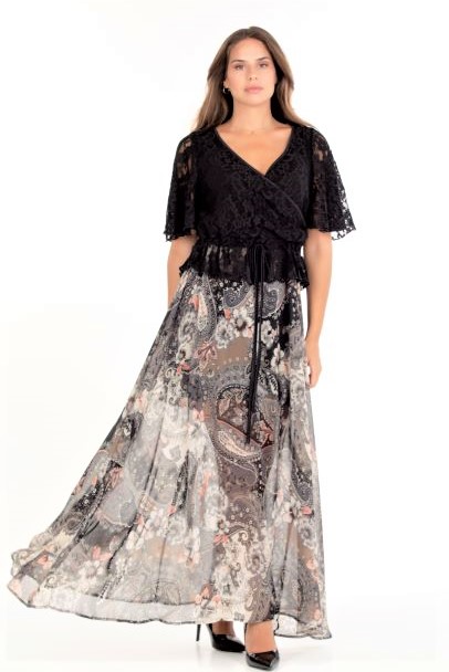 Φόρεμα maxi κρουαζέ, μπλούζα σε Γαλλική Δαντέλα, κοντό μανίκι βολάν και ενσωματωμένο κορδόνι για την δημιουργεία "μεσάτου" και Φούστα σε εμπριμέ Μουσελίνα