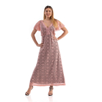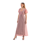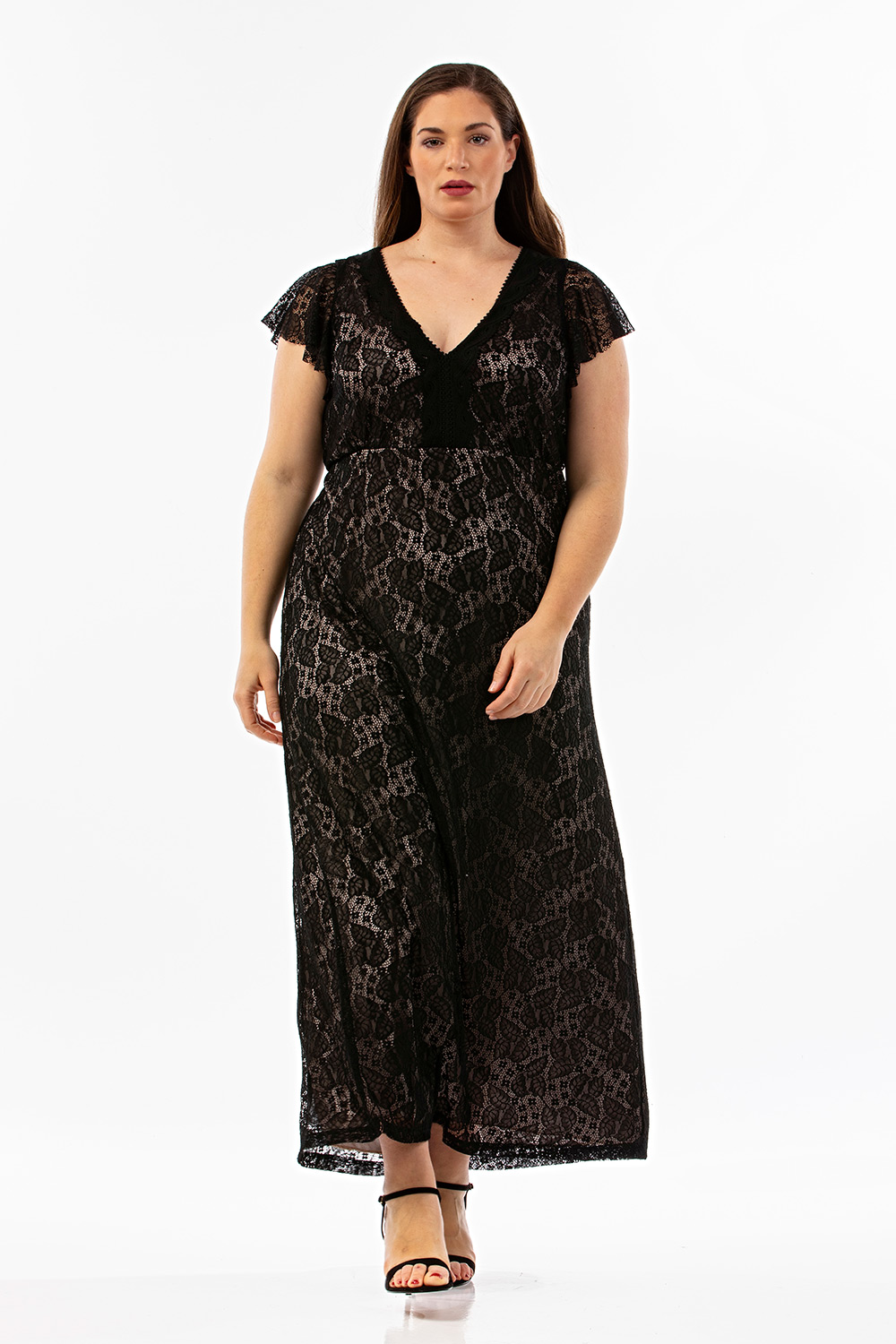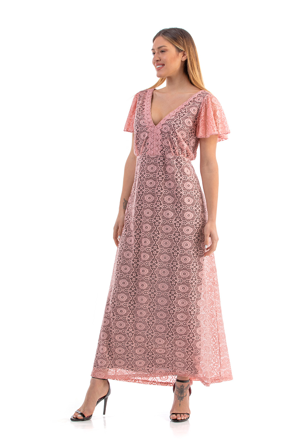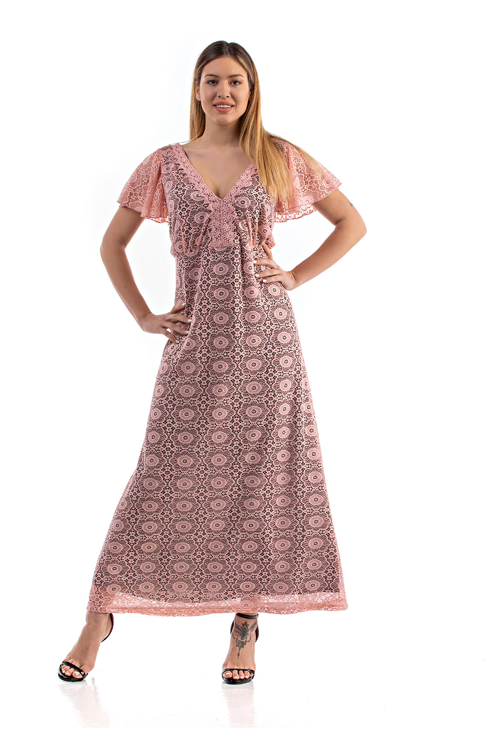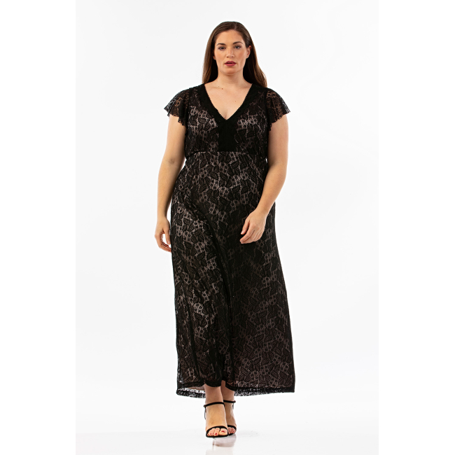 Φόρεμα μάξι σε γαλλική δαντέλα ελαστική, V ντεκολτέ εμπρός & πίσω, ζαπονέ/βολάν μανίκια, διακριτική ραφή στη μέση, σε Α άνετη γραμμή. Όλο φοδραρισμένο εσωτερικά με S. Jersey ύφασμα.