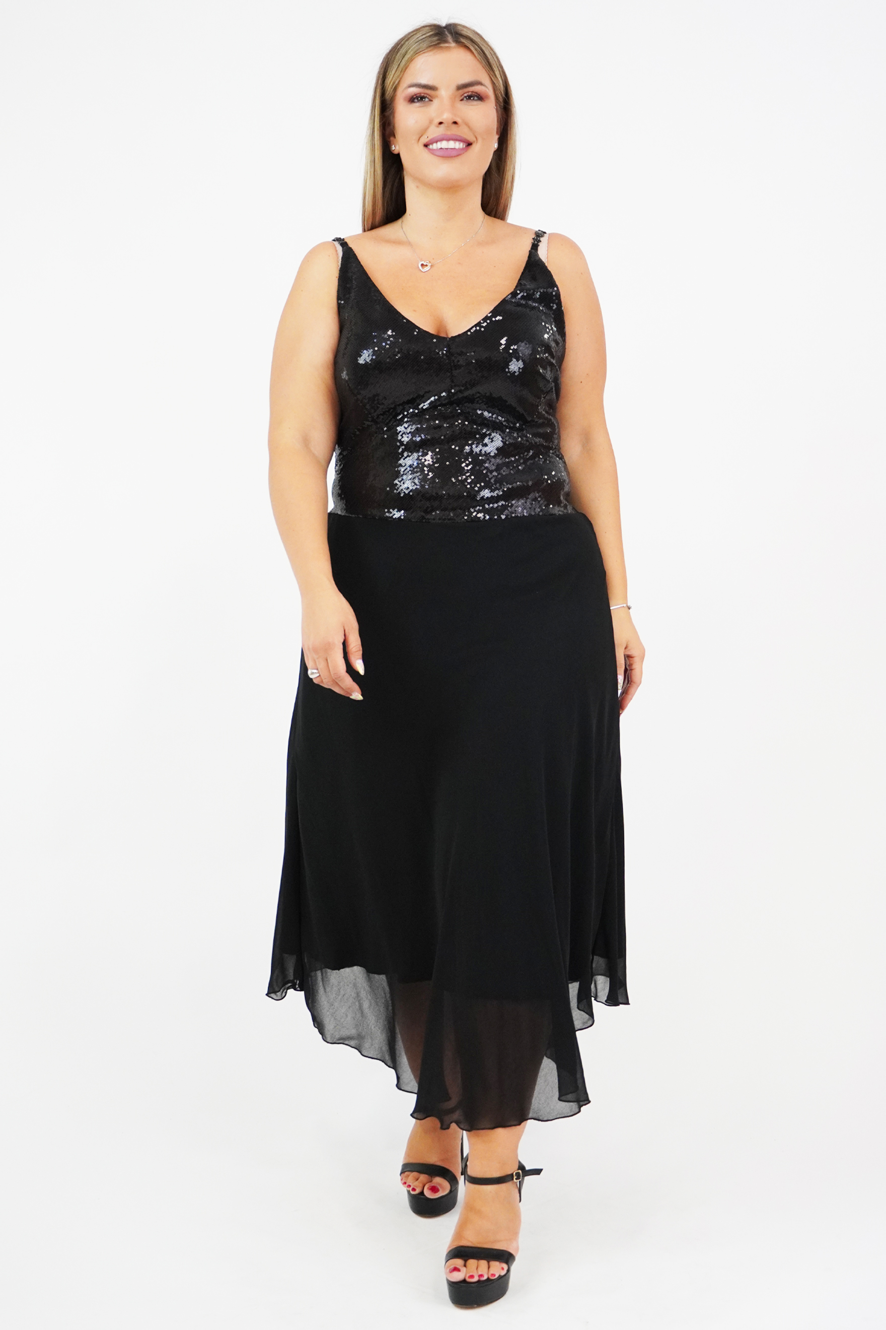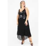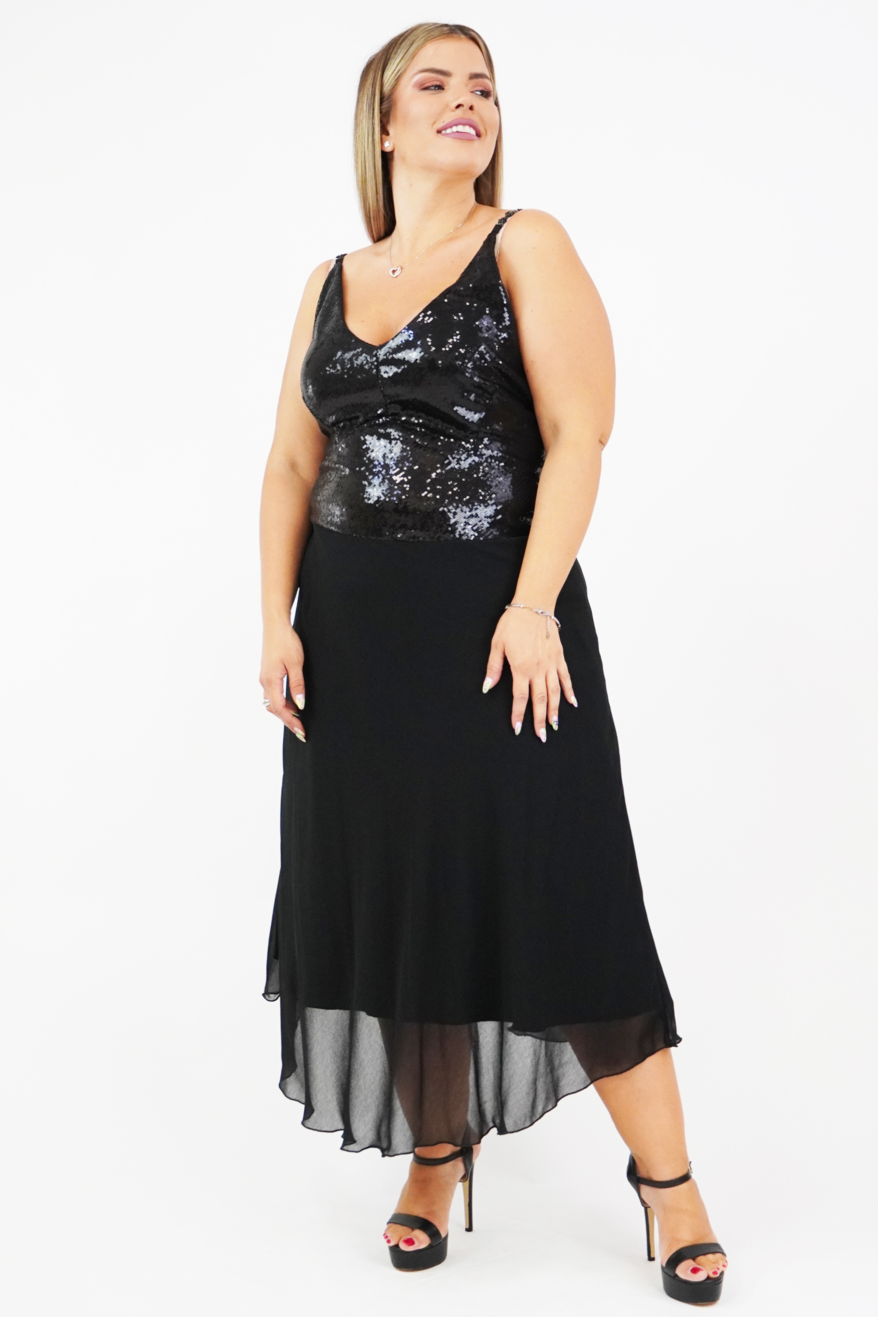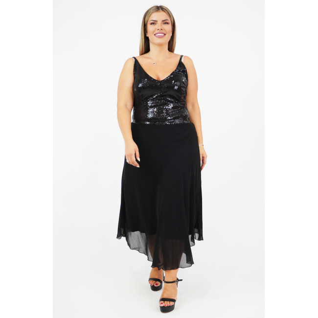 Φόρεμα μίντι σε υπέροχη γραμμή, τιράντες με κεντημένες πέτρες, μπούστο ελαστική παγιέτα με σφηγκοφωλιά πίσω, Μουσελίνα φούστα σε Α άνετη γραμμή (Φοδραρισμένο)
