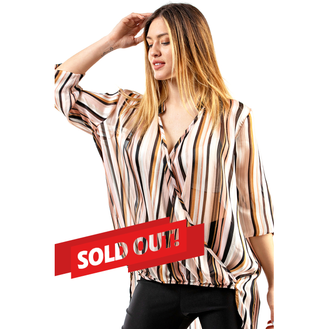 Πουκάμισο/Μπλούζα Μουσελίνα κρουαζε, ριγέ, Μαο γιακά, λάστιχο στο μπροστινό μέρος (τύπου μπουφάν) και ασυμετρία πίσω, μακρύ μανίκι μανσέτα.