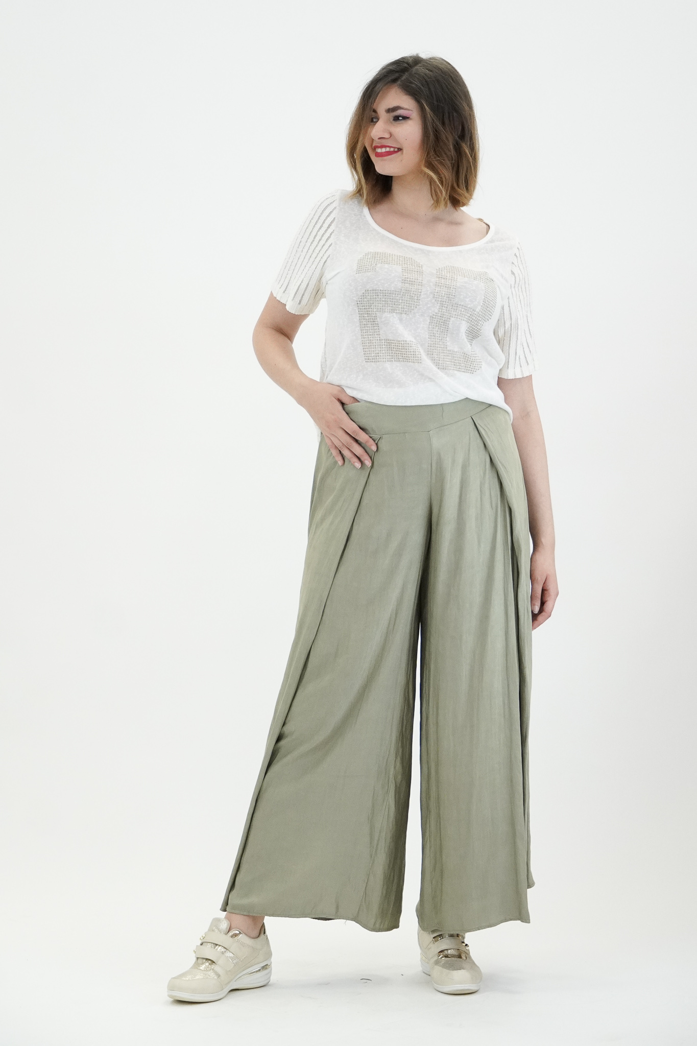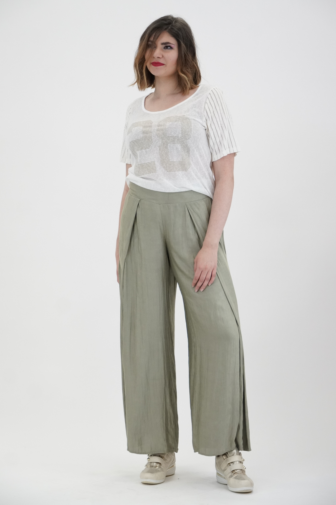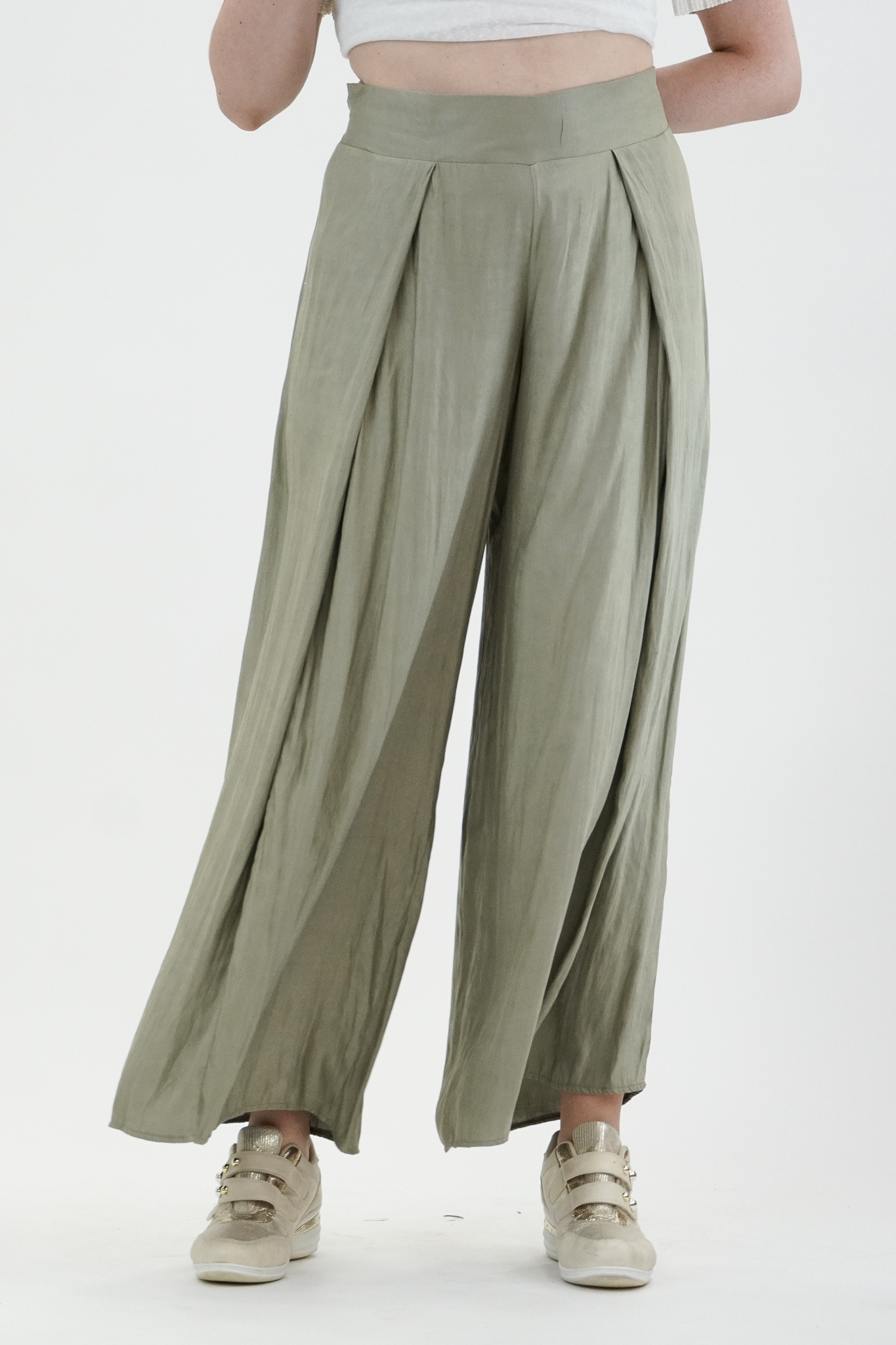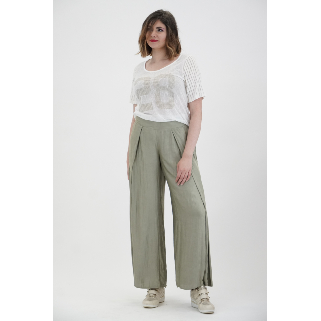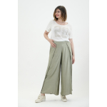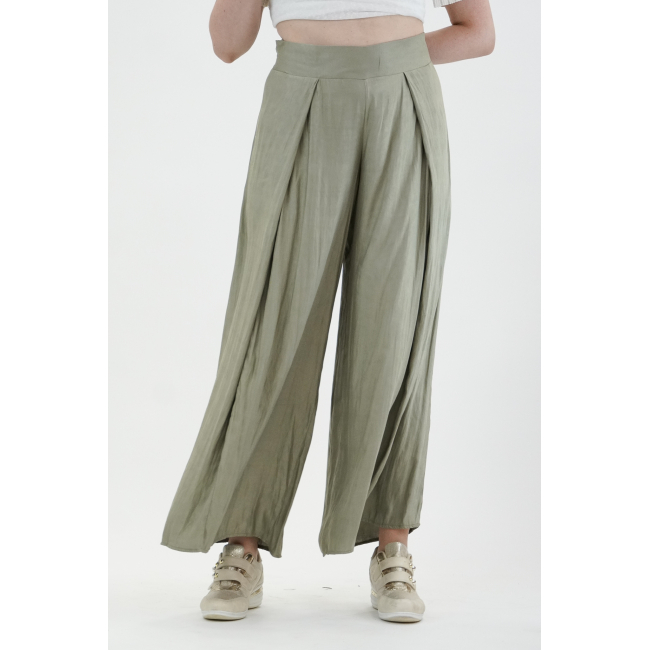 Παντελόνα σε Voual Satin ύφασμα με υπεροχή υφή μεταξιού, μπάσκα/ζωνάκι με λαστιχοκλωστή πίσω για καλύτερη εφαρμογή, κουφόπιετα στα πλαϊνά για περισσότερο φάρδος αλλά με κομψότητα, υπέροχη εφαρμογή με πολύ Α άνετη γραμμή