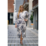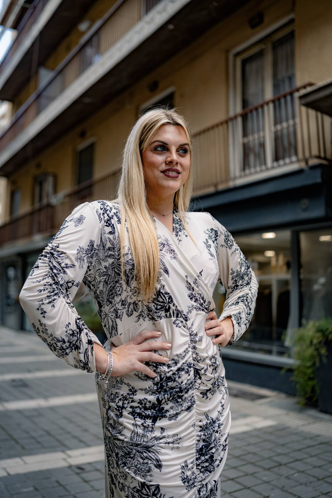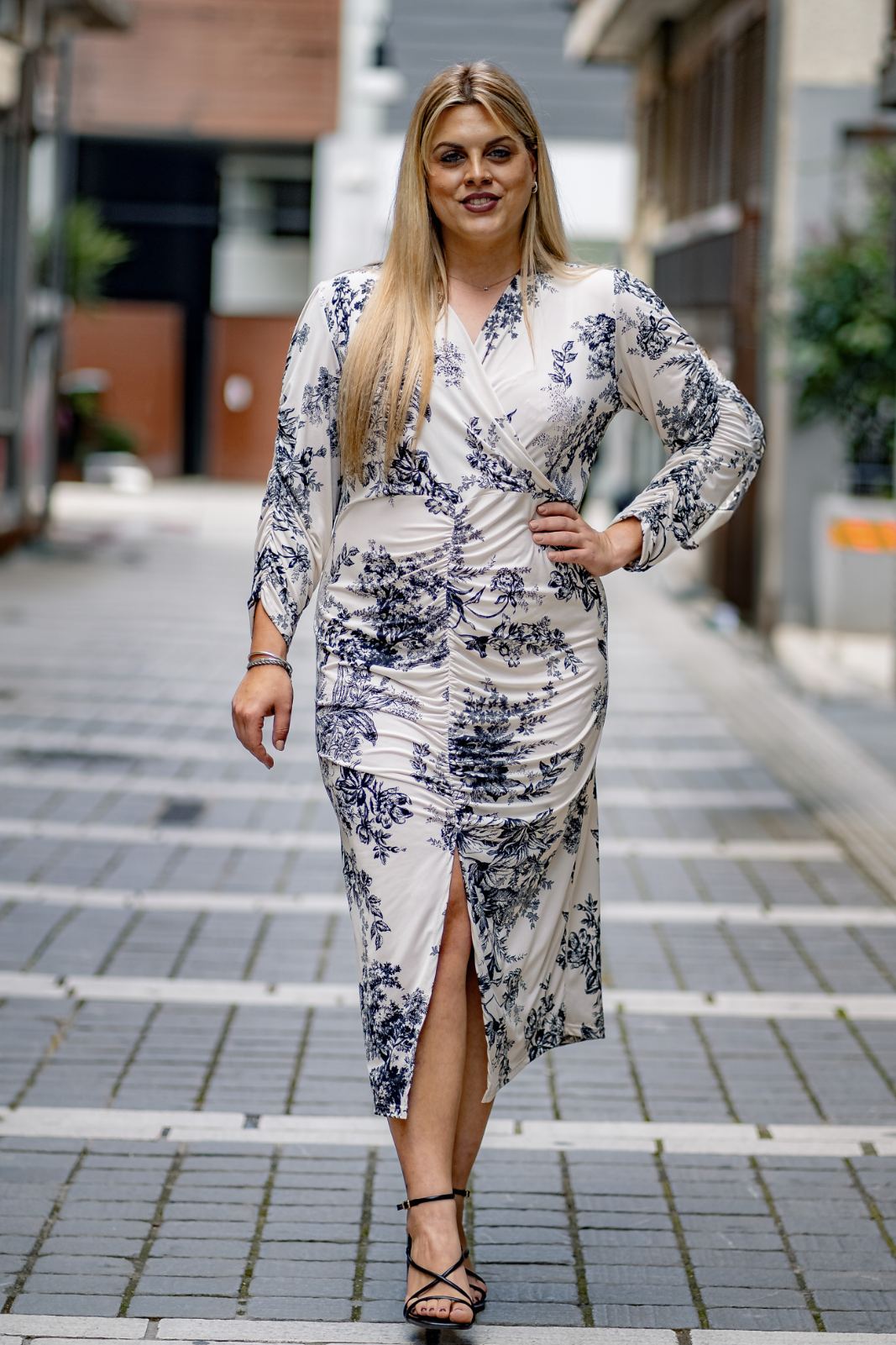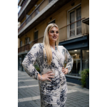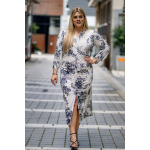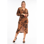 Φόρεμα μίντι εμπριμέ σε Jersey ύφασμα, κρουαζέ ντεκολτέ, κάθετη ντραπέ σούρα μπροστά που καταλύγει σε σκίσιμο, τρουακάρ μανίκια με σούρα και σε πατρόν που αγκαλιάζει με θηλυκότητα το σώμα
