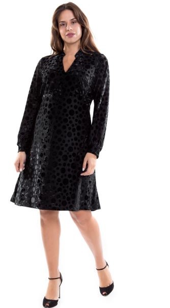 Φόρεμα μίντι σε ανάγλυφο βελούδο ελαστικό ύφασμα, Μαο γιακά με V ντεκολτέ, διακριτική ραφή στη μέση, μανίκια με ελαστική μανσέτα, σε Α άνετη γραμμή.