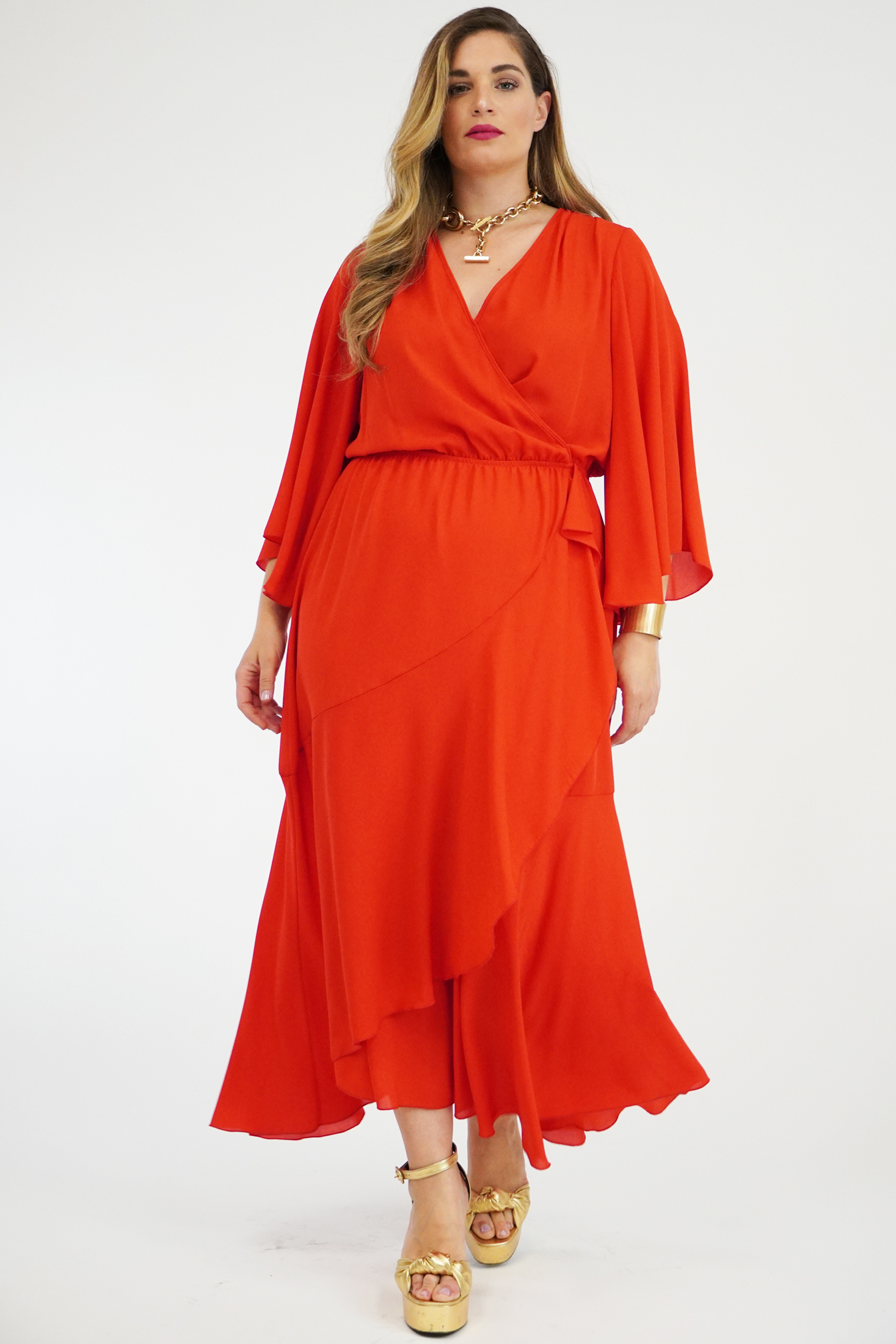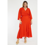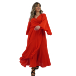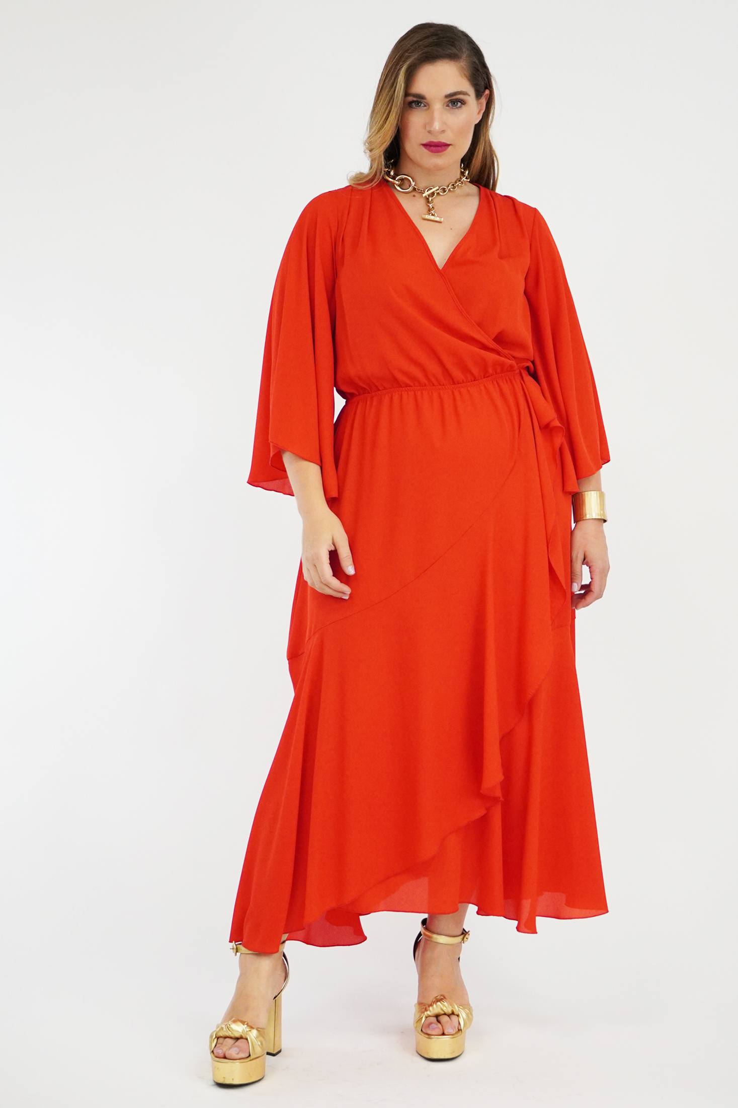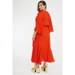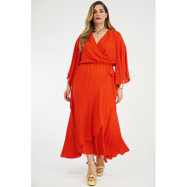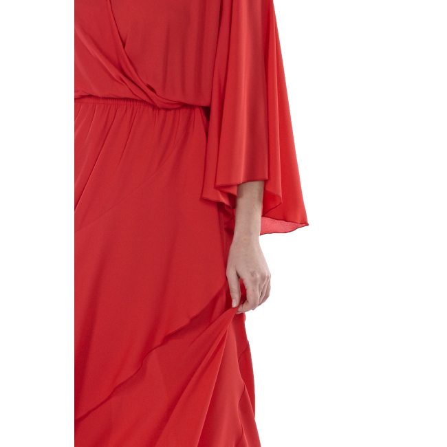 Φόρεμα αέρινο σε αδιάφανη ζορζέτα, κρουαζέ, ελαφρύ λάστιχο στη μέση, άνισα φαρδιά μανίκια σε Α γραμμή, "φάκελος φούστα με ελαφρύ βολάν στο τελείωμα", σε Α πολύ άνετη γραμμή