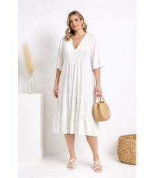 Φόρεμα αέρινο σε αδιάφανη zorzette, midi, κρουαζέ, ελαφρύ λάστιχο στη μέση, άνισα φαρδιά μανίκια με βολάν ασύμετρο στο τελείωμά τους, σε πολύ άνετη γραμμή