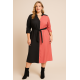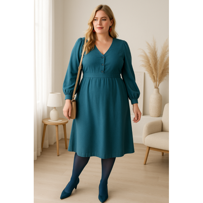Φόρεμα midi σε Voual Viscose satine ύφασμα με V ντεκολτέ, κουμπιά εμπρός έως την μέση, λαστιχοκλωστή στο πίσω μέρος του φορέματος για καλύτερη εφαρμογη, ζαπονέ μανίκια με λαστιχάκι στο τελείωμα για αίσθηση ballon, σε ίσια πολύ άνετη γραμμή.