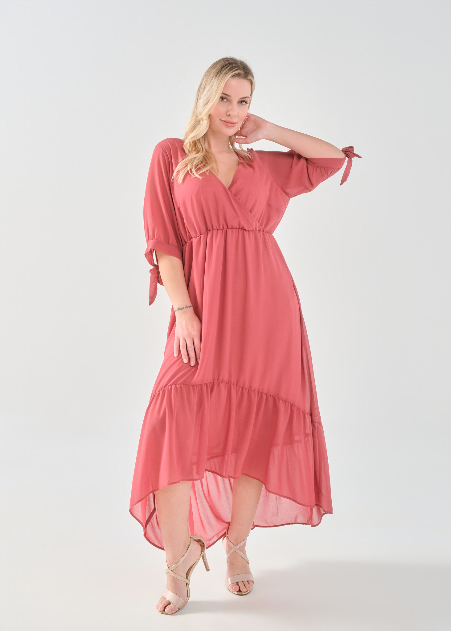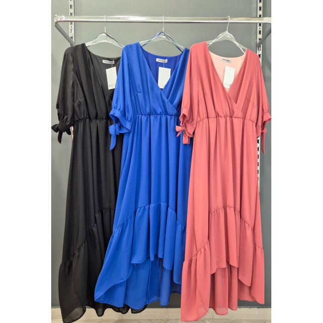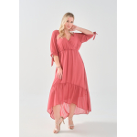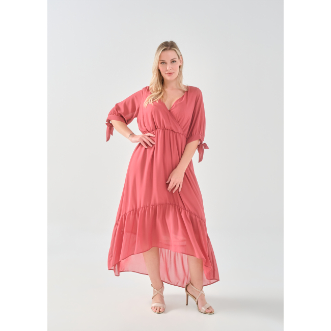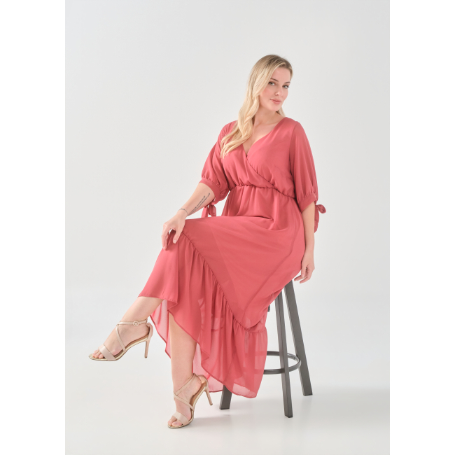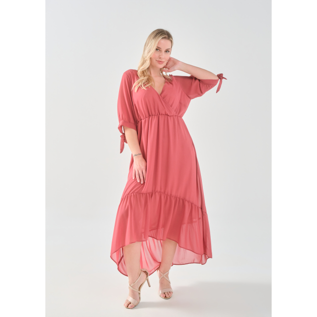 Φόρεμα μάξι μουσελίνα, κρουαζέ ντεκολτέ, μανίκια με φάσα και δέσιμο, ελαφρύ μικρό λάστιχο στη μέση για καλύτερη εφαρμογή, άνιση φούστα με διακριτικό βολάν, σε πολύ άνετη γραμμή