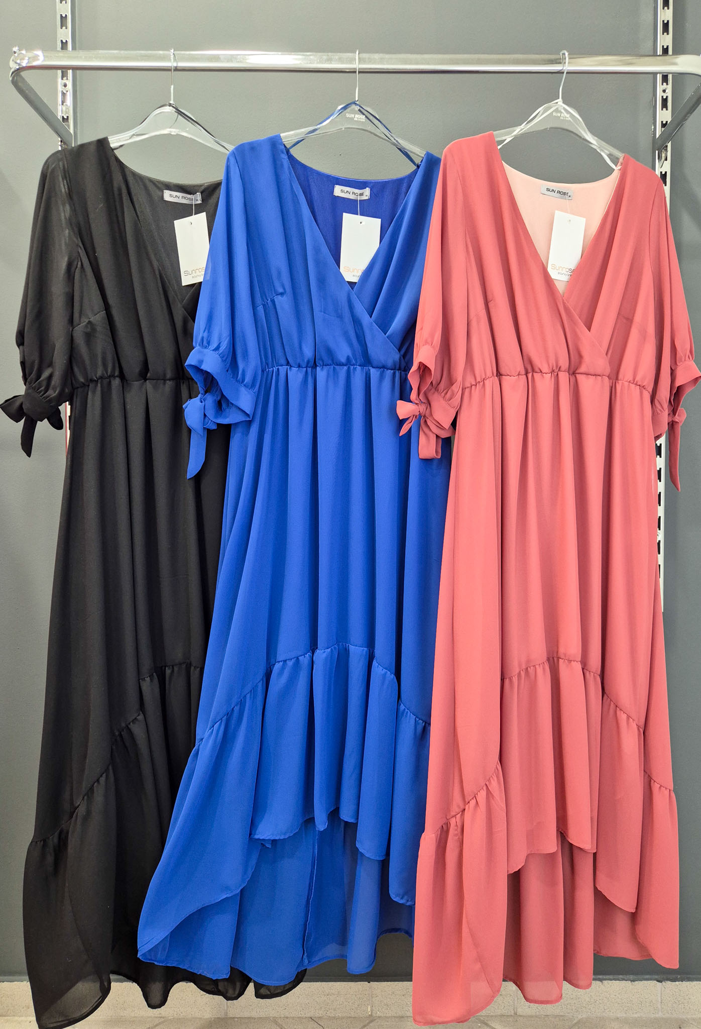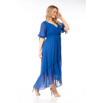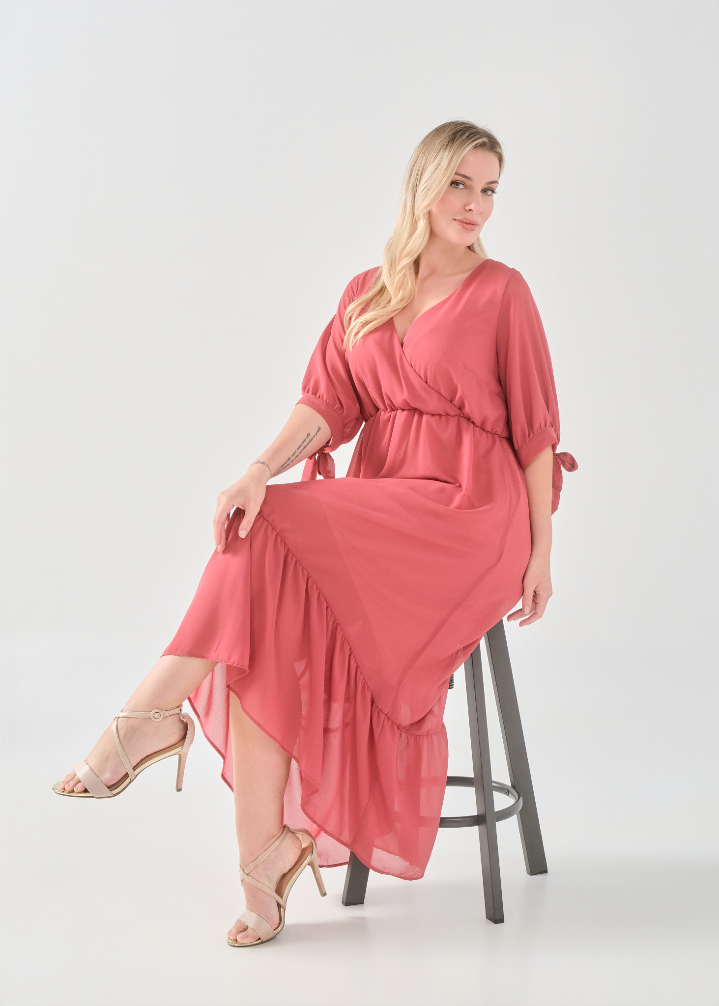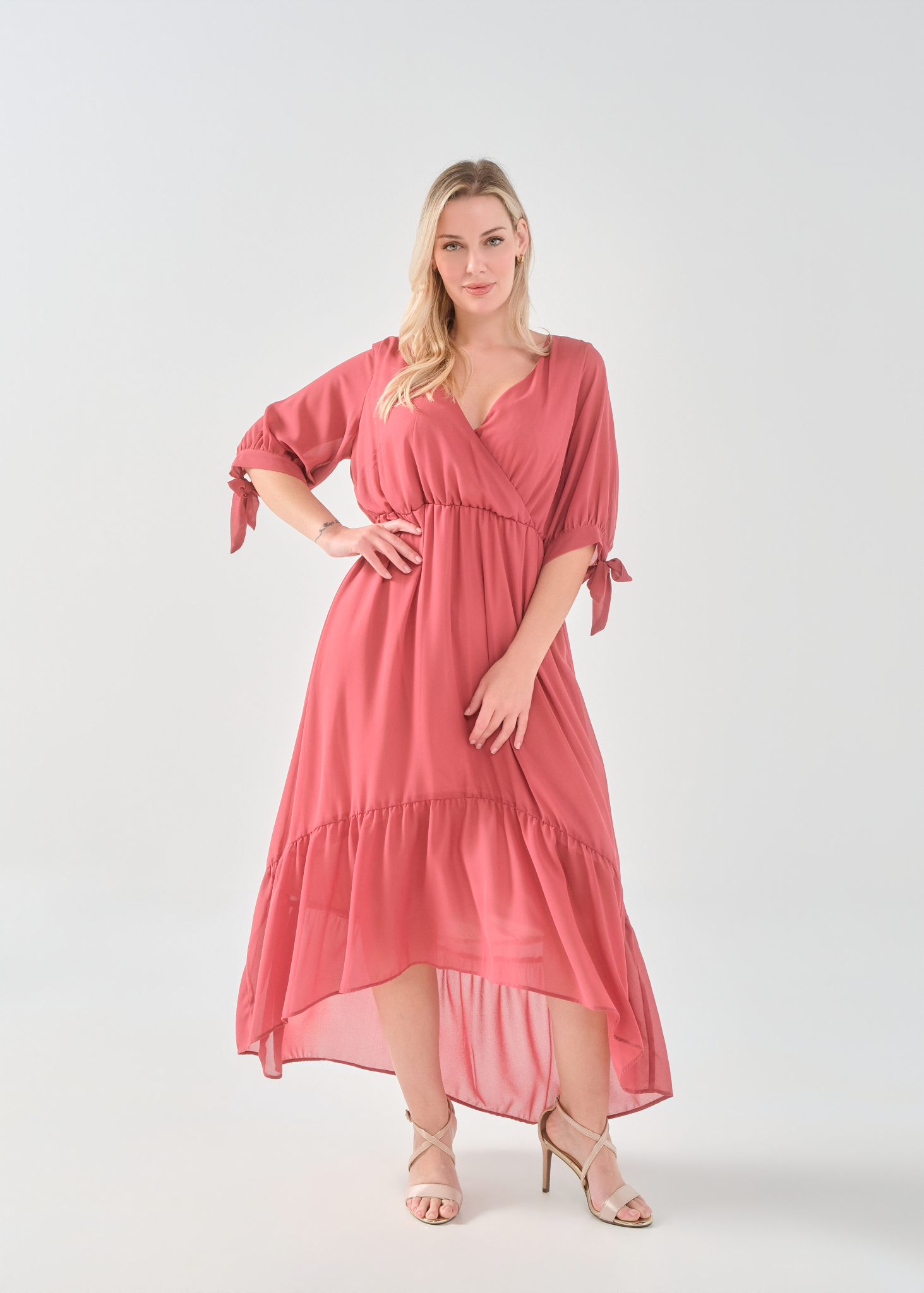 Φόρεμα μάξι μουσελίνα, κρουαζέ ντεκολτέ, μανίκια με φάσα και δέσιμο, ελαφρύ μικρό λάστιχο στη μέση για καλύτερη εφαρμογή, άνιση φούστα με διακριτικό βολάν, σε πολύ άνετη γραμμή