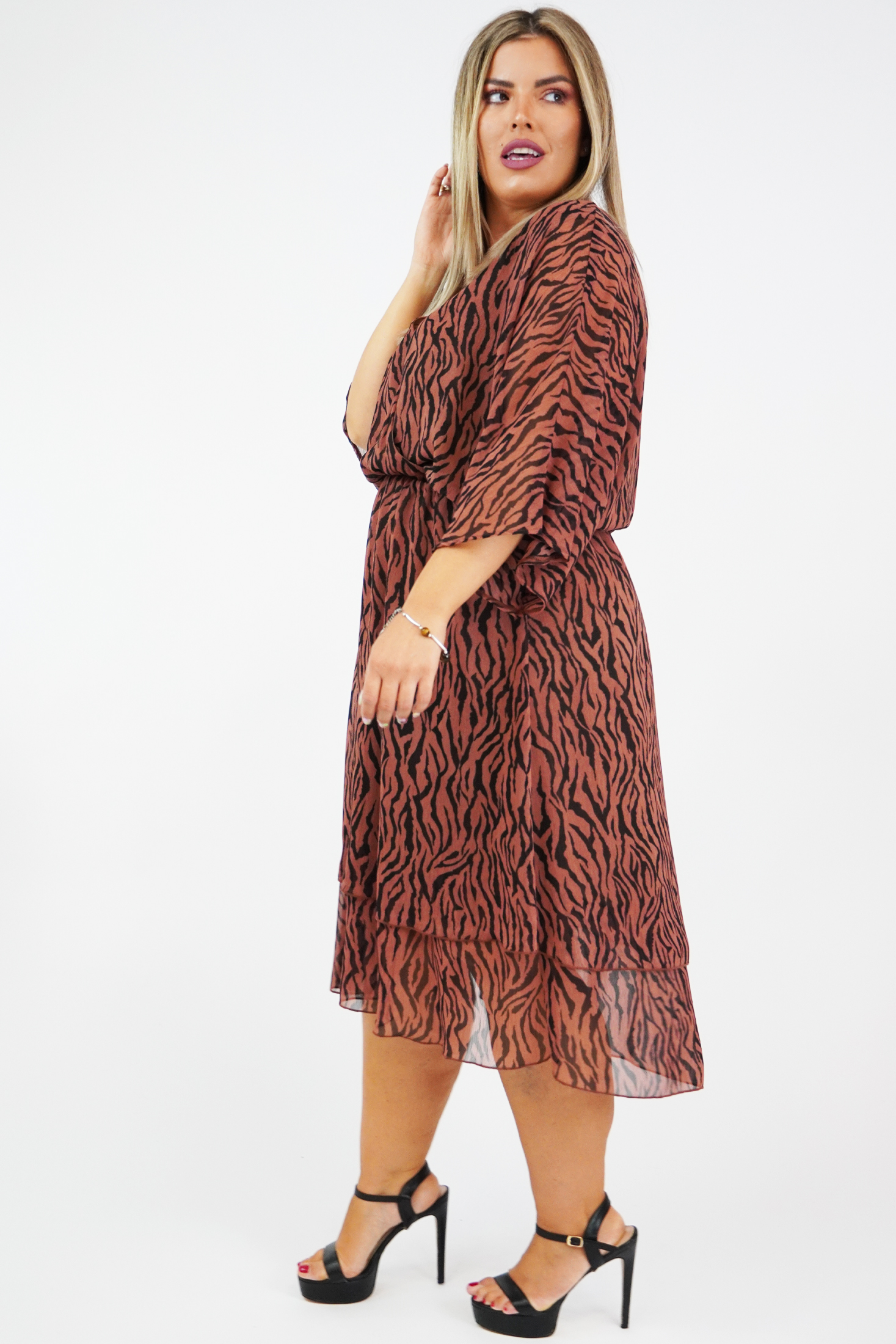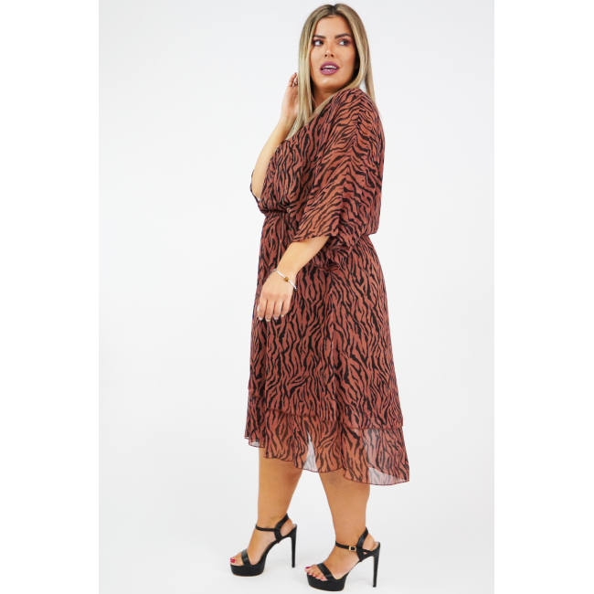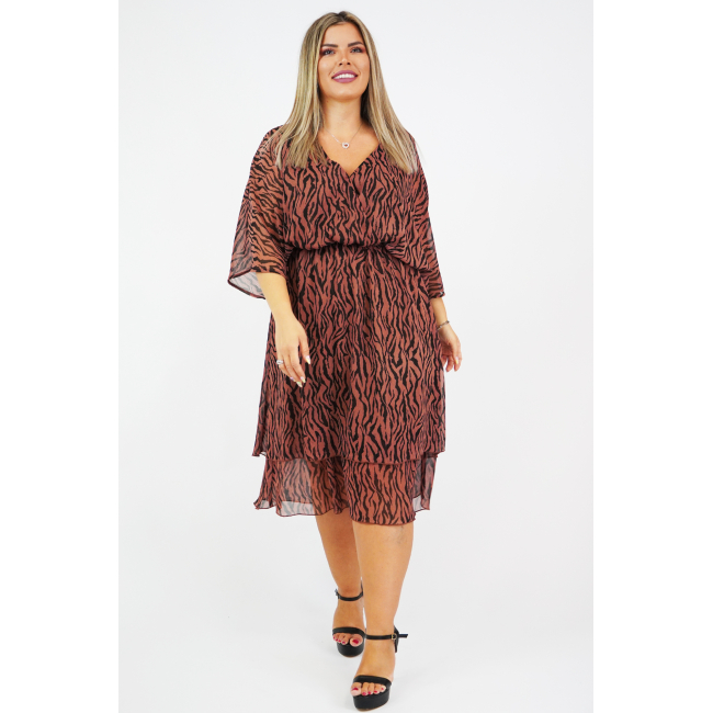 Φόρεμα Μουσελίνα εμπριμέ αδιάφανη γκοφρέ μίντι, V κρουαζέ ντεκολτέ, ζαπονέ μανίκια, διακριτικό λάστιχο στη μέση για καλύτερη εφαρμογή, σε Α άνετη γραμμή η φούστα