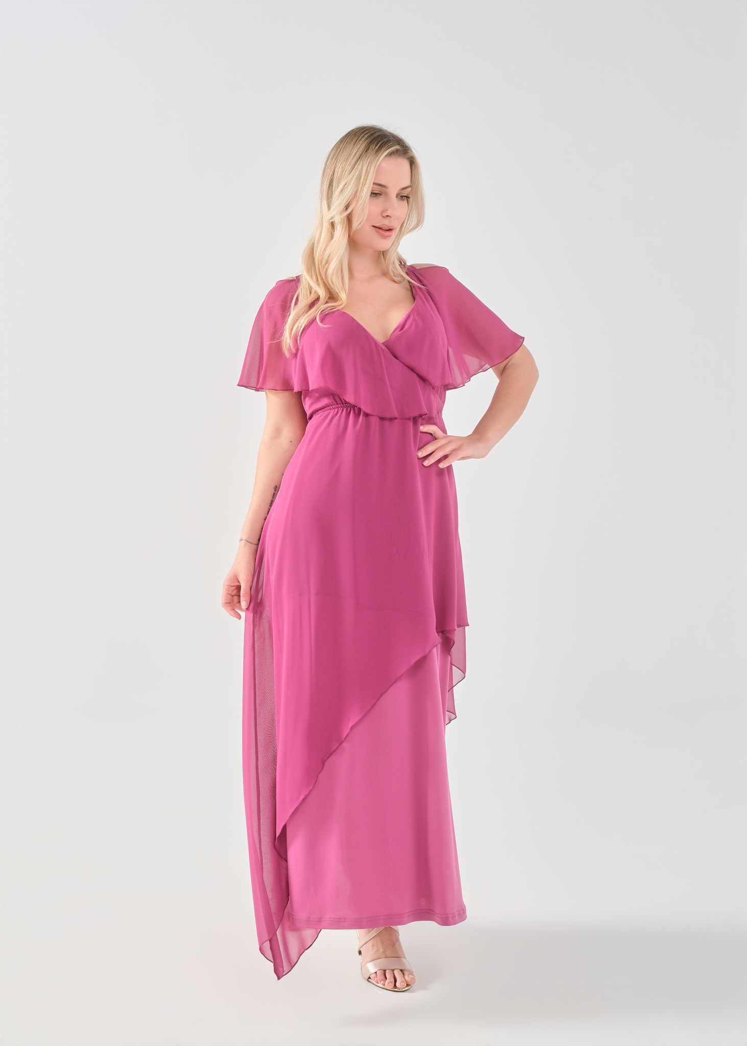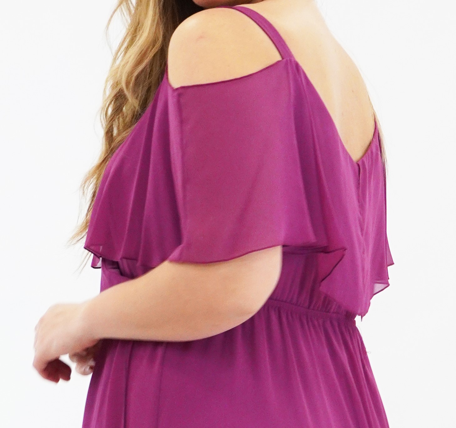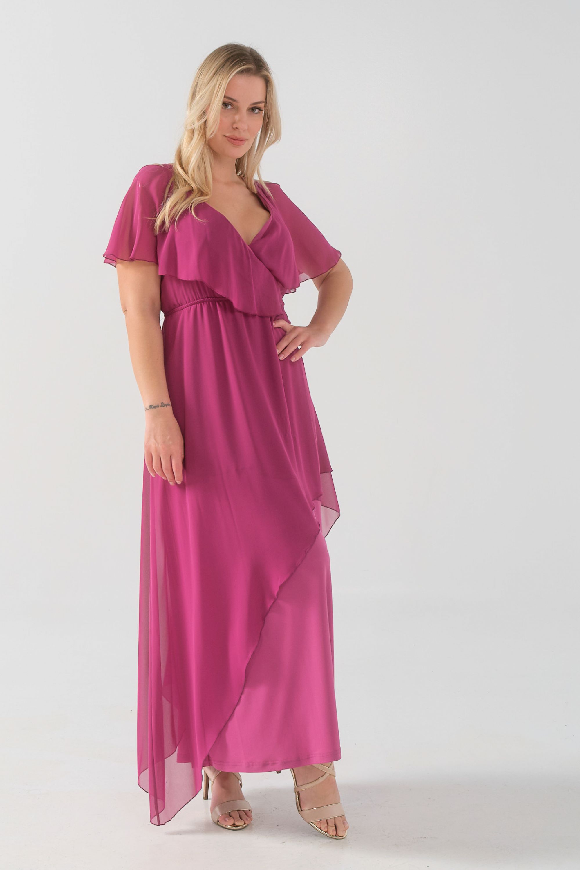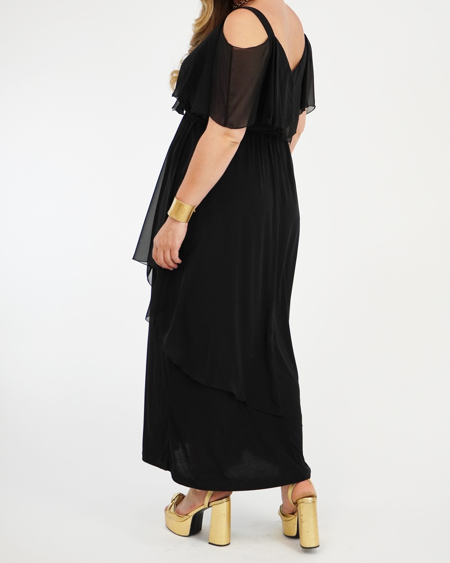 Φόρεμα μάξι Μουσελίνα εξωτερικά, κρουαζέ αμπίρ μπούστο, off shoulder ζαπονε μανίκια, Jersey φούστα σε Α άνετη γραμμή