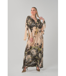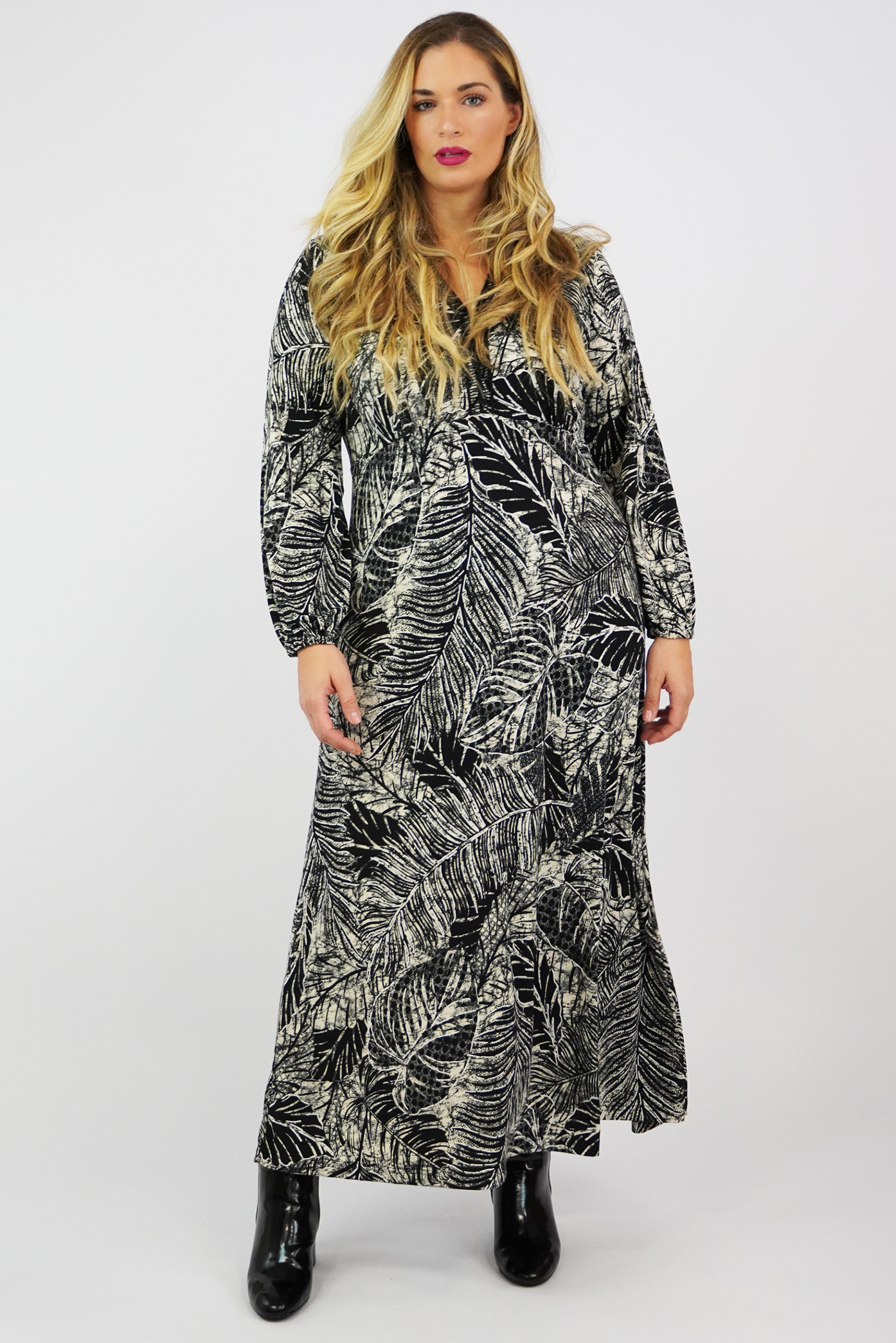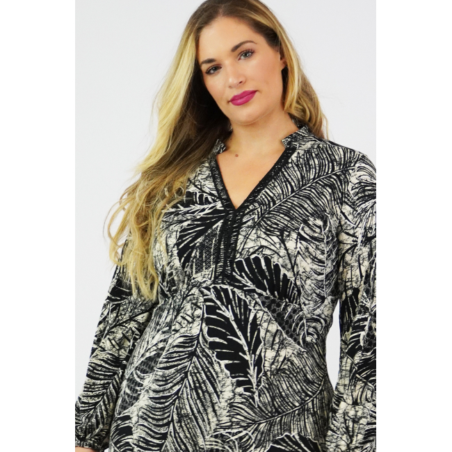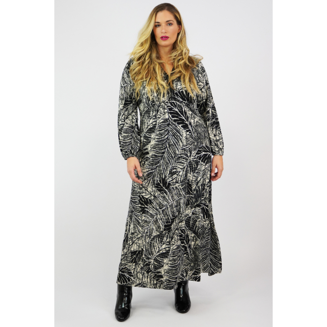 Φόρεμα μάξι Bubble Crep εμπριμέ, Μάο γιακά με V ντεκολτέ και διακοσμητική τρέσσα, διακριτική ραφή στη μέση, μανίκια με μανσέτα, σε Α πολύ άνετη γραμμή