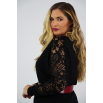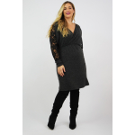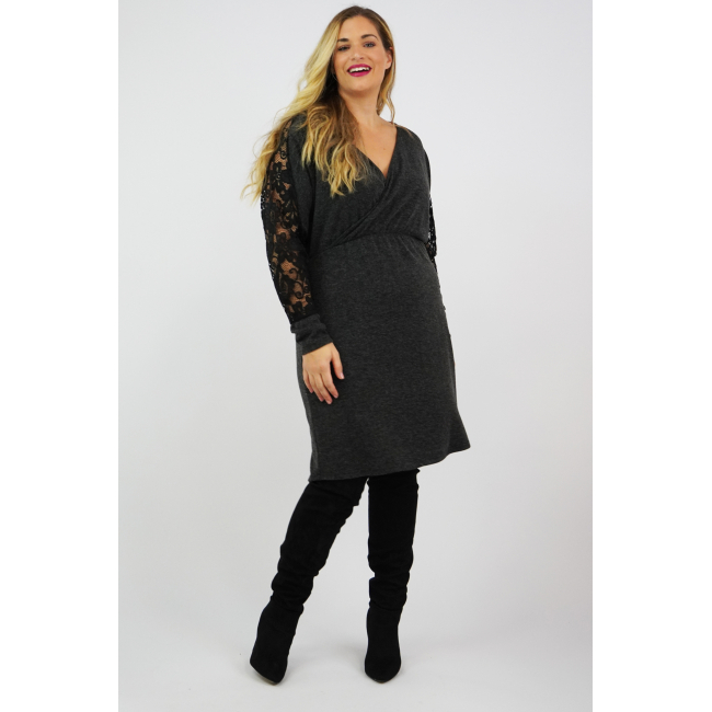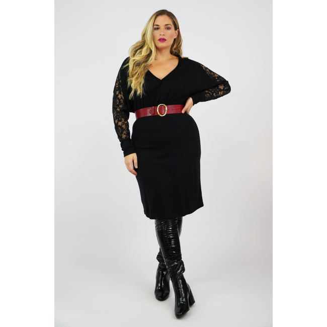 Φόρεμα μίντι, πλεκτό κοπής/ραφής, V ντεκολτέ κρουαζέ, ελαφρύ λάστιχο στη μέση για δημιουργεία Ambir, ζαπονέ μανίκια δαντέλα και μανσέτα στο ίδιο πλεκτό, σε ίσια πολύ άνετη γραμμή