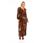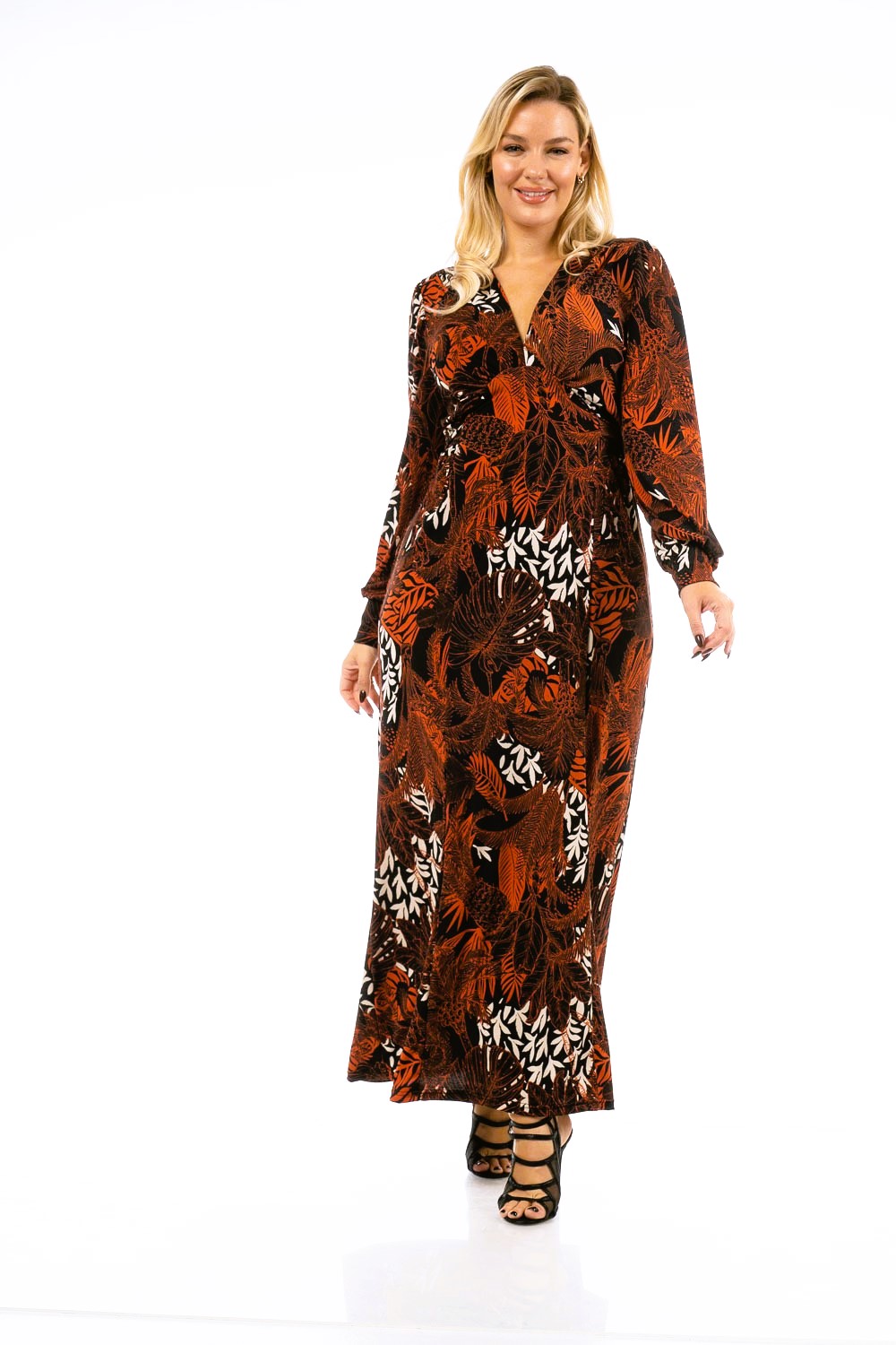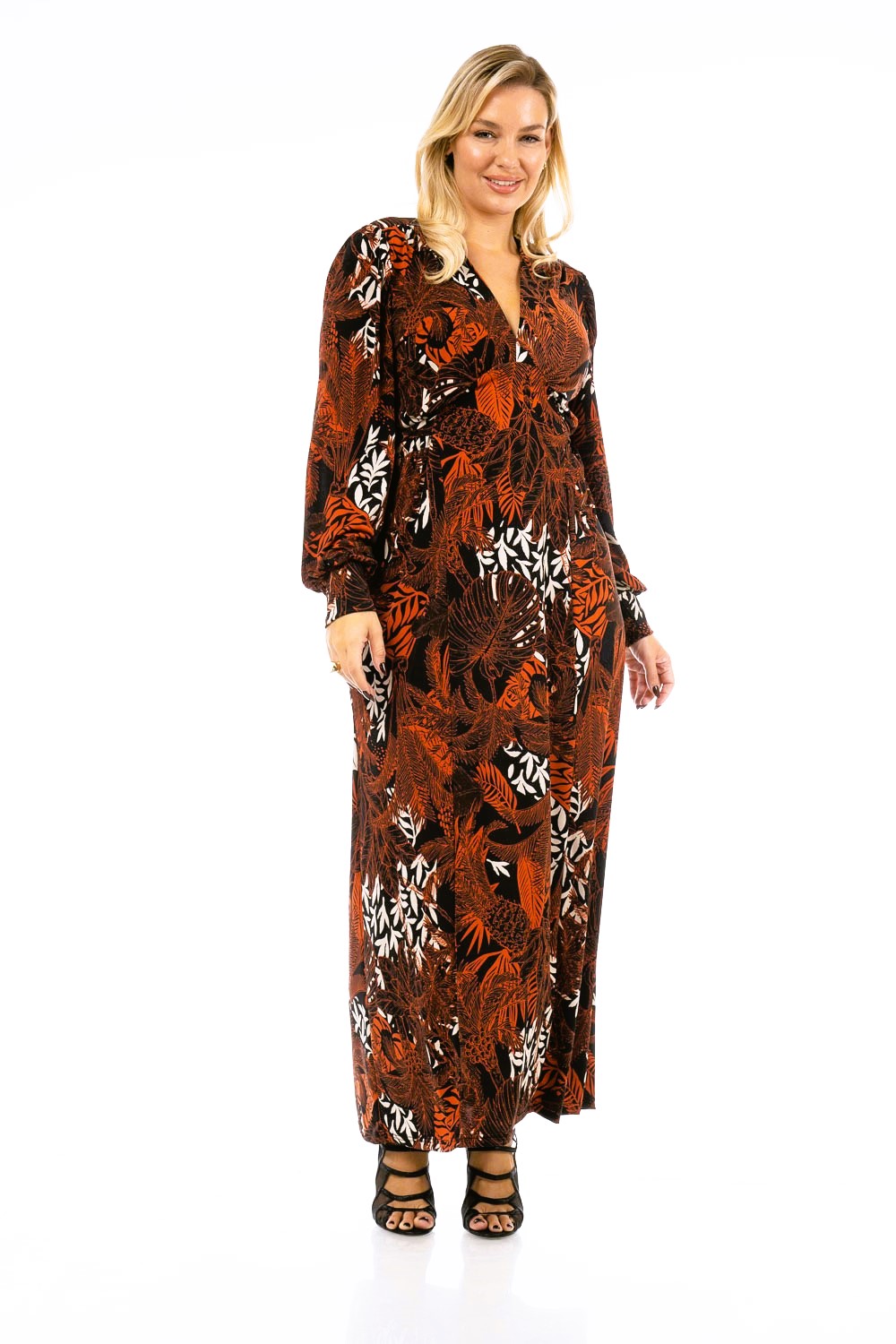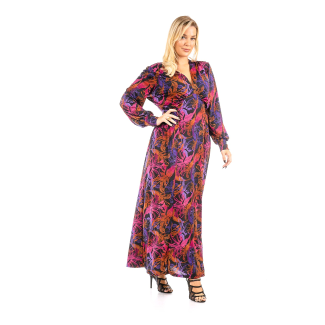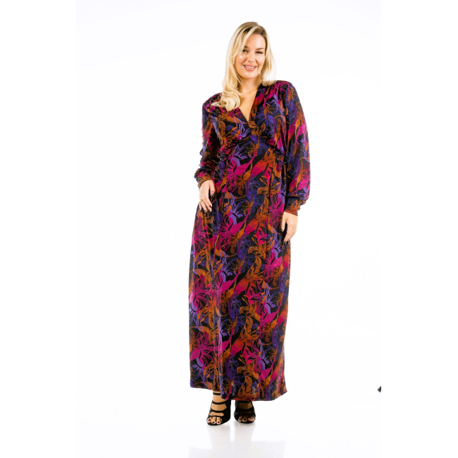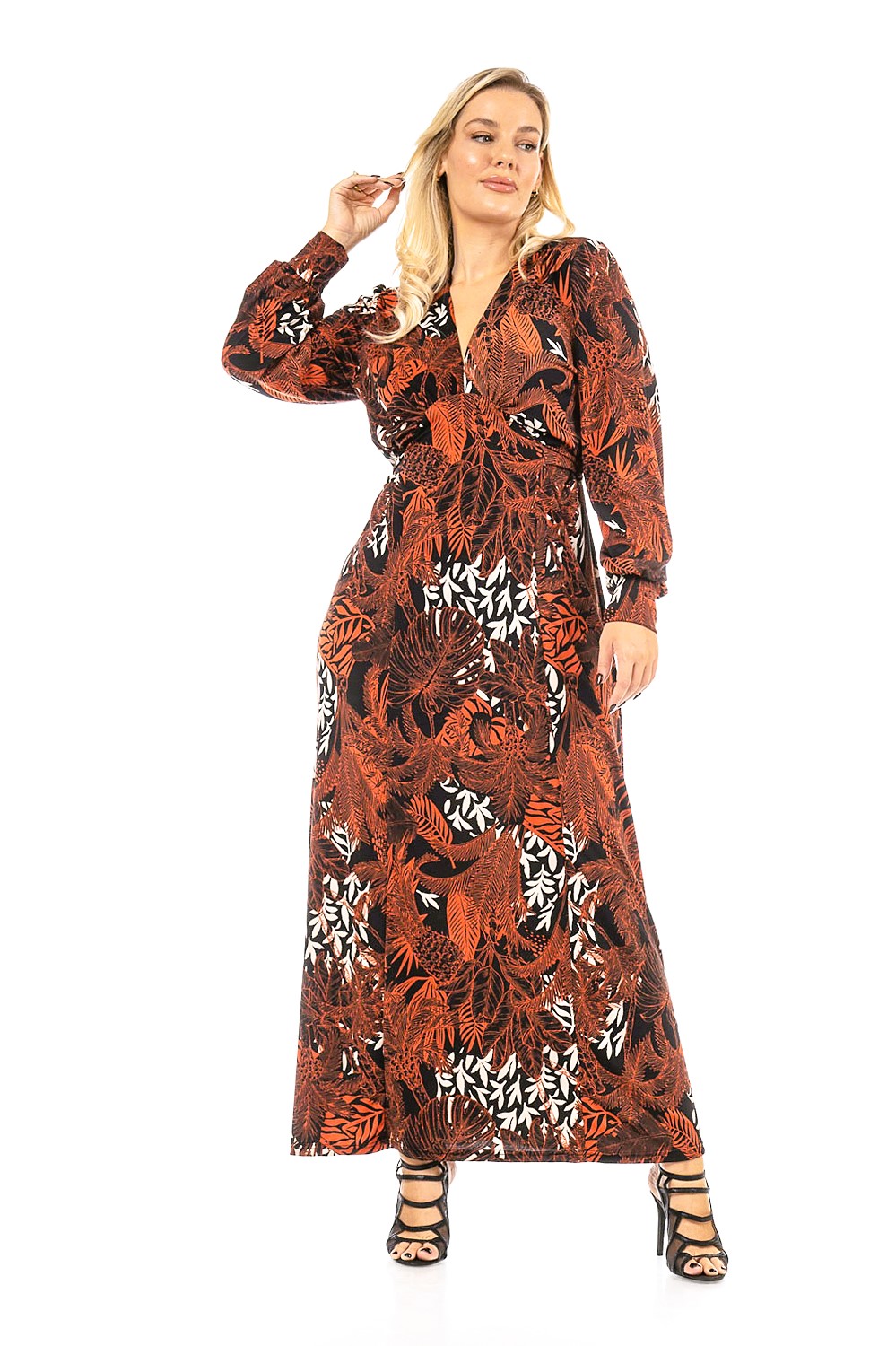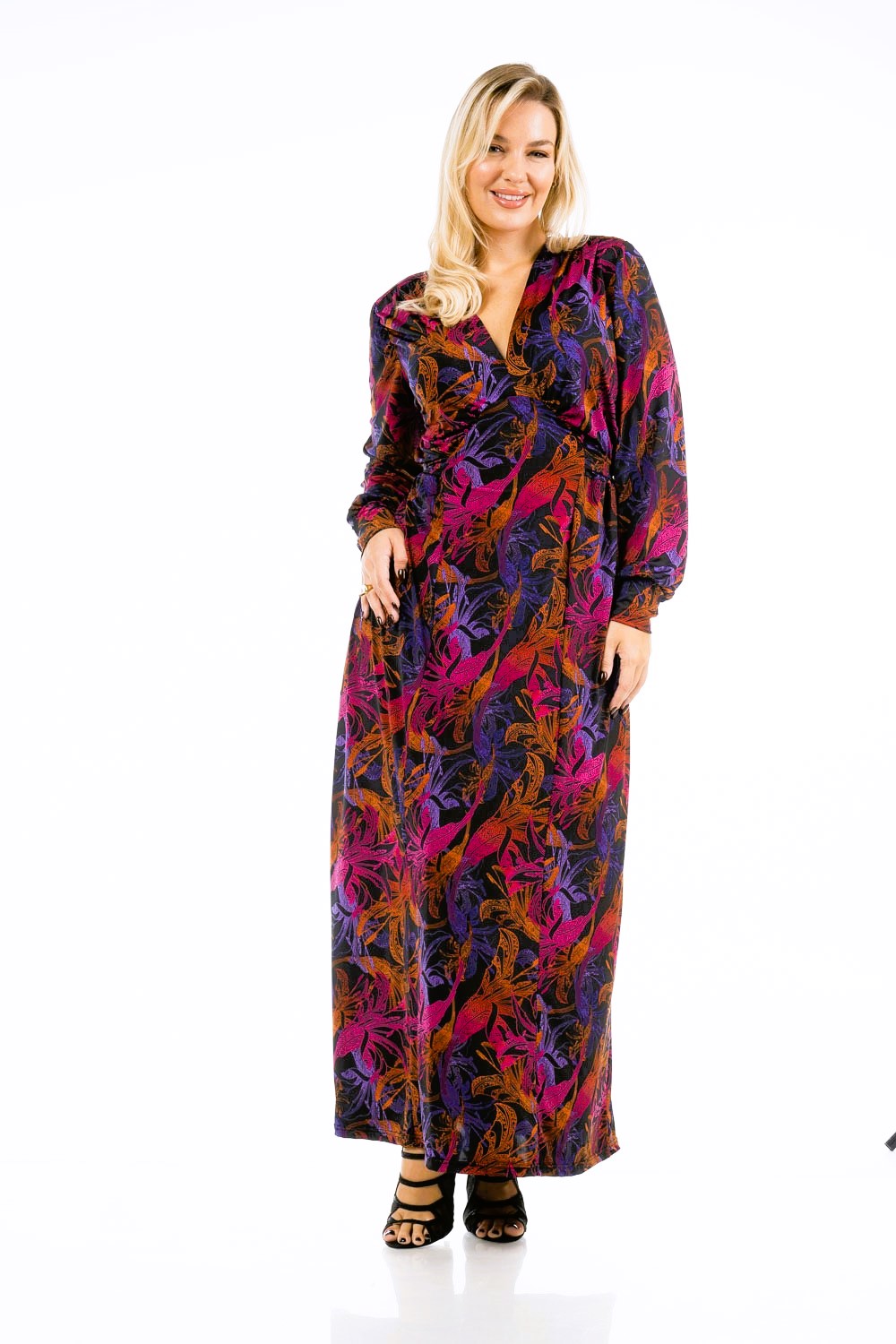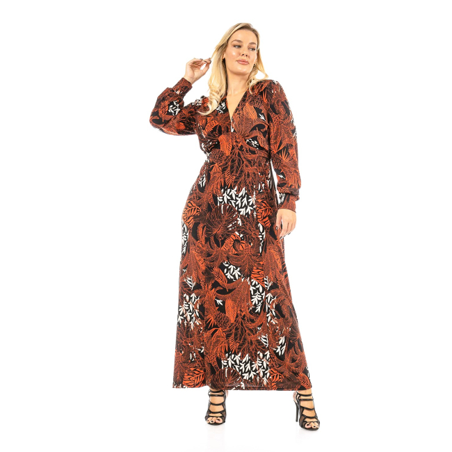 Φόρεμα μάξι εμπριμέ, ελαστικό ύφασμα, ιδιαίτερο V ντεκολτέ, ενσωματωμένο ζωνάκι για δημιουργία μεσάτου, μανίκια με μανσέτα, σε Α πολύ άνετη γραμμή