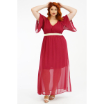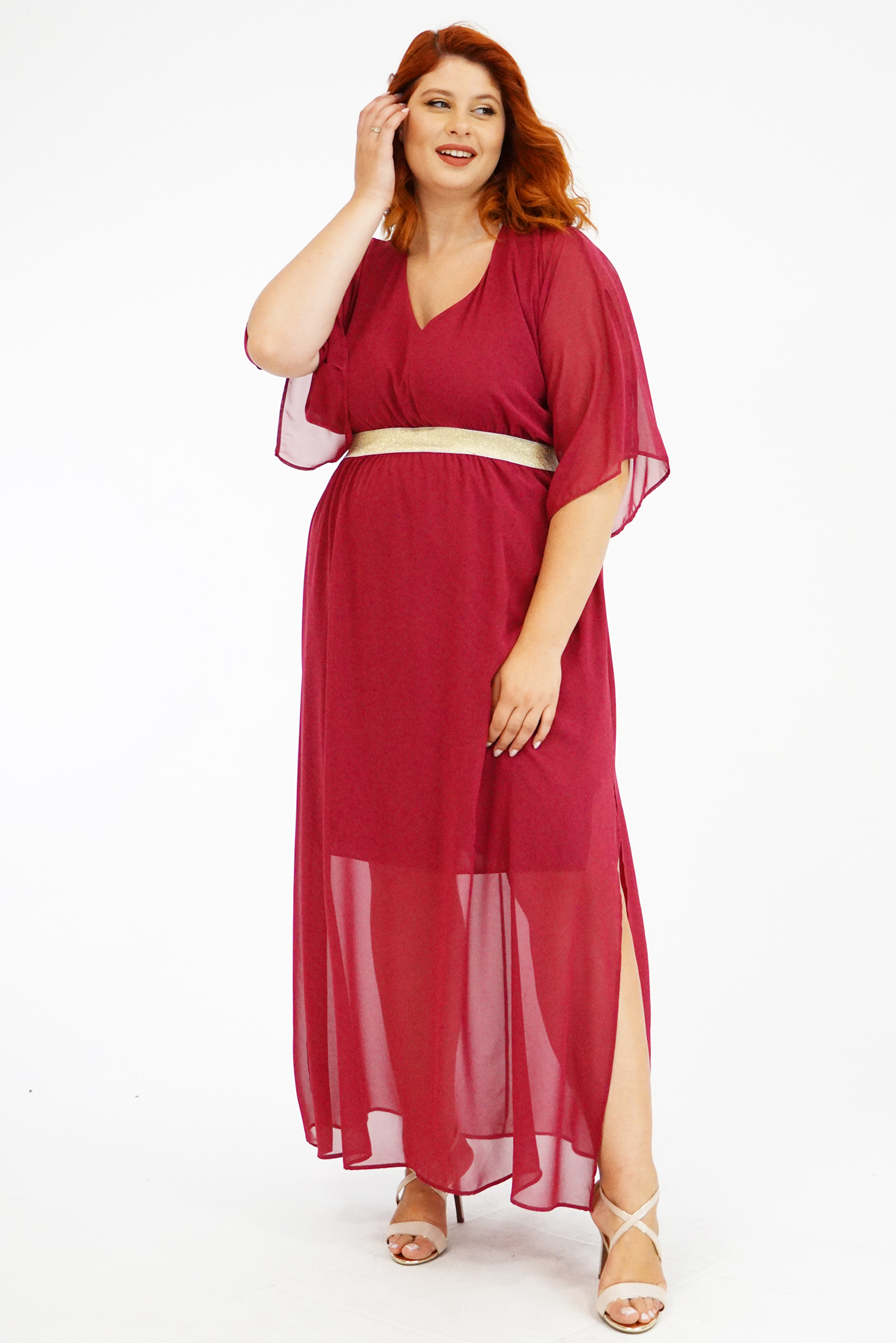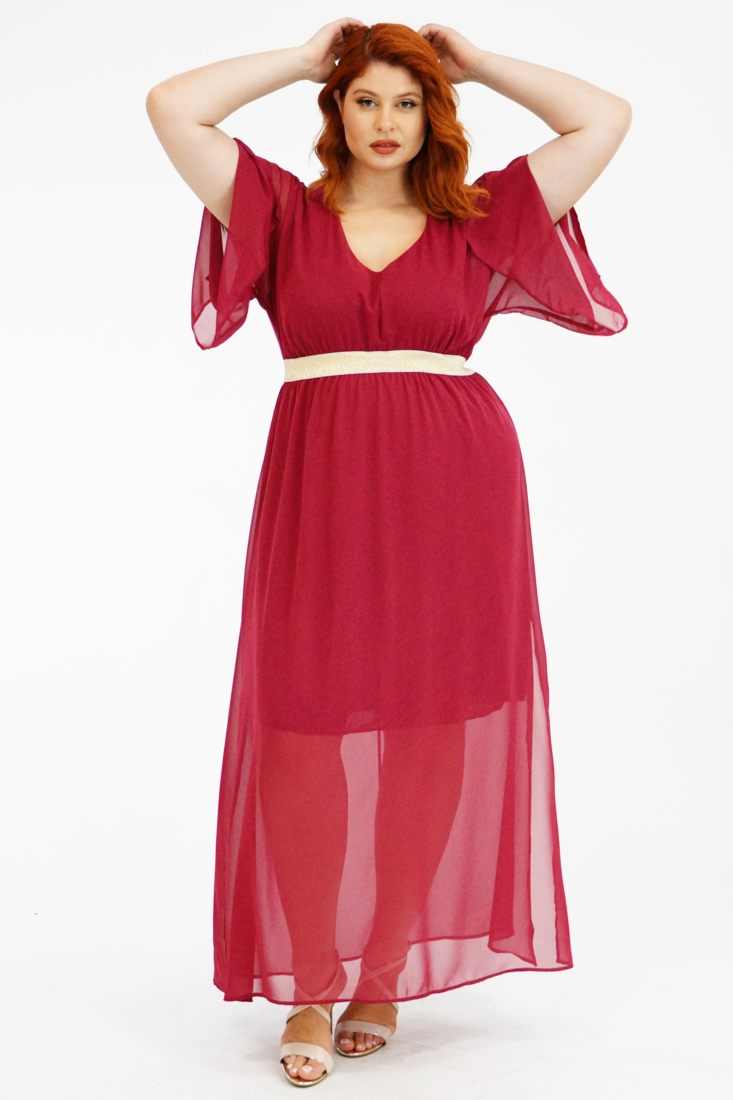 Φόρεμα μάξι, σε μουσελίνα, V ντεκολτέ, ενιαία τετράγωνα μανίκια με σκίσιμο, ελαφρύ χρυσό λάστιχο στη μέση ως ζώνη, ενσωματωμένη φόδρα, σε Α ανετη γραμμή.