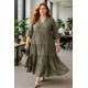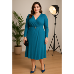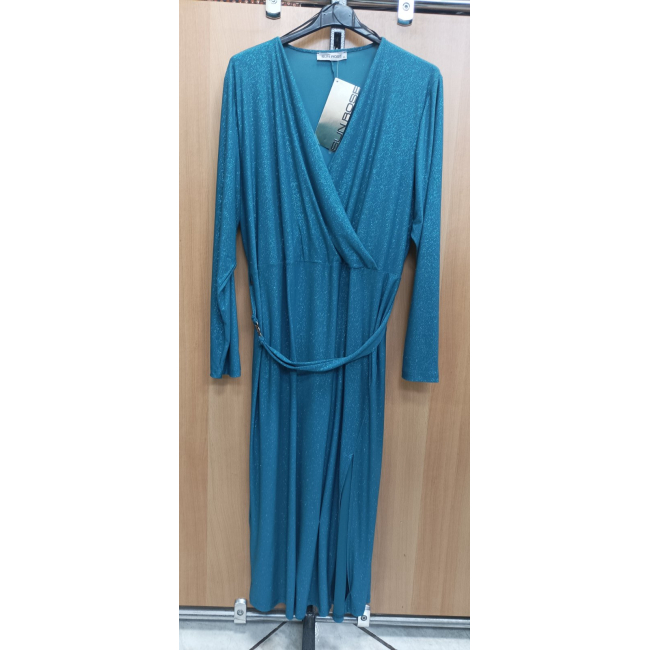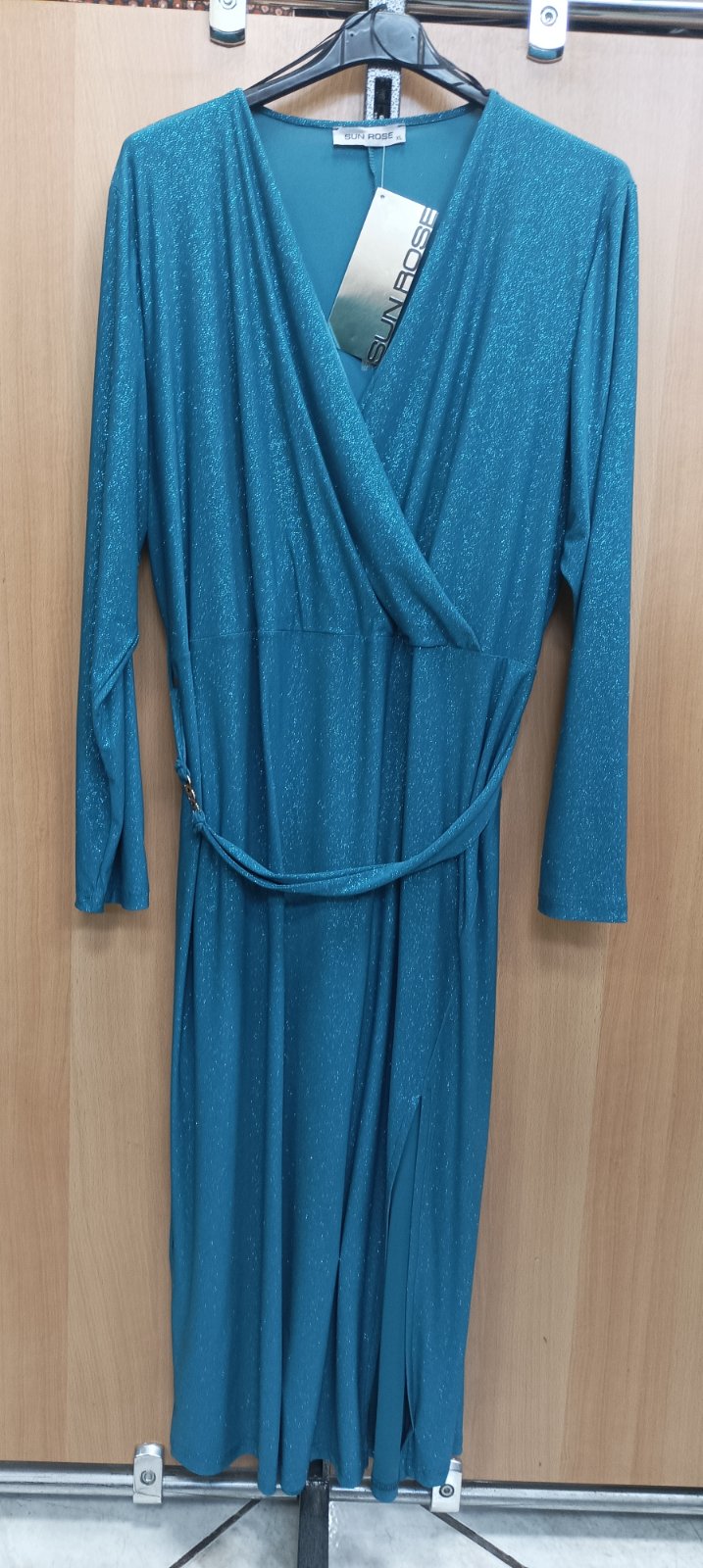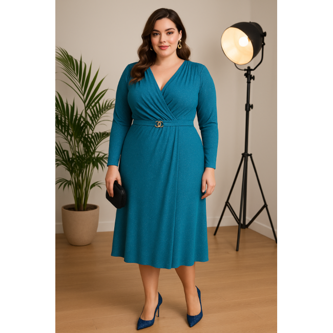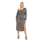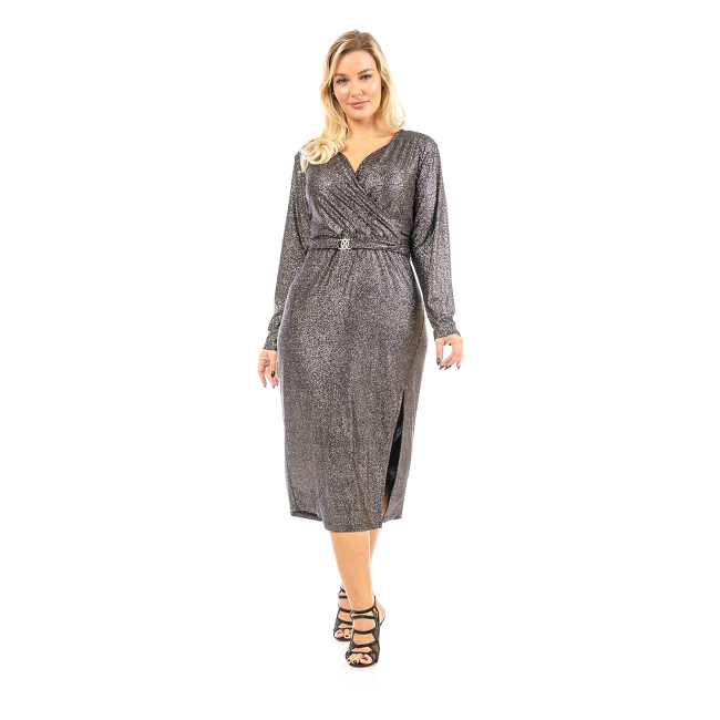 Φόρεμα μίντι σε "glitter" ελαστικό ύφασμα, κρουαζέ μπούστο, διακριτική ραφή στη μέση, θυλάκια στη μέση με ζώνη του ίδιου υφάσματος με αγκράφα, φούστα σε ίσια πολύ άνετη γραμμή με σκίσιμο στην αριστερή πλευρά.