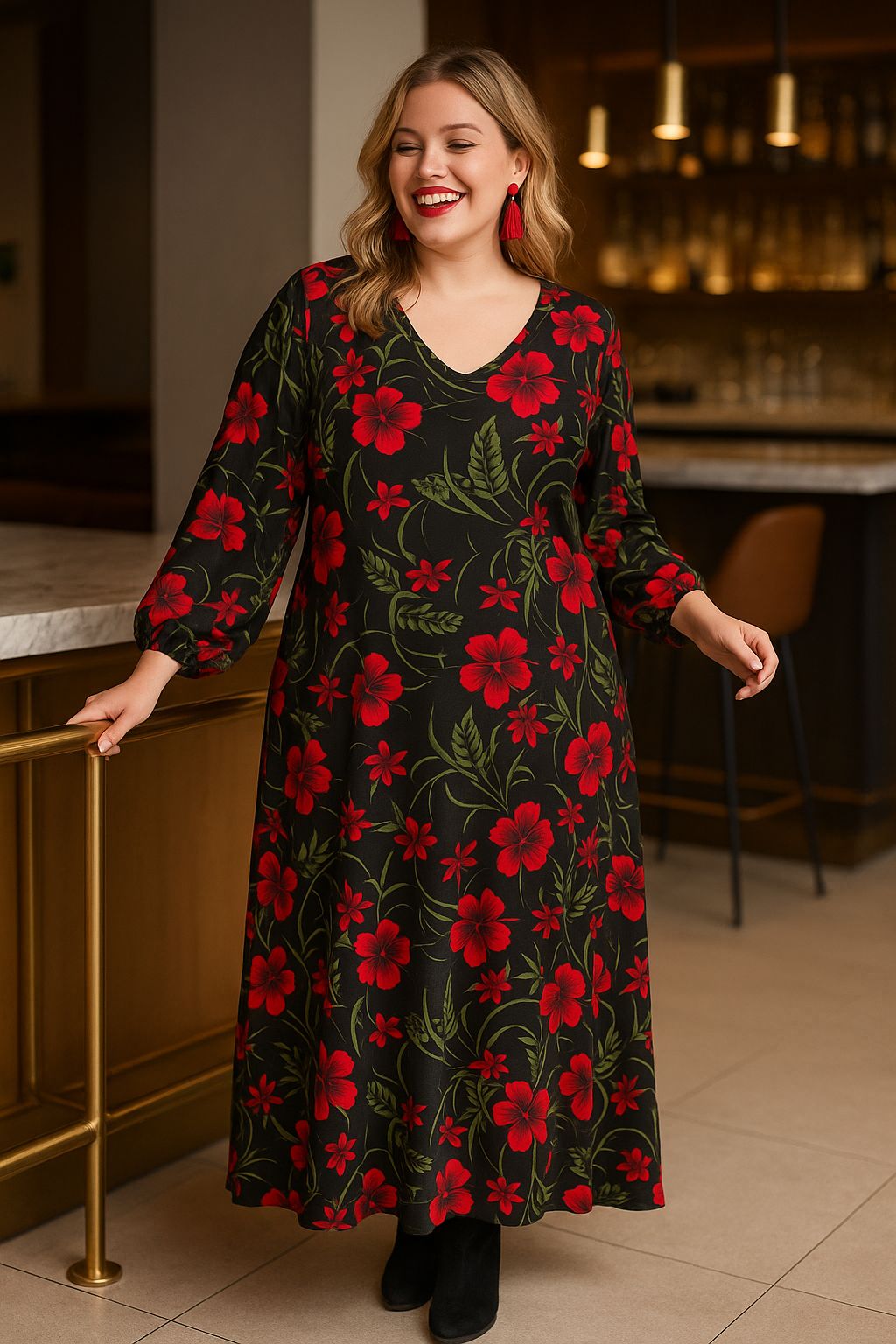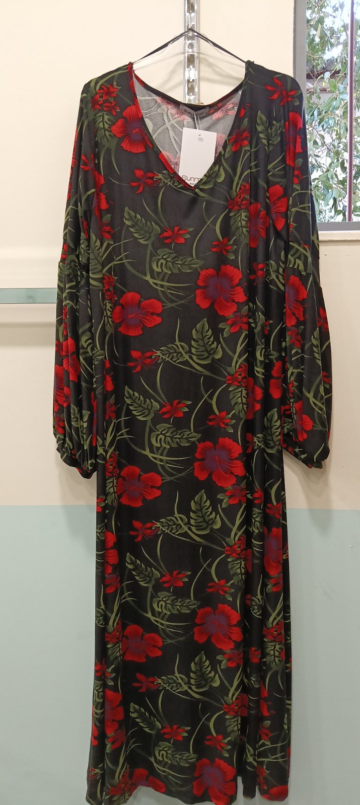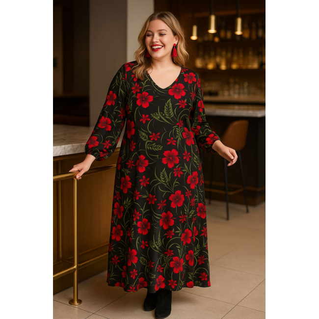 Μάξι Φόρεμα σε υπέροχο εμπριμέ Viscose ύφασμα με πέλος, ελαστικό, V ντεκολτέ, μανίκια με λάστιχο στο τελείωμά τους, σε Α πολύ άνετη γραμμή
