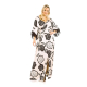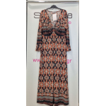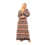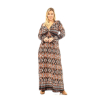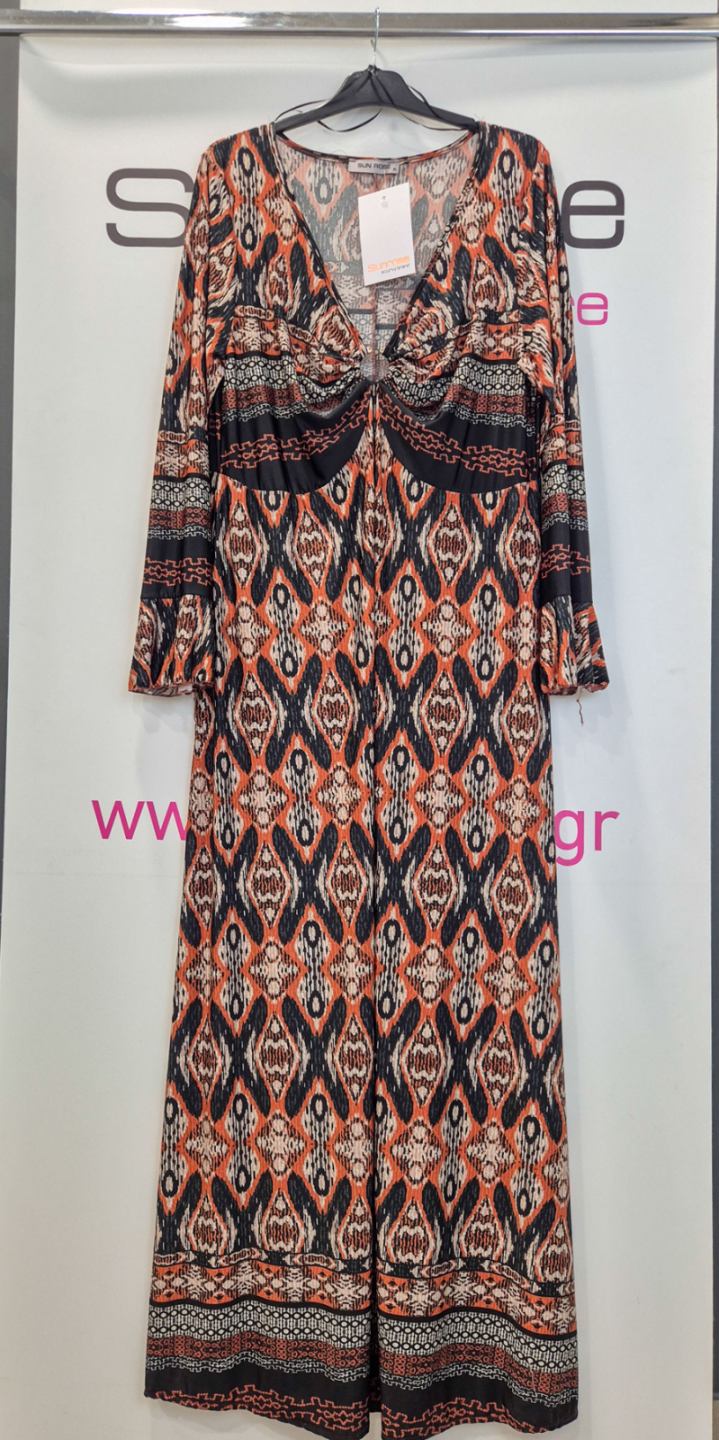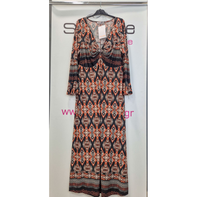 Φόρεμα μάξι σε Jersey ελαστικό εμπριμέ ύφασμα, V ντεκολτέ με διακοσμιτικό κρίκο, διακριτική ραφή κάτω από το μπούστο για την ανάδειξή του, off shoulder, σε Α πολύ άνετη γραμμή
