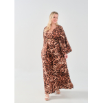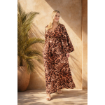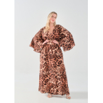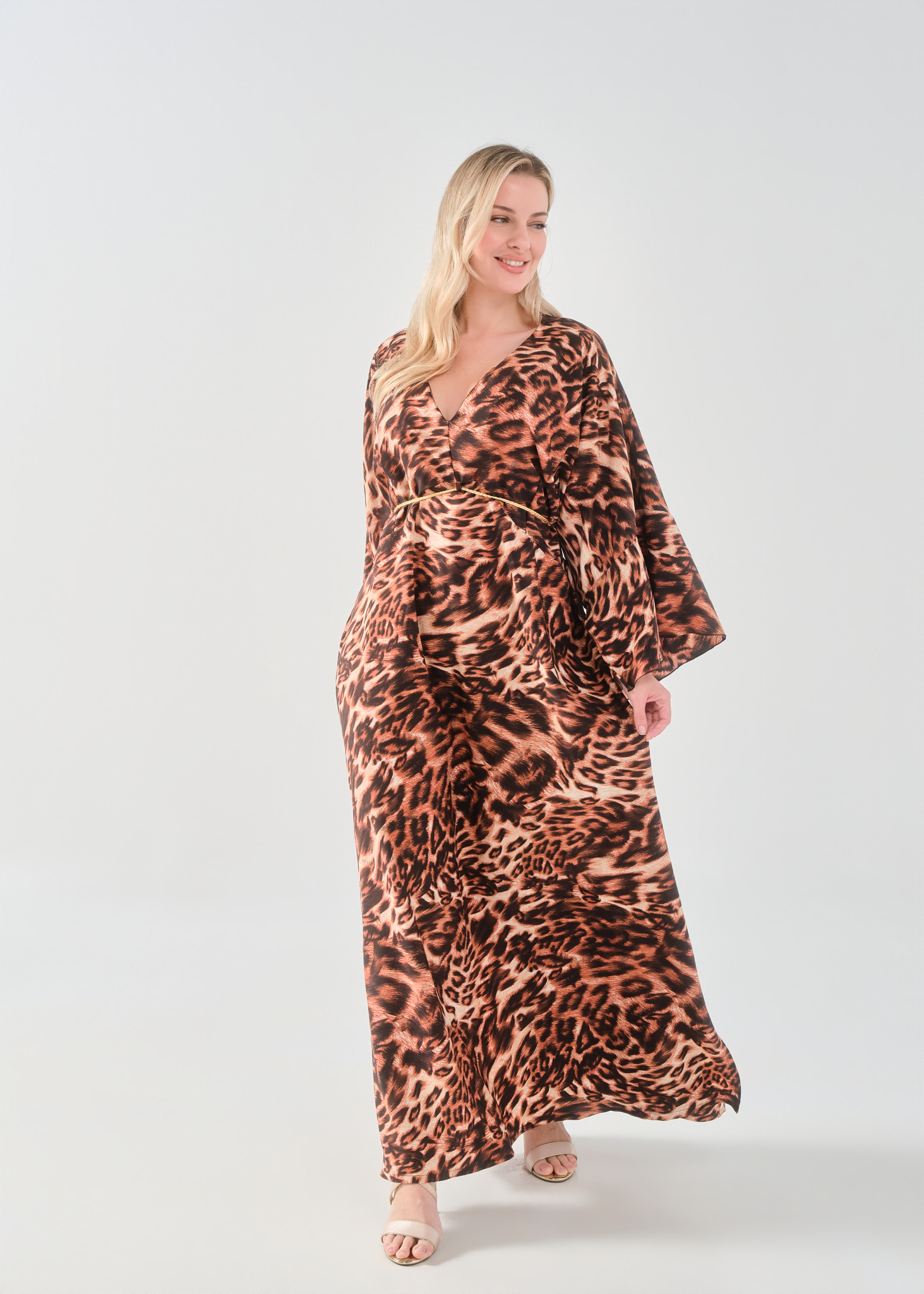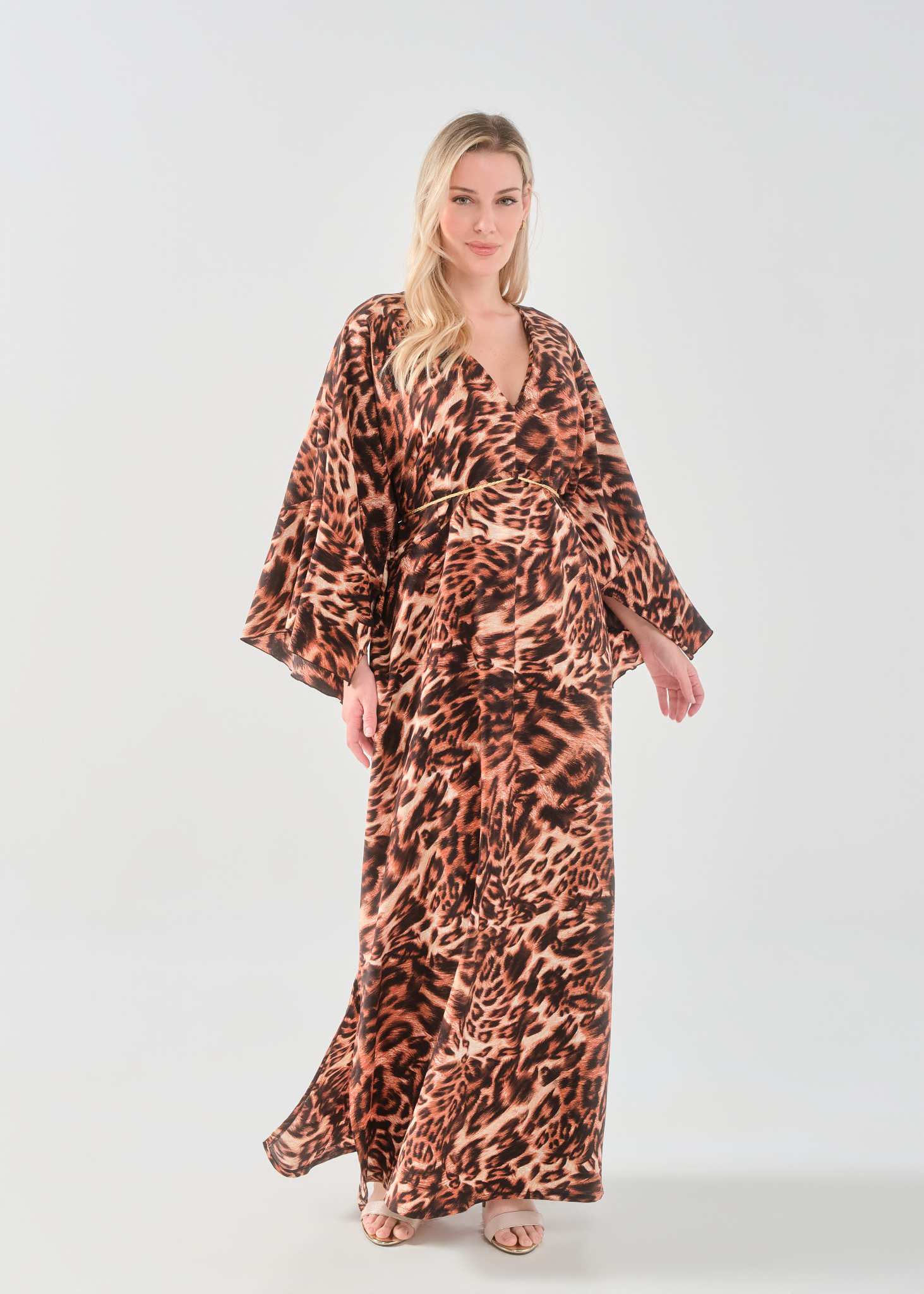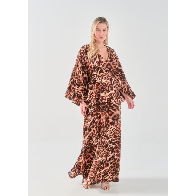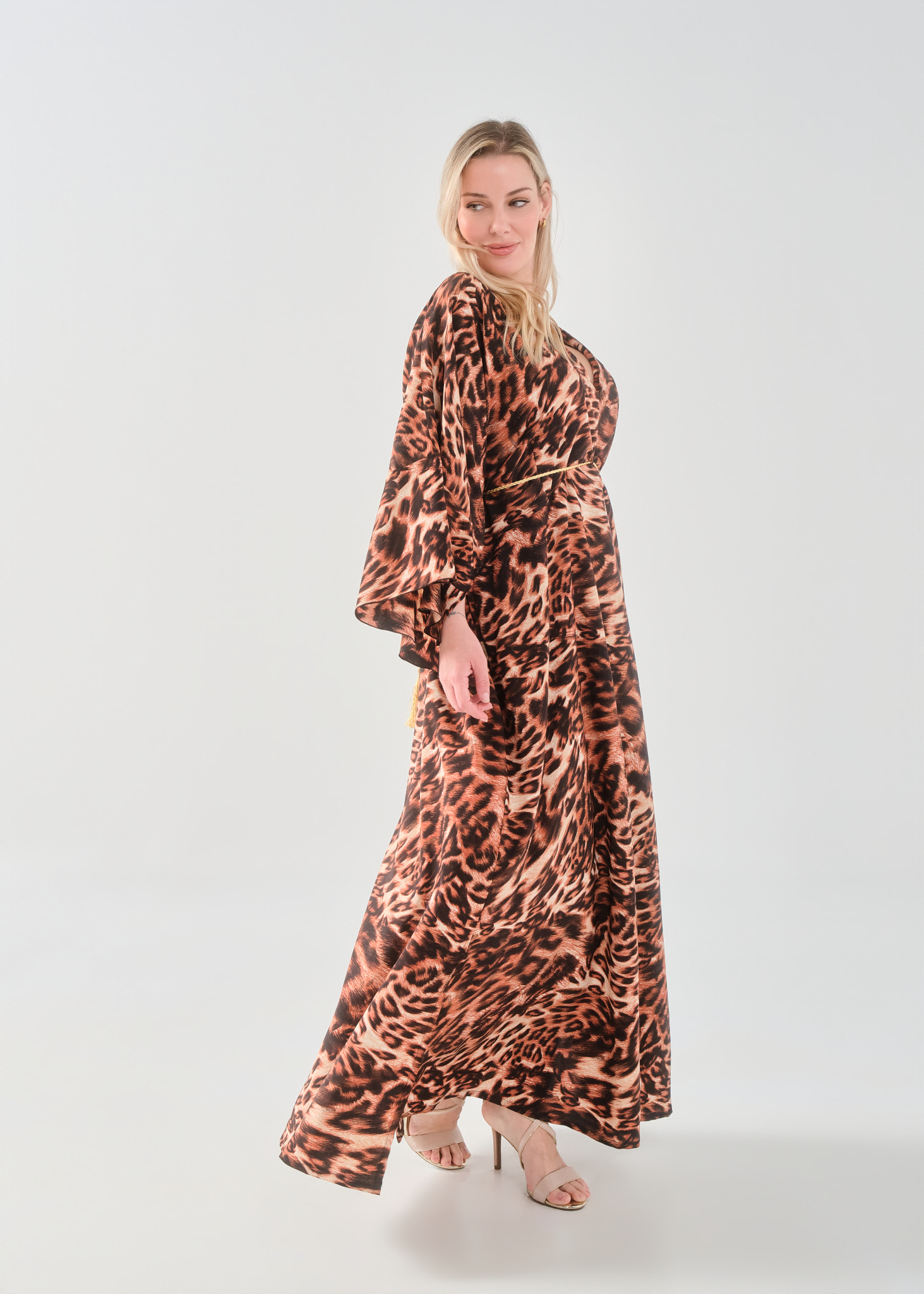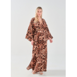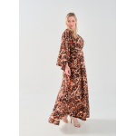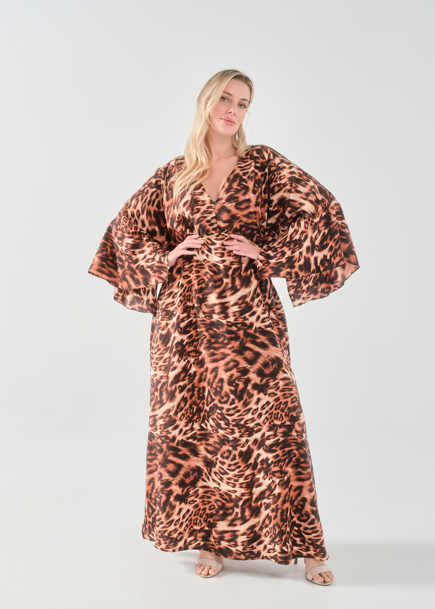 Cocktail Μάξι Φόρεμα σε σατέν ατσαλάκωτο ύφασμα "τύπου καφτάνι", V ντεκολτέ με διακριτική ράφη κάτω από το στήθος και χρυσό κορδόνι που δένει προαιρετικά. Μανίκια ελεύθερα με μικρό βολάν, σε Α πολύ άνετη γραμμή.