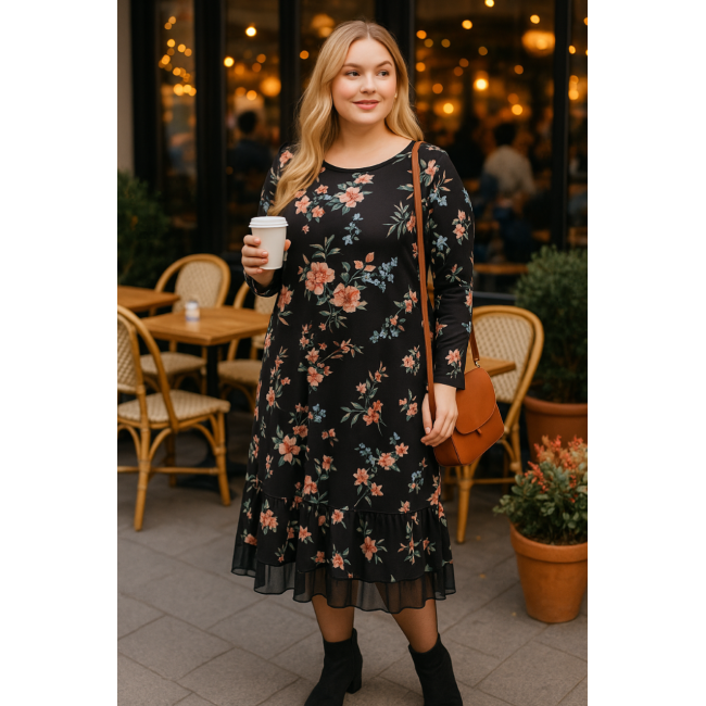 Φόρεμα μίντι εμπριμέ σε winter jersey ύφασμα στρογγυλή λαιμόκοψη εμπρός & πίσω, σε Α γραμμή και με διακριτικό τούλι (για την τσαχπινιά) στο τελείωμά του