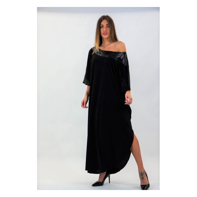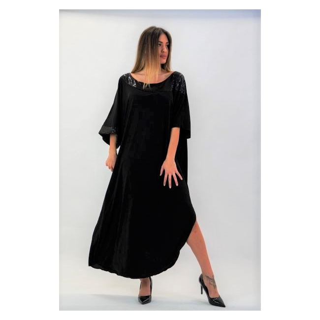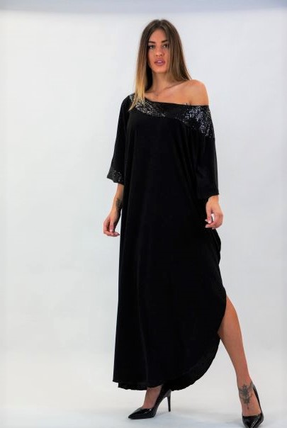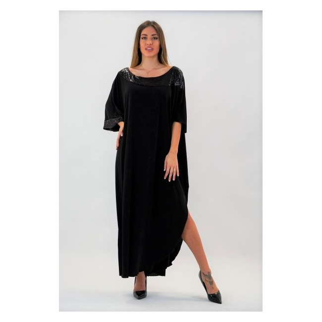 Φόρεμα μάξι Jersey ύφασμα, oversize & one size "τύπου καφτάνι", ανοιχτή λαιμόκοψη με παγιέτα λεπτομέρια, ζαπονέ τρουακάρ μανίκια, σε πολύ άνετη γραμμή