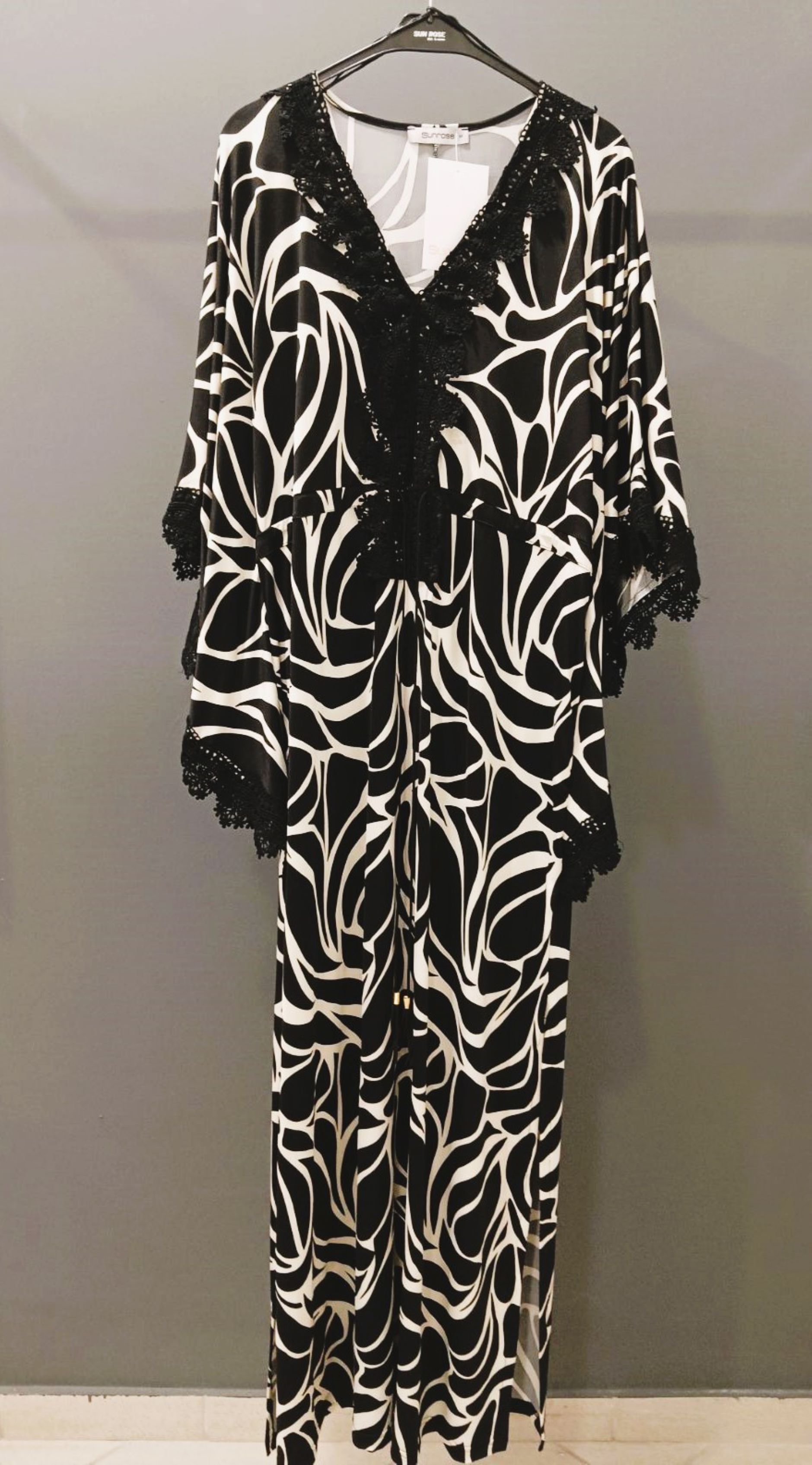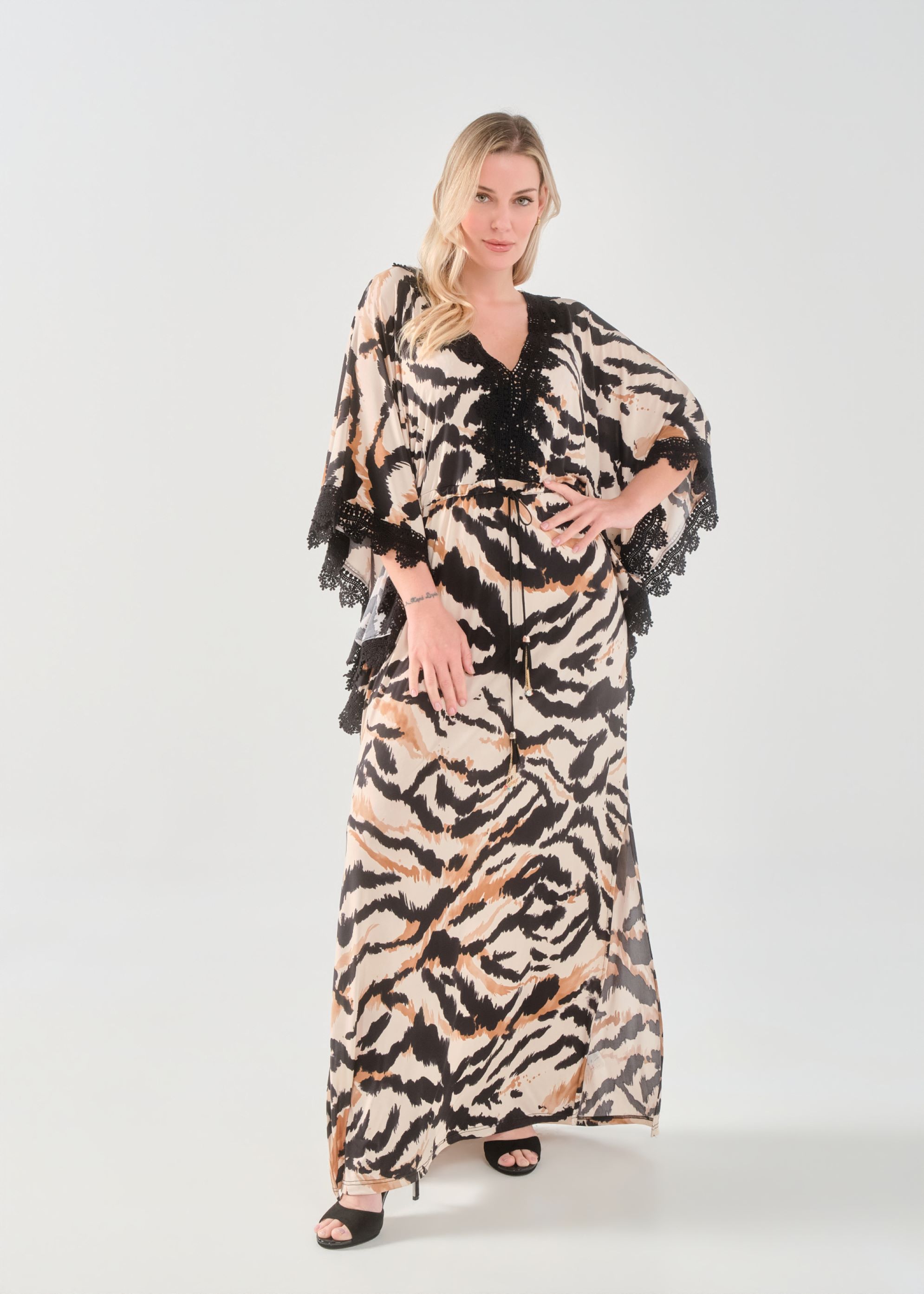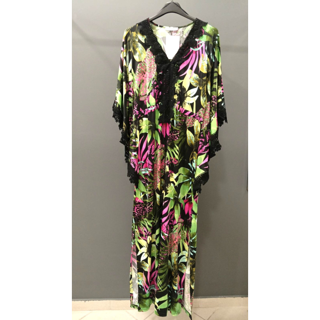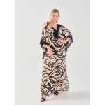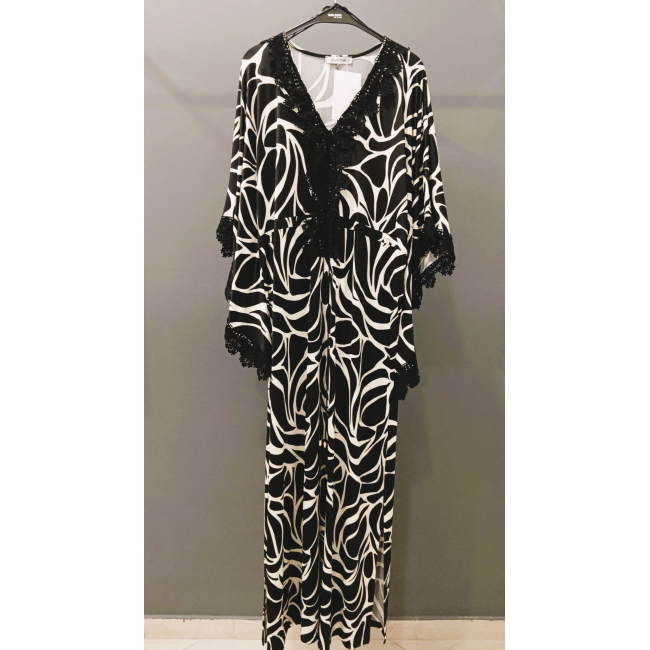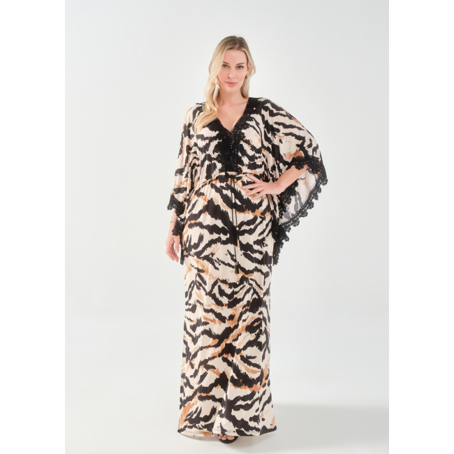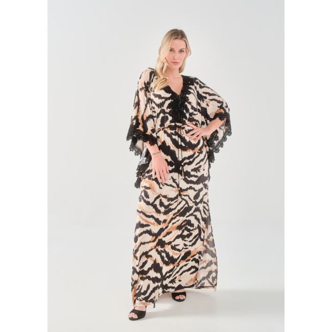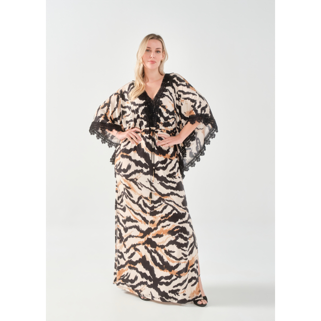 Φόρεμα/Tουνίκ τύπου "Καφτάνι", Oversize σε Jersey εμπριμέ ύφασμα, V ντεκολτέ με δαντέλα τρέσσα, ελεύθερα μανίκια με δαντέλα τρέσσα στο τελείωμά τους, ενσωματωμένη "τούνελ" ζώνη, διακριτικό σκίσιμο στα πλαϊνα, σε ίσια πολύ άνετη γραμμή.