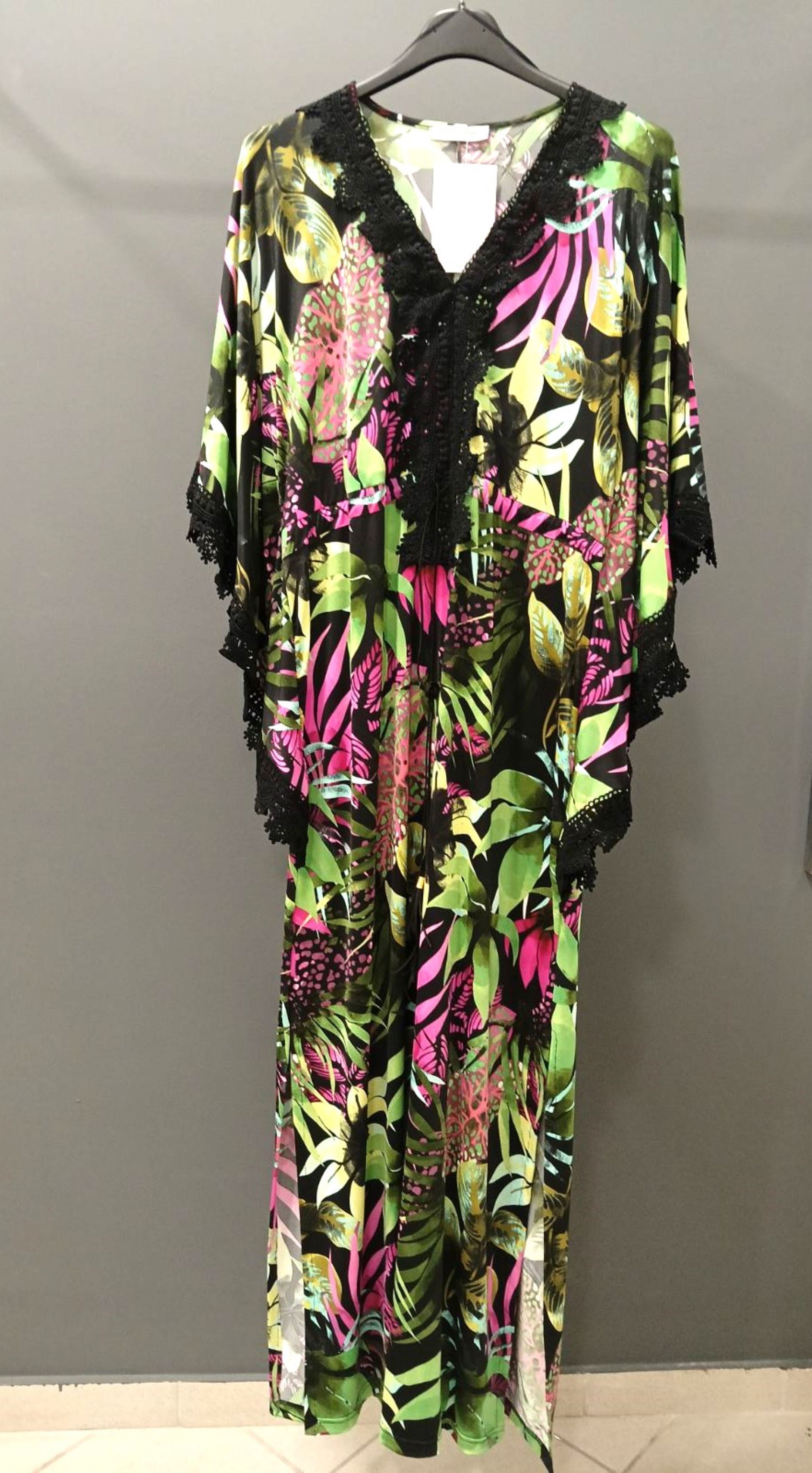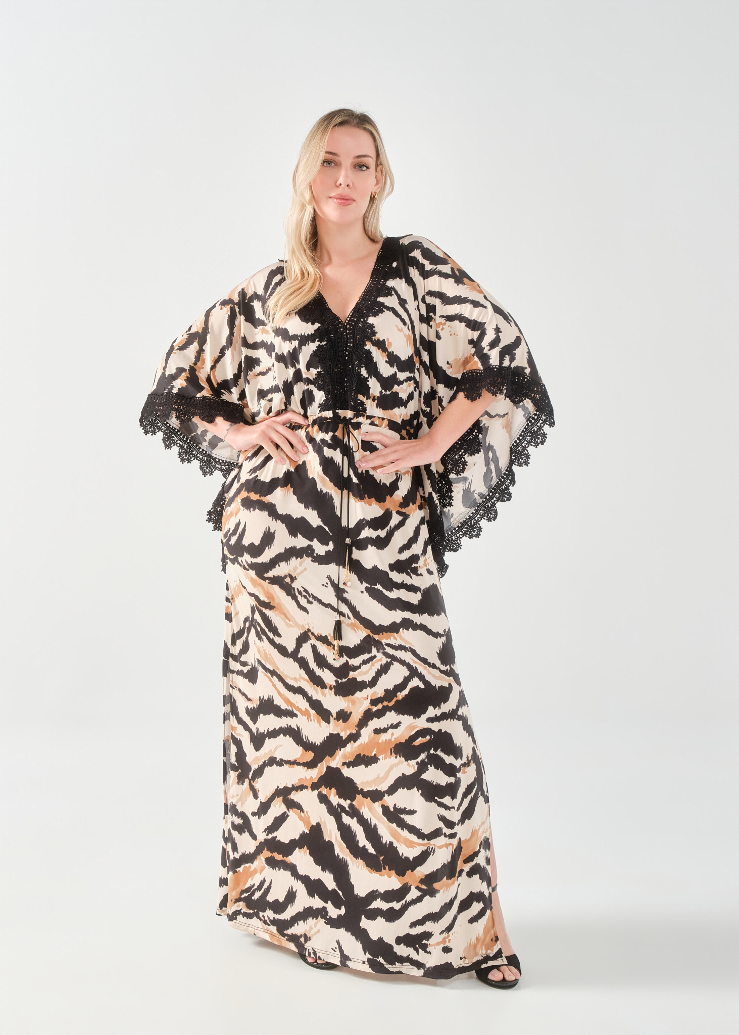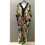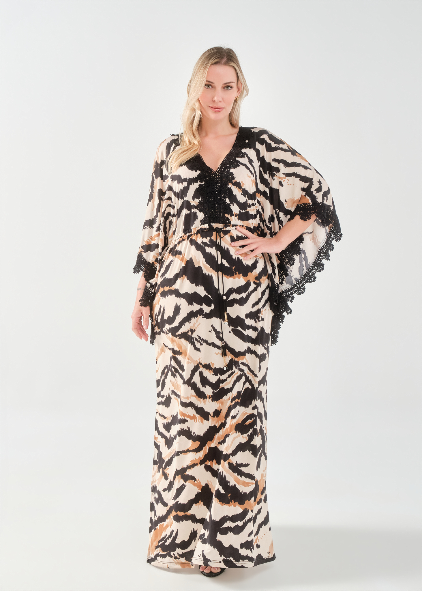 Φόρεμα/Tουνίκ τύπου "Καφτάνι", Oversize σε Jersey εμπριμέ ύφασμα, V ντεκολτέ με δαντέλα τρέσσα, ελεύθερα μανίκια με δαντέλα τρέσσα στο τελείωμά τους, ενσωματωμένη "τούνελ" ζώνη, διακριτικό σκίσιμο στα πλαϊνα, σε ίσια πολύ άνετη γραμμή.