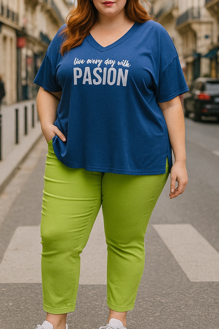 Μπλούζα Viscose με στάμπα PASSION μπροστά, V ντεκολτέ, διακριτικό σκίσιμο στα πλαΪνά, σε ίσια πολύ άνετη γραμμή