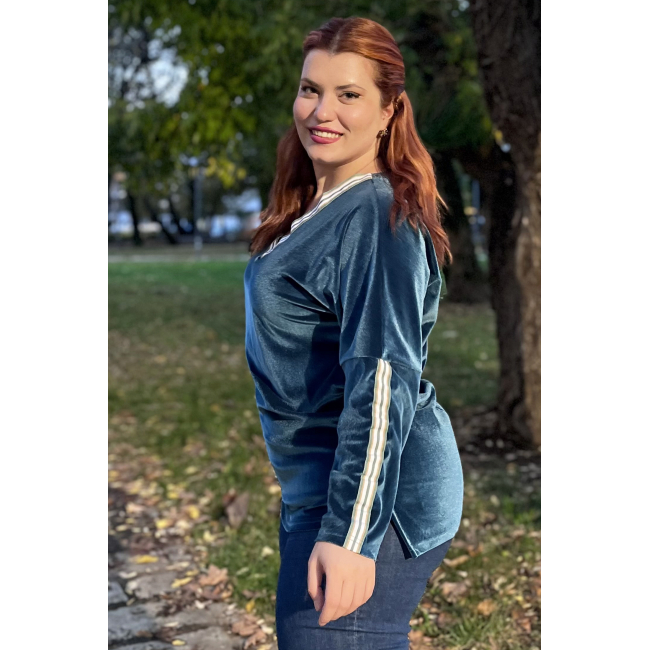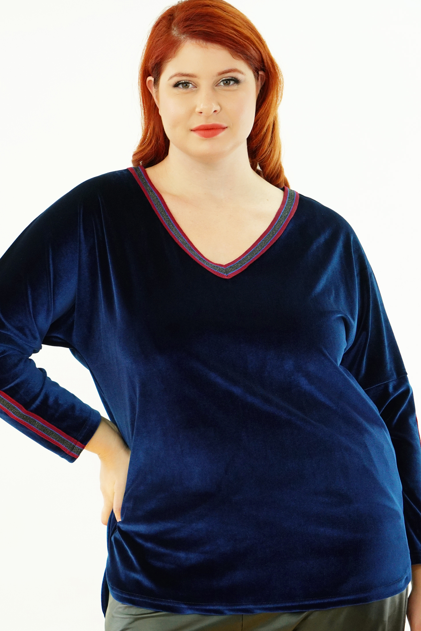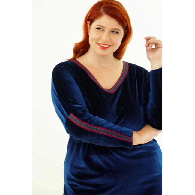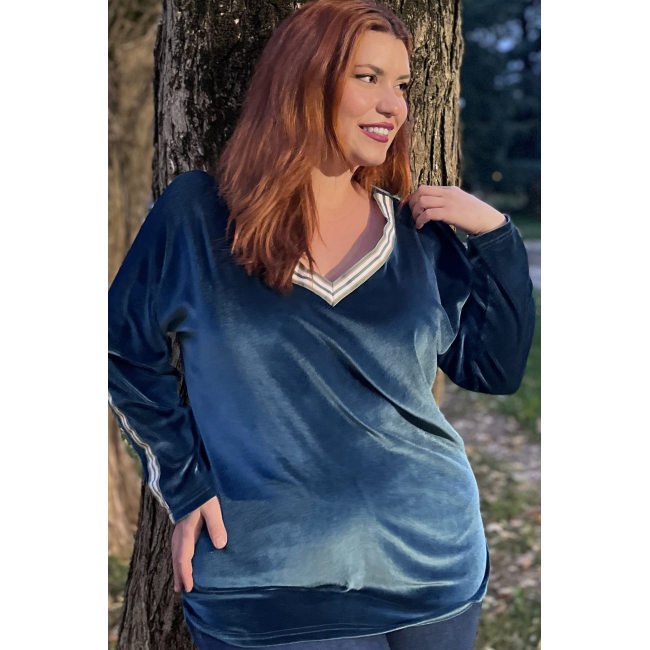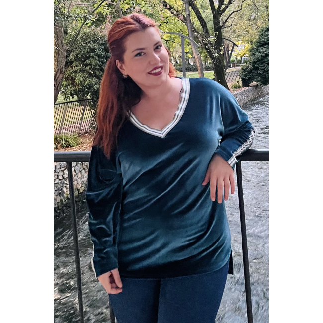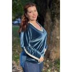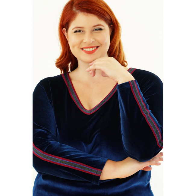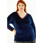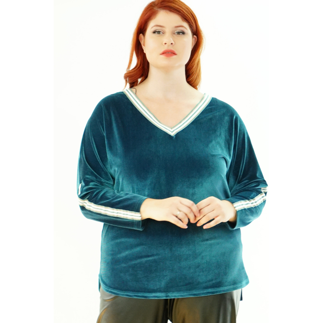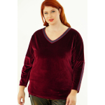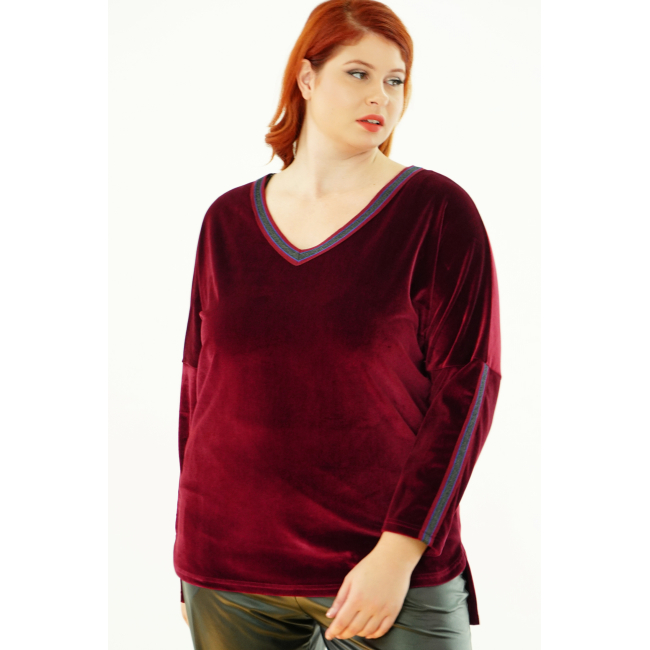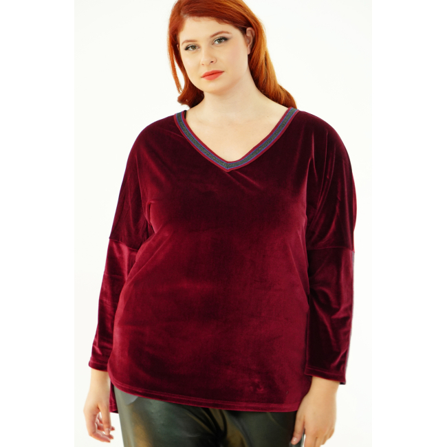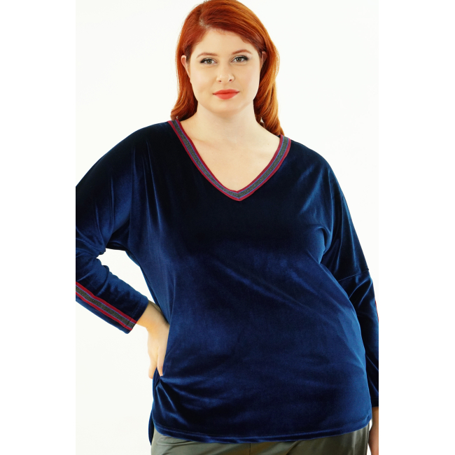 Μπλούζα Βελουτέ, V ντεκολτέ με διακοσμητική τρέσσα, ελεύθερα μανίκια με ραφή και τρέσα, σε ίσια πολύ άνετη γραμμή