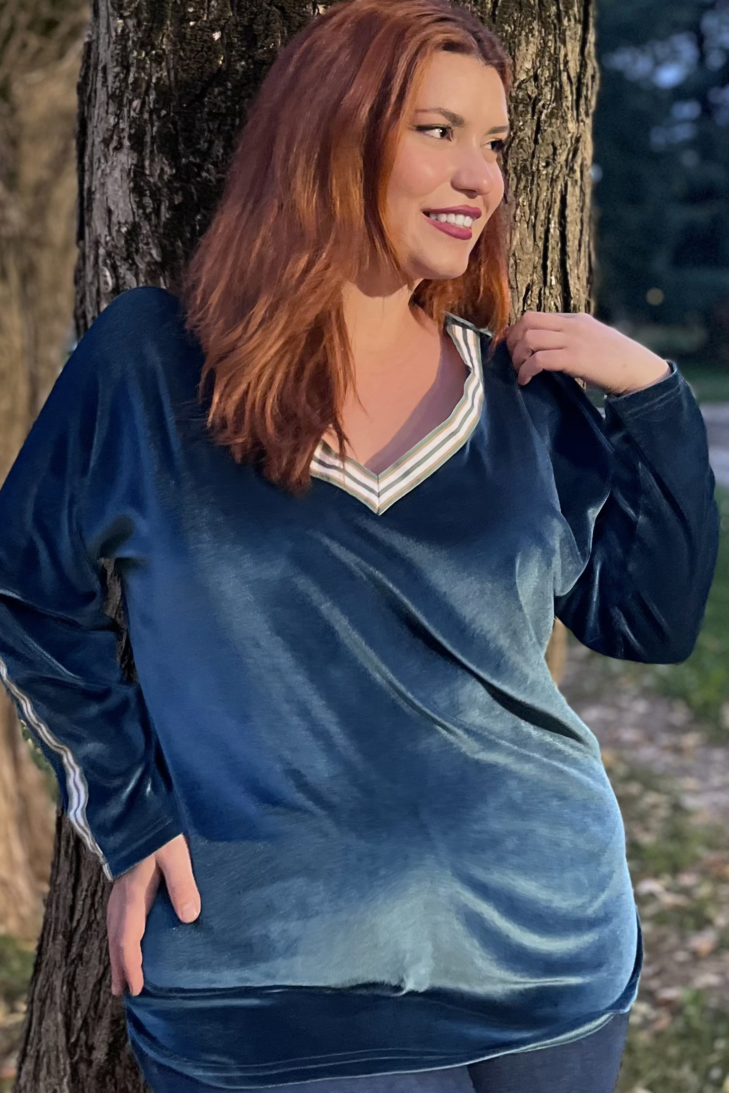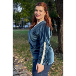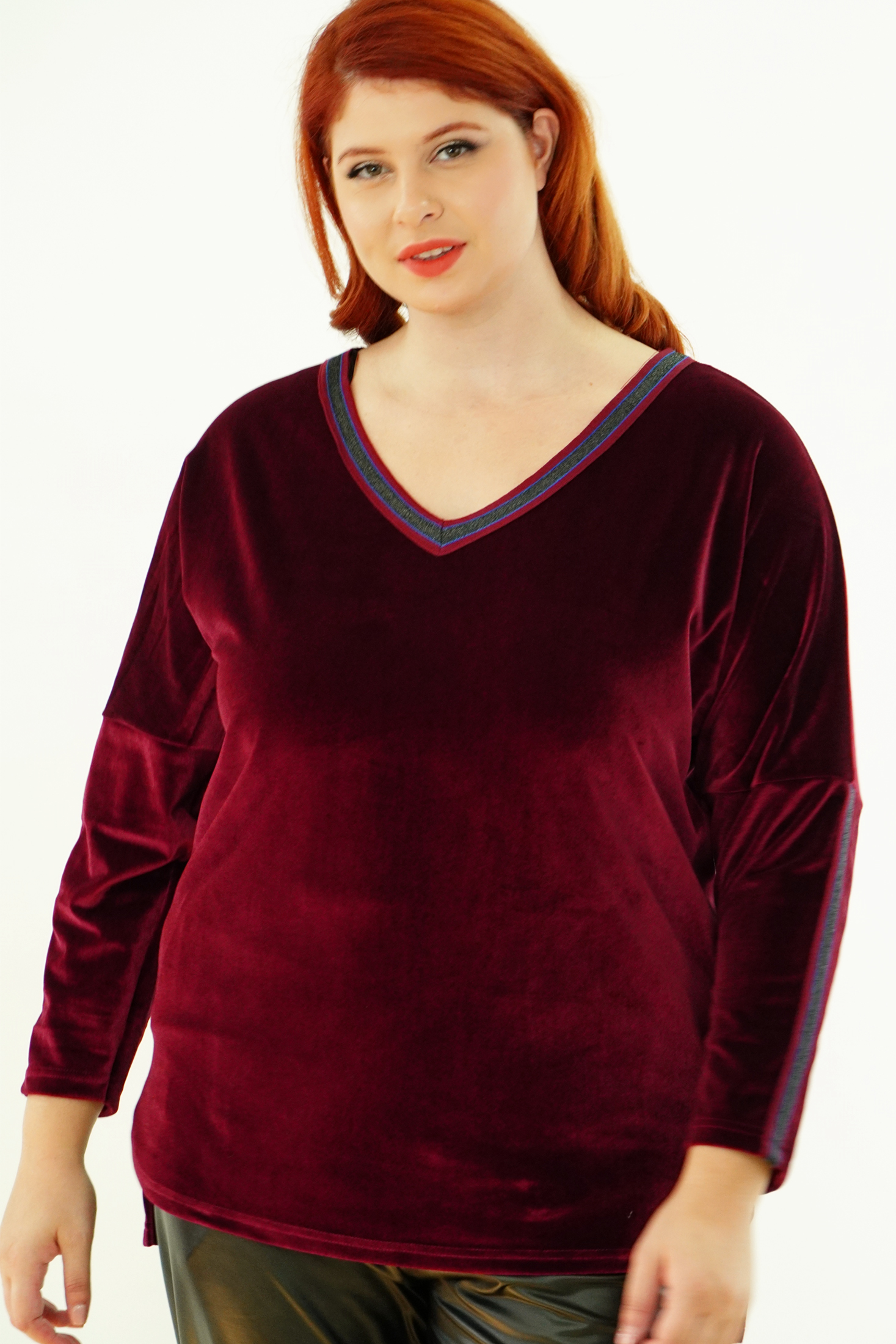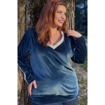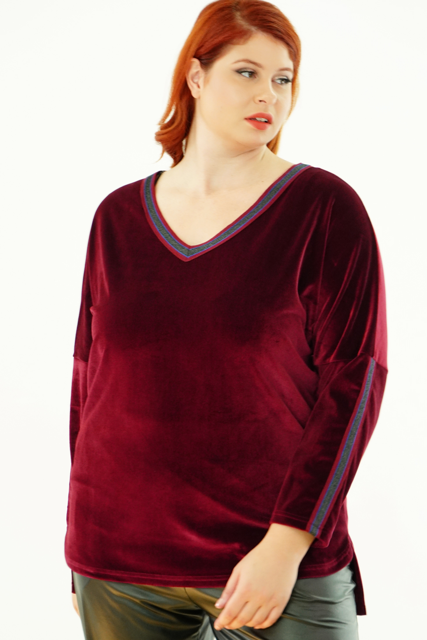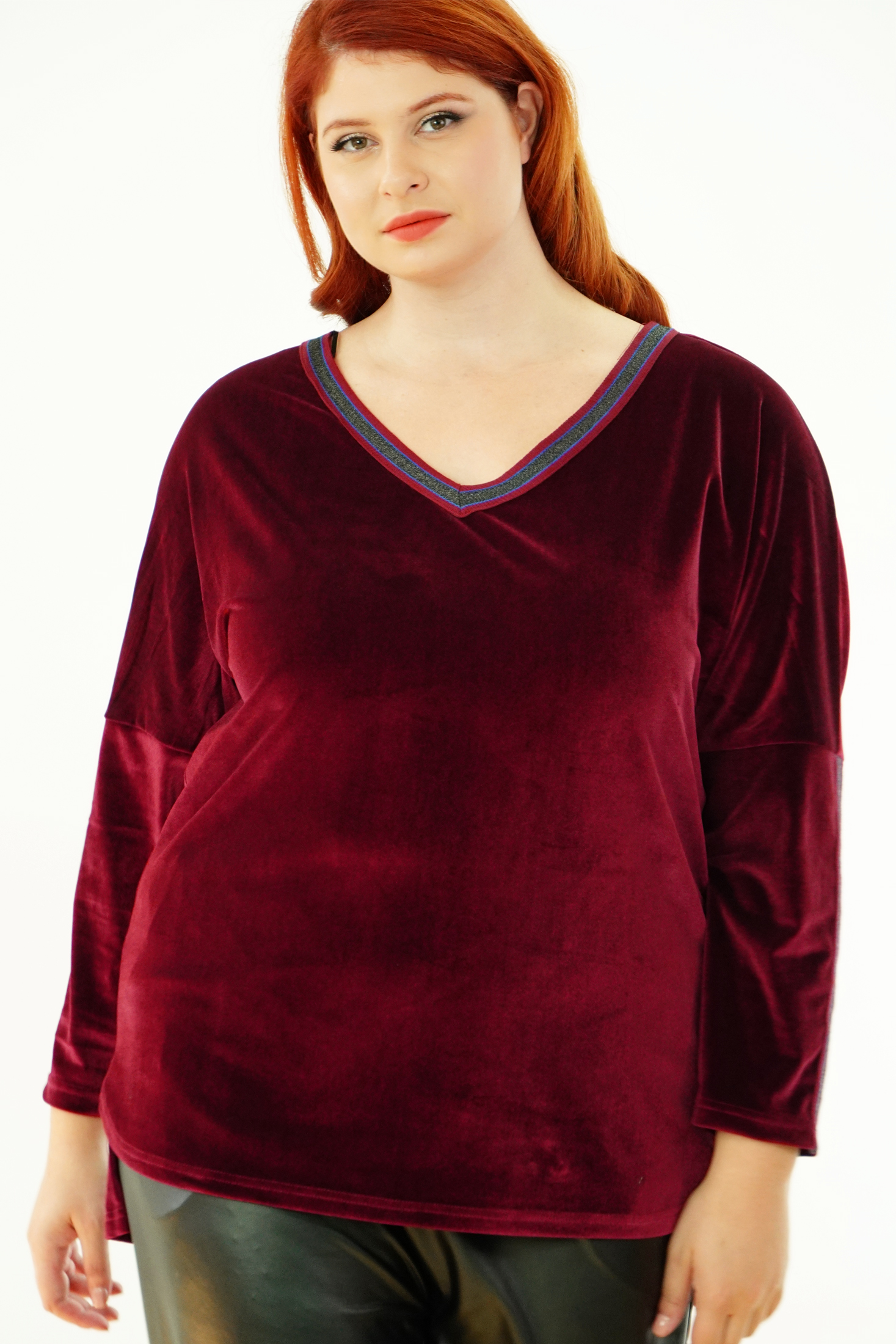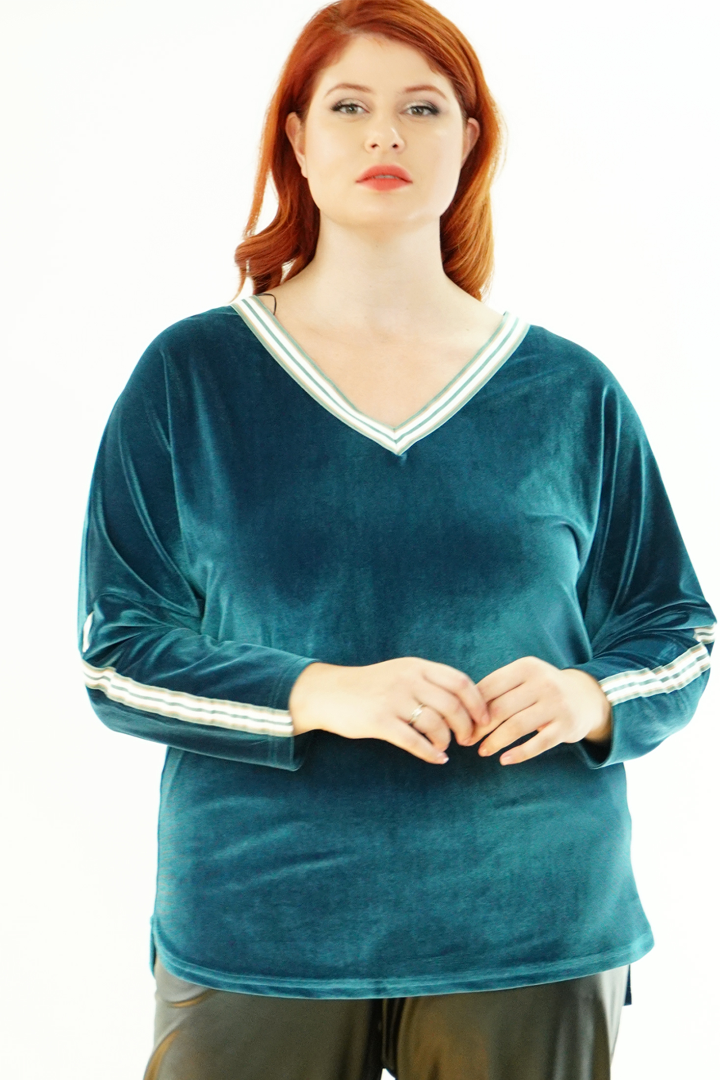 Μπλούζα Βελουτέ, V ντεκολτέ με διακοσμητική τρέσσα, ελεύθερα μανίκια με ραφή και τρέσα, σε ίσια πολύ άνετη γραμμή