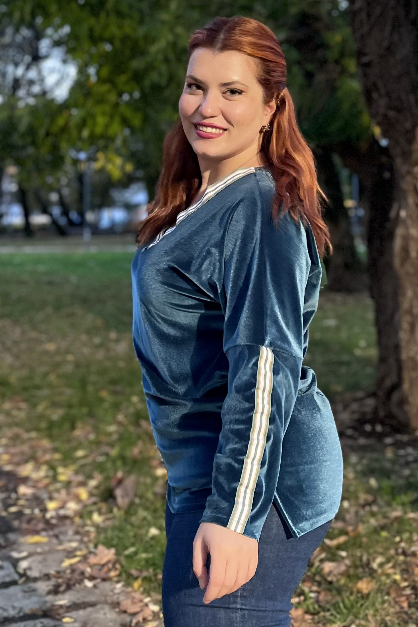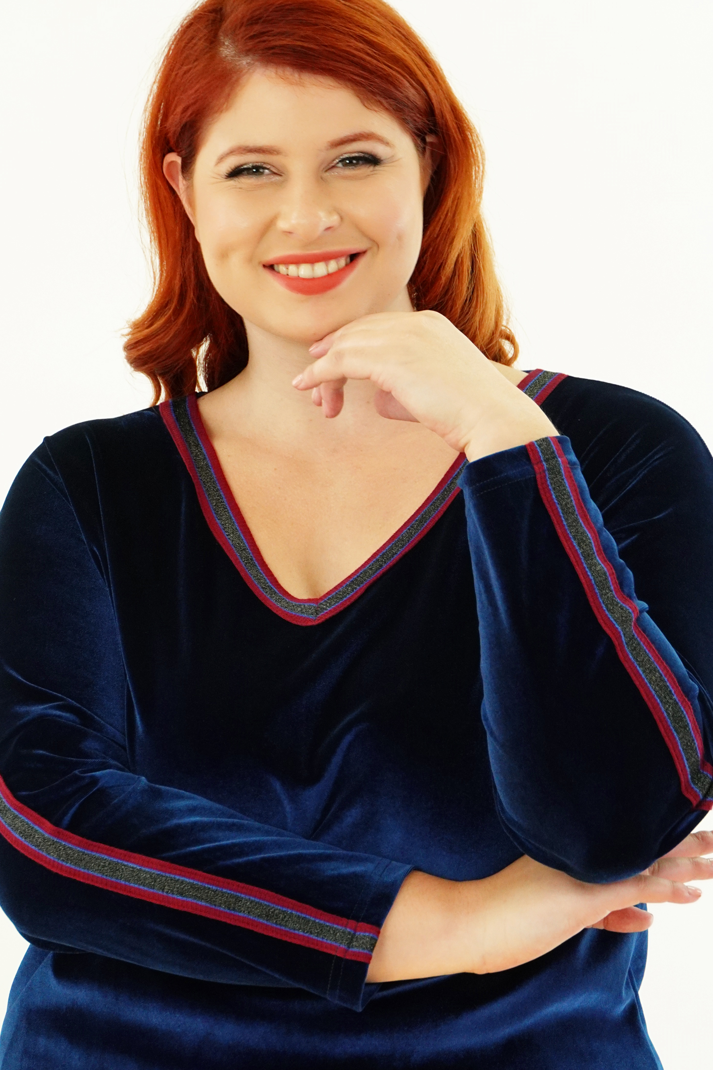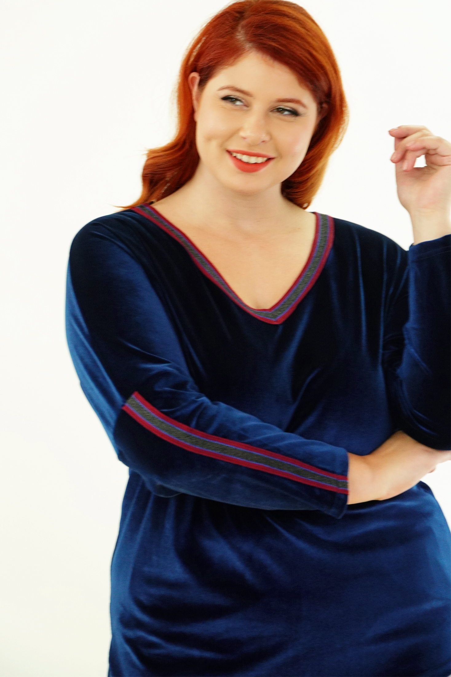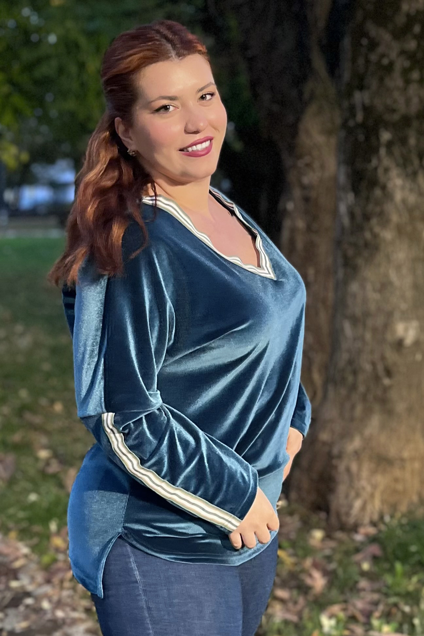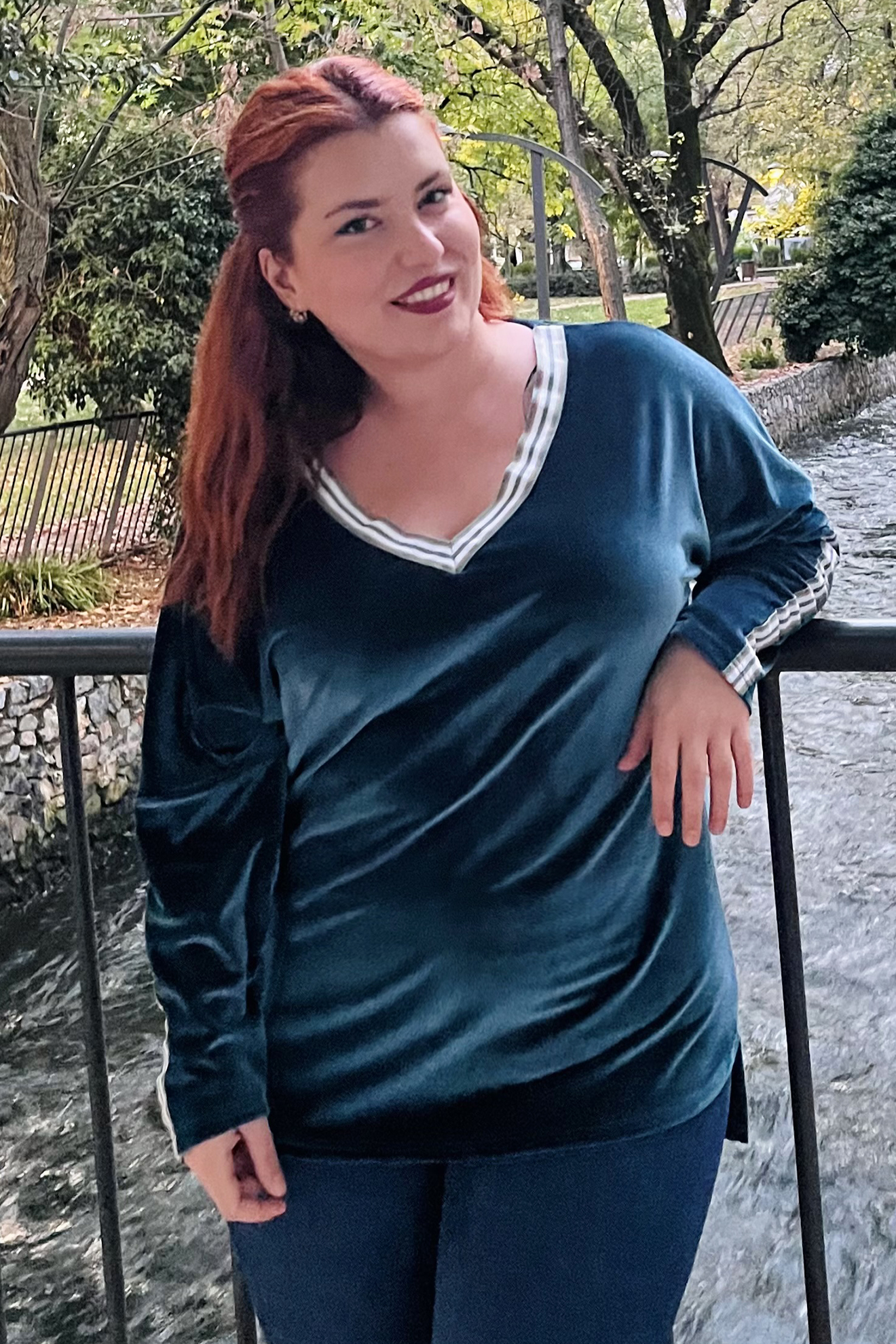 Μπλούζα Βελουτέ, V ντεκολτέ με διακοσμητική τρέσσα, ελεύθερα μανίκια με ραφή και τρέσα, σε ίσια πολύ άνετη γραμμή