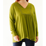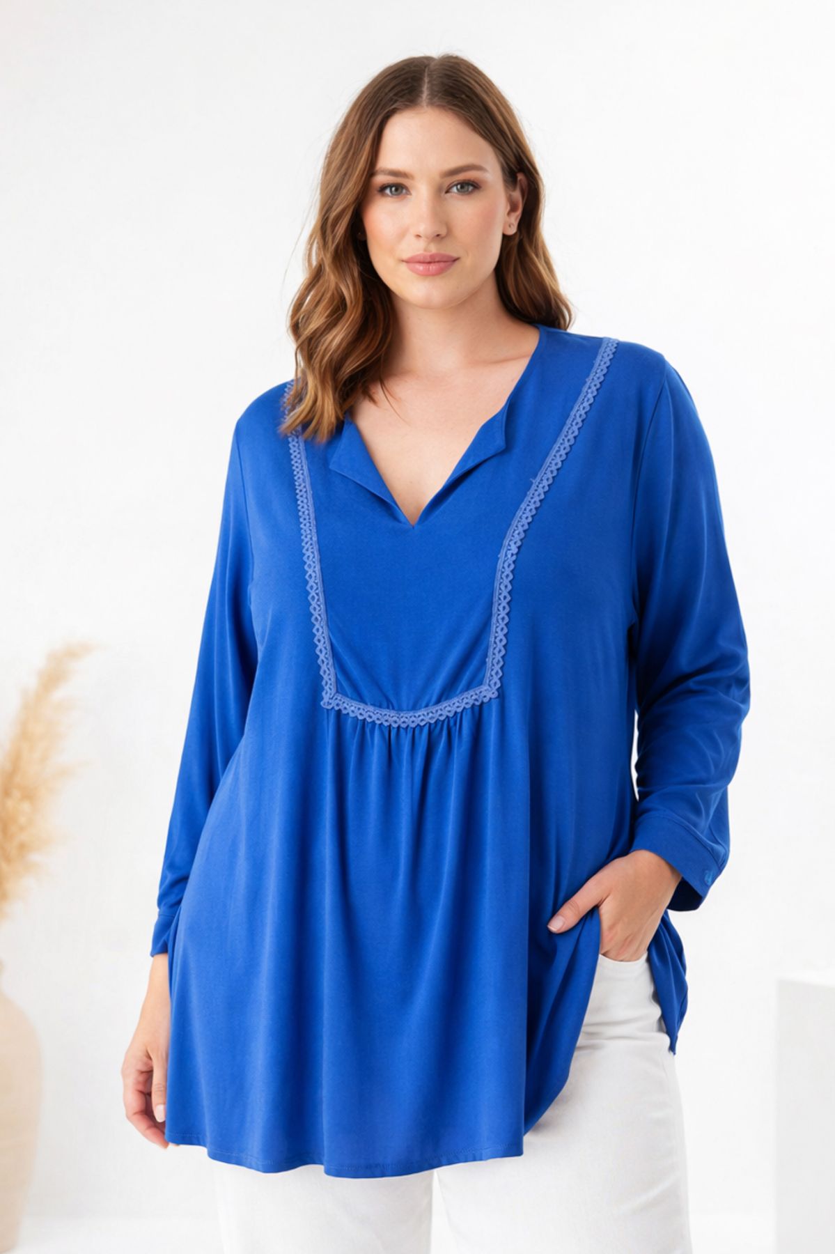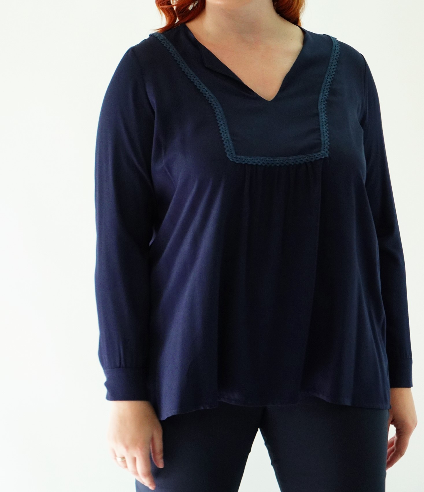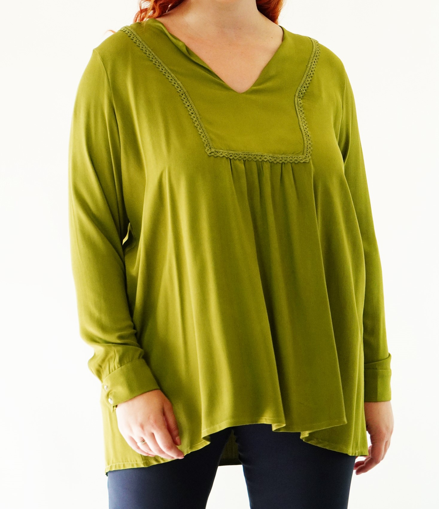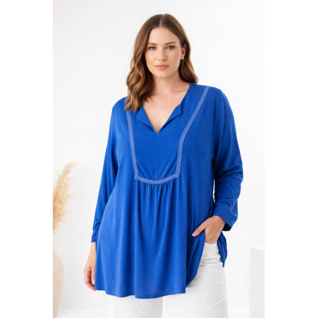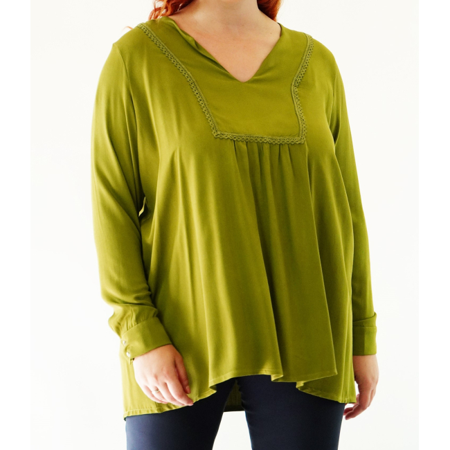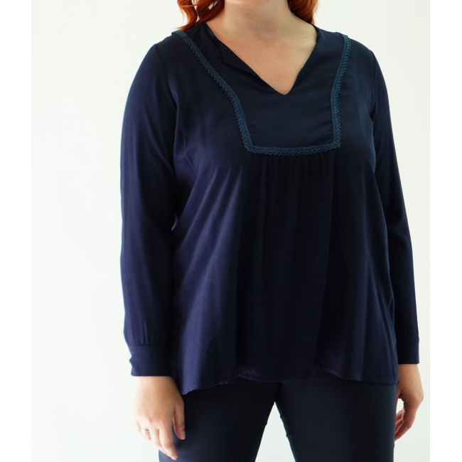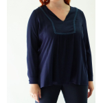Μπλούζα σε voile cotton ύφασμα, V ντεκολτέ, τρέσσα στο μπούστο σε ethnic style, μανίκια με μανσέτα και 2 κουμπιά, σε Α πολύ άνετη γραμμή