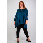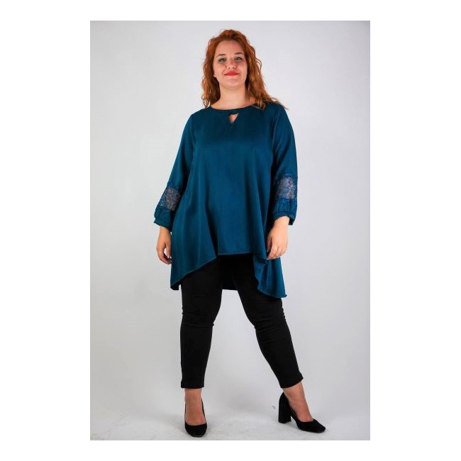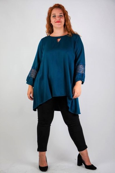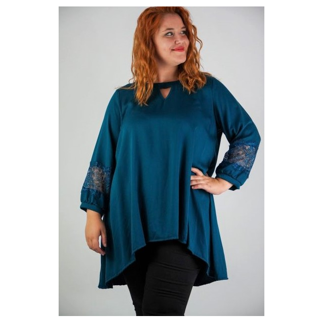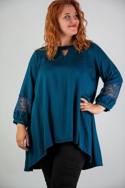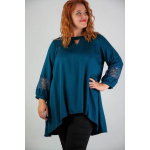 Μπλούζα σε 100% Voual Cotton, στρογγυλή λαιμόκοψη με διακριτικό άνοιγμα μπροστά, μανσέτα στα μανίκια και δαντέλα του ίδιου χρώματος. Σε Α άνετη γραμμή