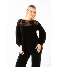 Μπλούζα κρουαζέ, σε Μουσελίνα εμπριμέ ύφασμα, χωρίς διαφάνεια, διακοσμιτικό χιαστί ρέλι στο ντεκολτέ, μανίκια με διακριτικό βολάν στο τελείωμα τους και δέσιμο, ελαφρύ λάστιχο στο τελείωμα της μπλούζας για δημιουργεία ballon, σε άνετη γραμμή που καλύπτει κοιλίτσα.