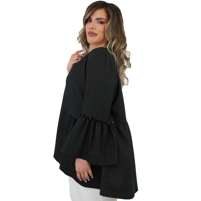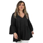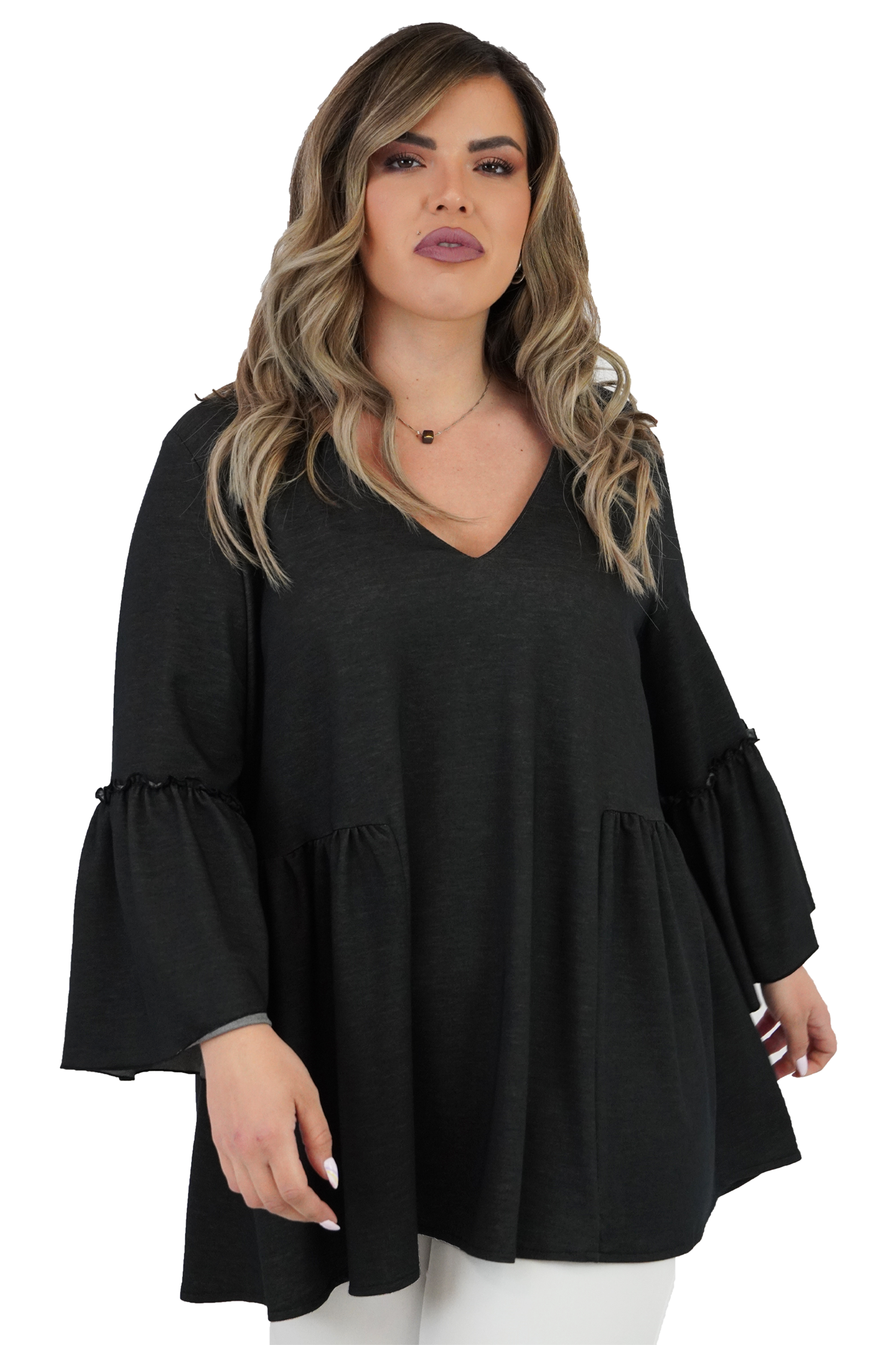 Μπλούζα σε ελαστικό τζιν, V ντεκολτέ, μανίκια με βολάν σε Α γραμμή, σούρα στο πλάι και πίσω που δημιουργεί Α άνετη γραμμή