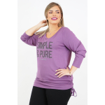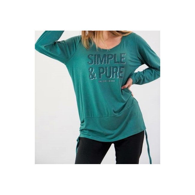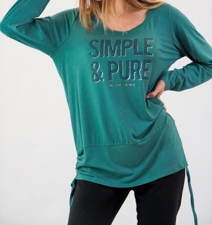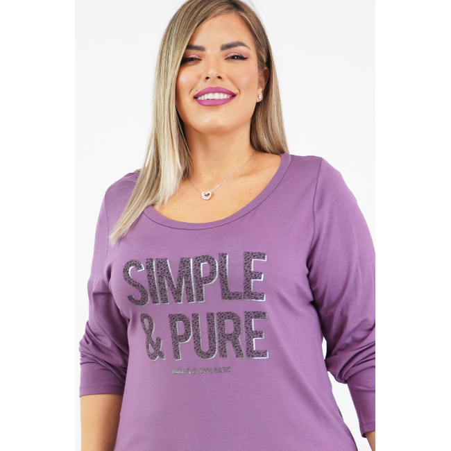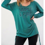 Μπλούζα Viscose, στρογγυλή ανοιχτή λαιμόκοψη, στάμπα εμπρός "Simple & Pure", μεγάλη μπάσκα στο κάτω μέρος με εσωτερικό κορδόνι για την αυξομείωσή της, σε ίσια άνετη γραμμή