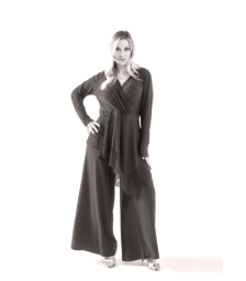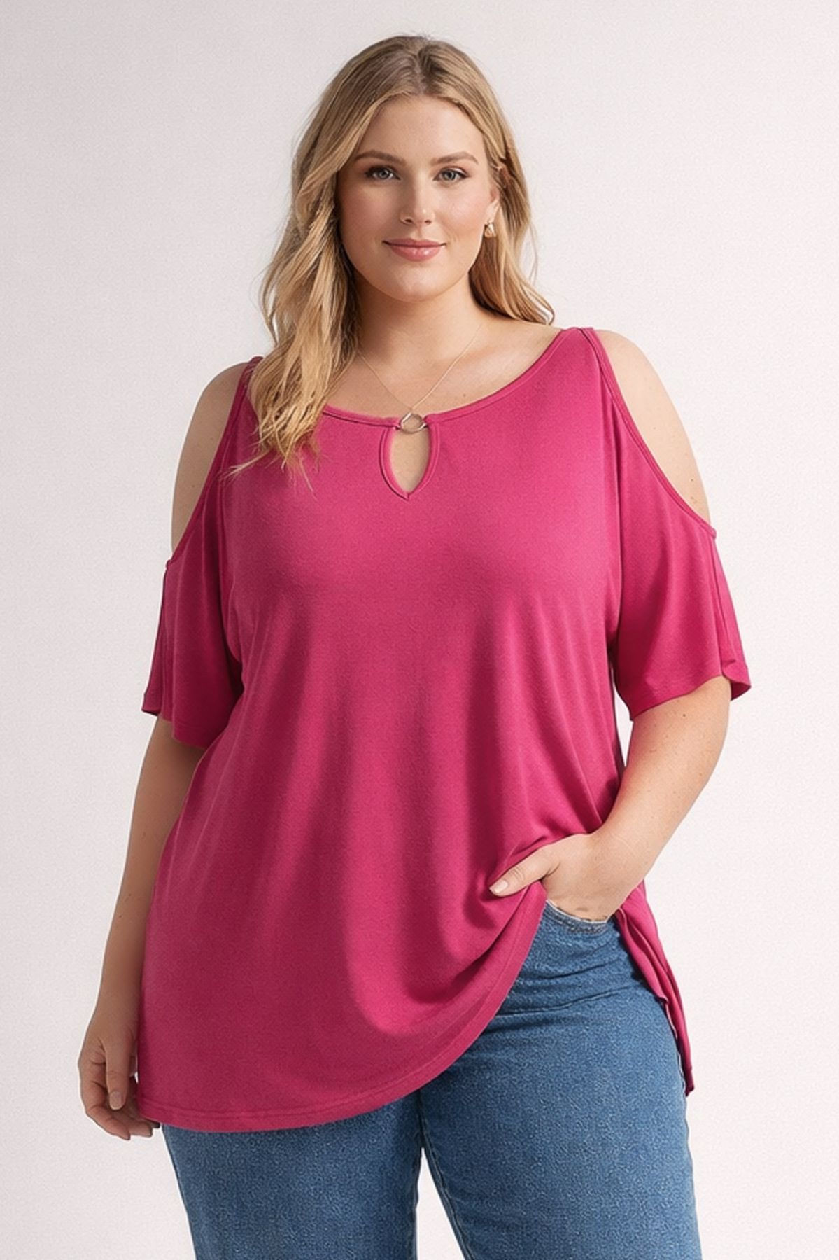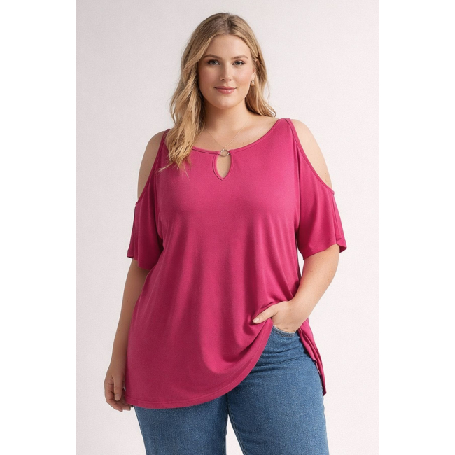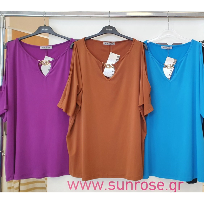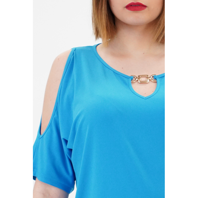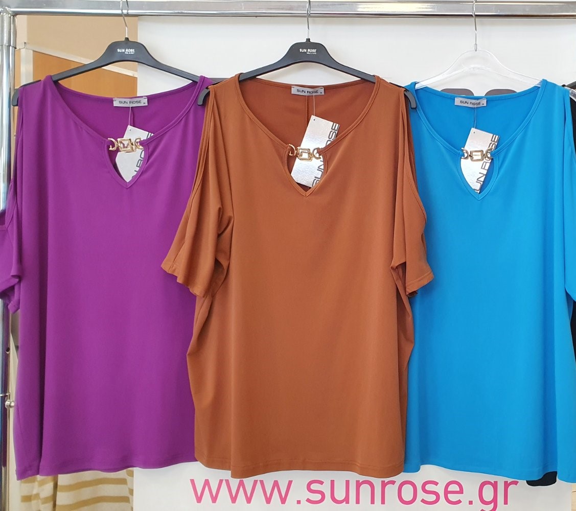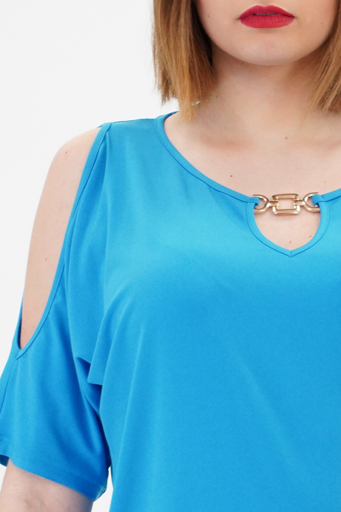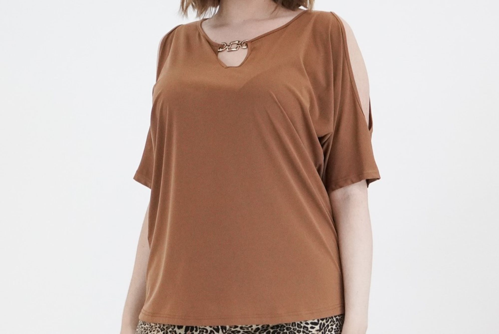 Μπλούζα Jersey, στρογγυλή λαιμόκοψη με διακριτικό κόψιμο μπροστά "δάκρυ" και χρυσό μοτίφ, τρουακάρ μανίκια με άνοιγμα, σε ίσια άνετη γραμμή