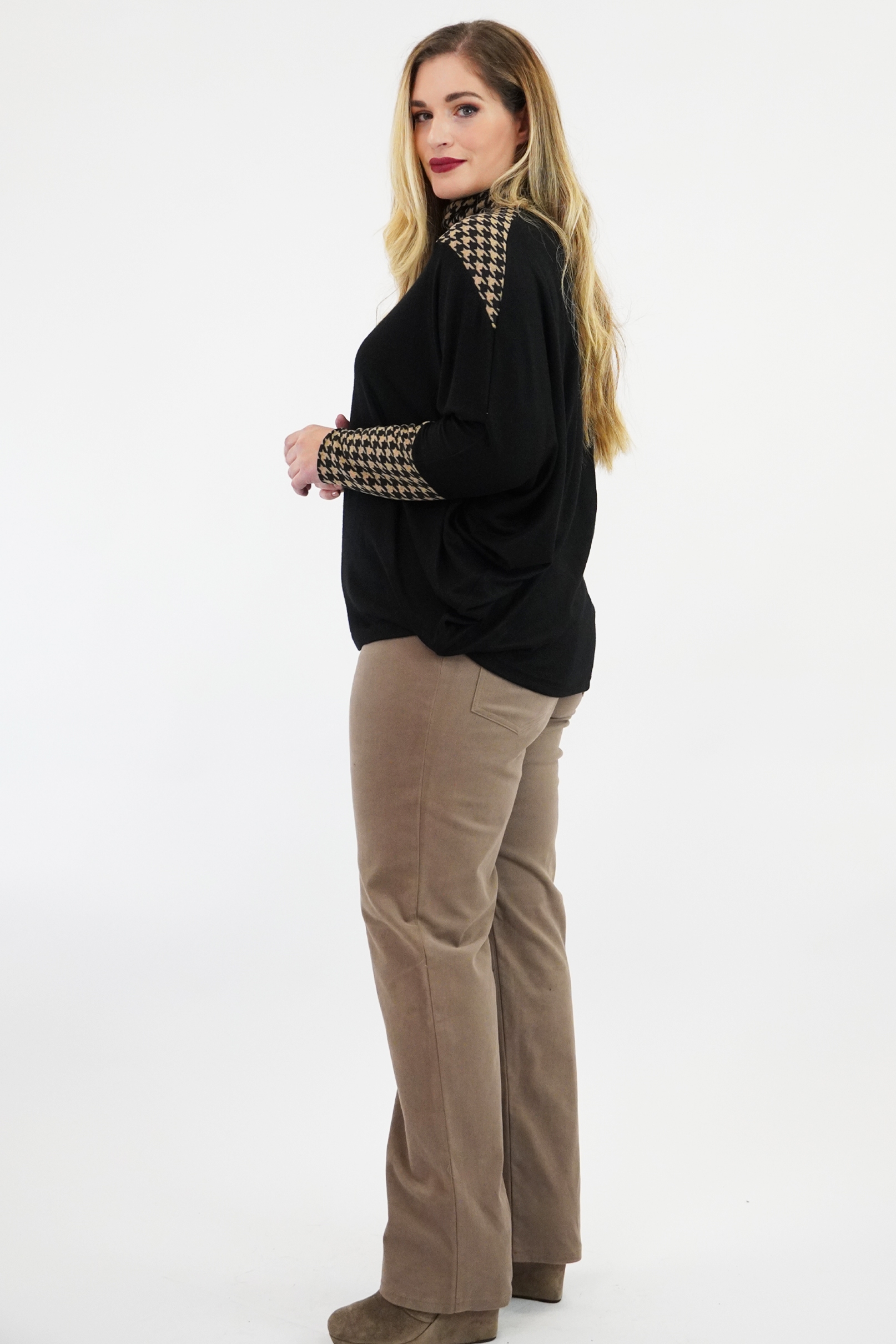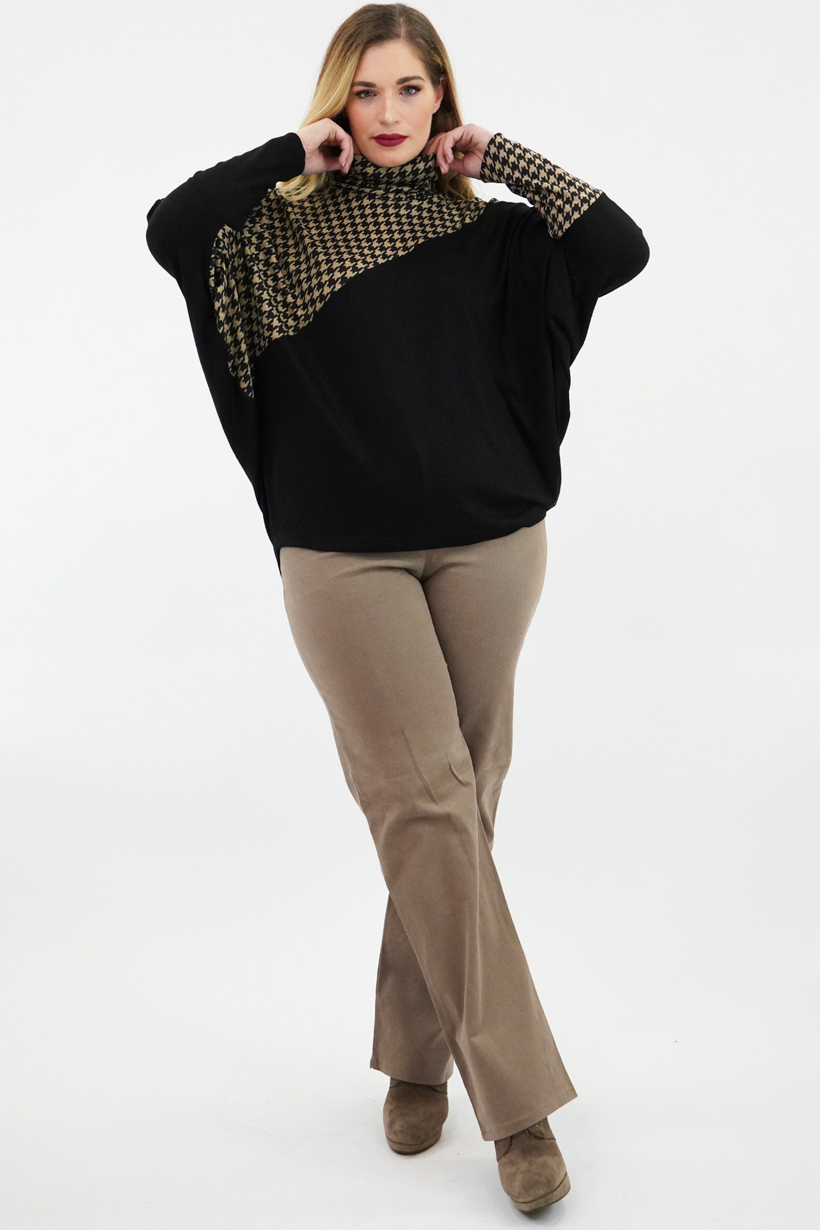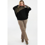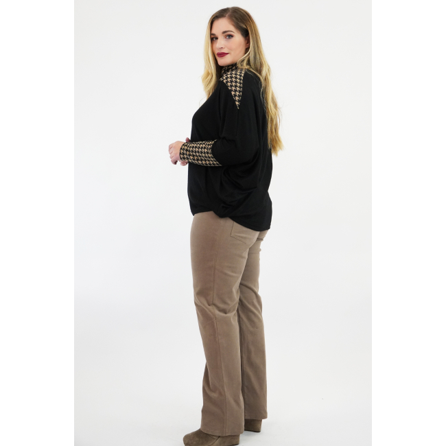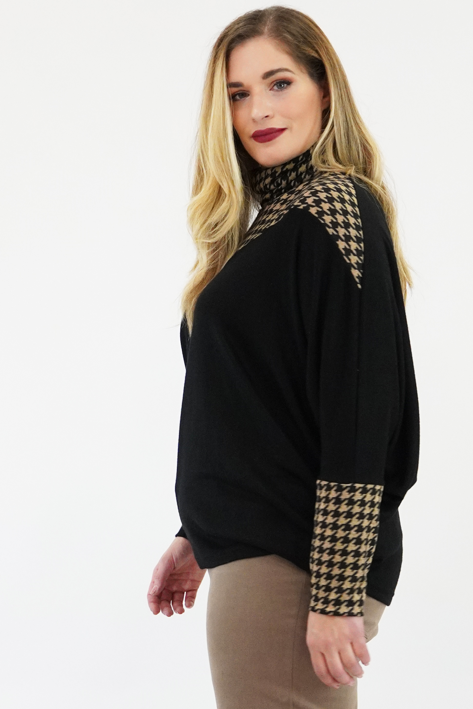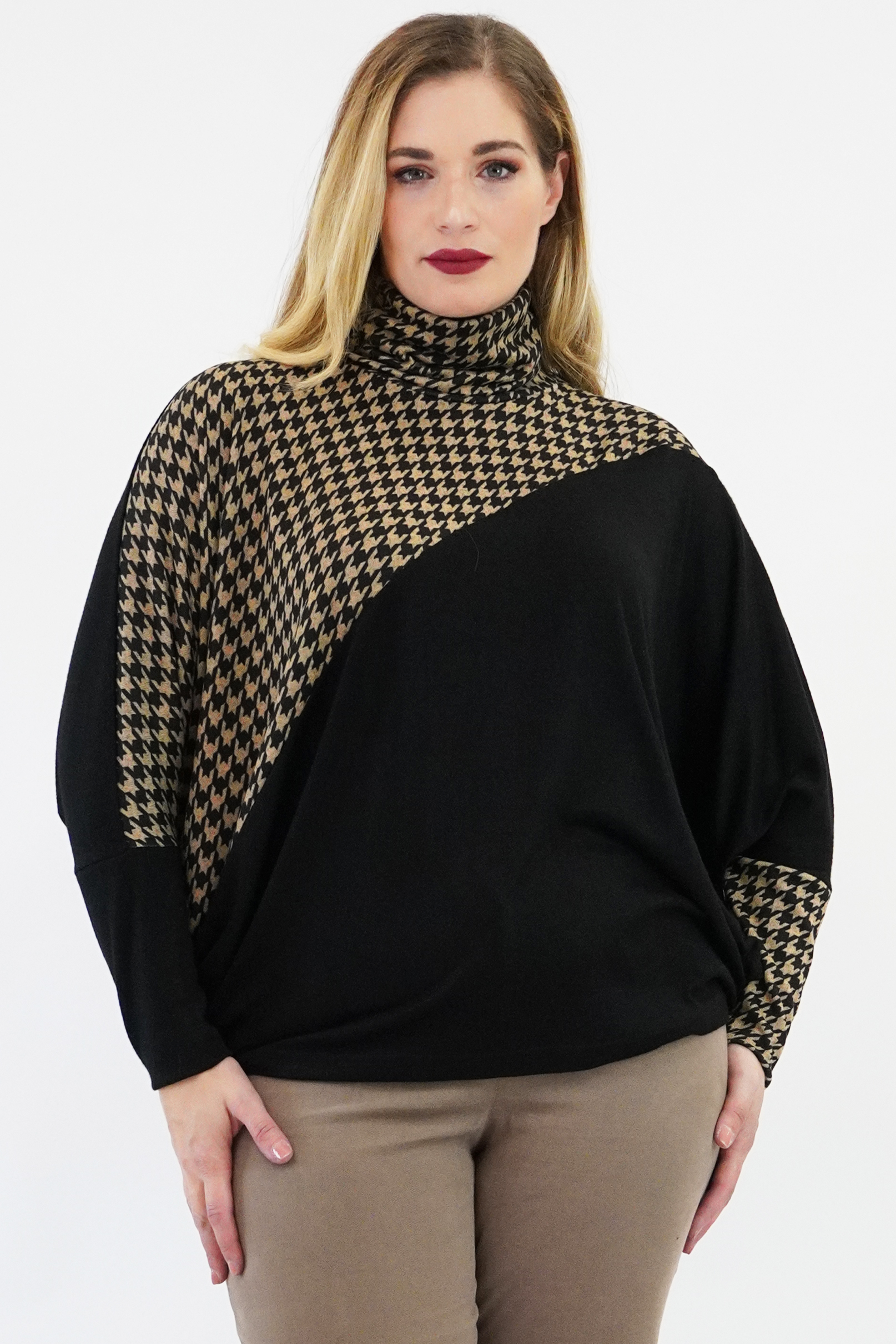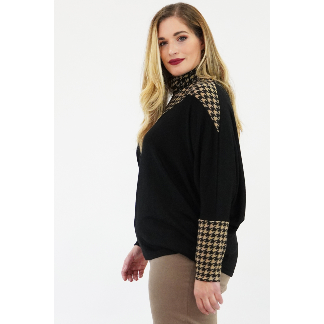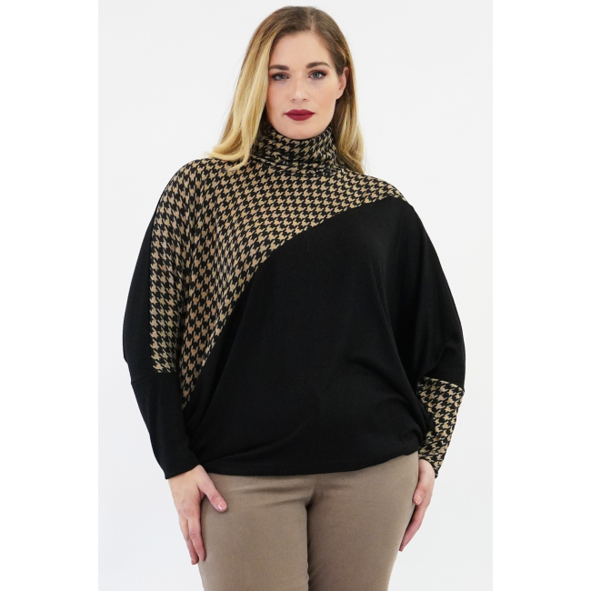 Μπλούζα/Πουλόβερ oversize, εμπριμέ, πλεκτό κοπής/ραφής, γυριστό ζιβάγκο, πιε ντε πούλ σχέδιο επάνω και μανσέτα, ζαπονέ μανίκια, σε ίσια γραμμή