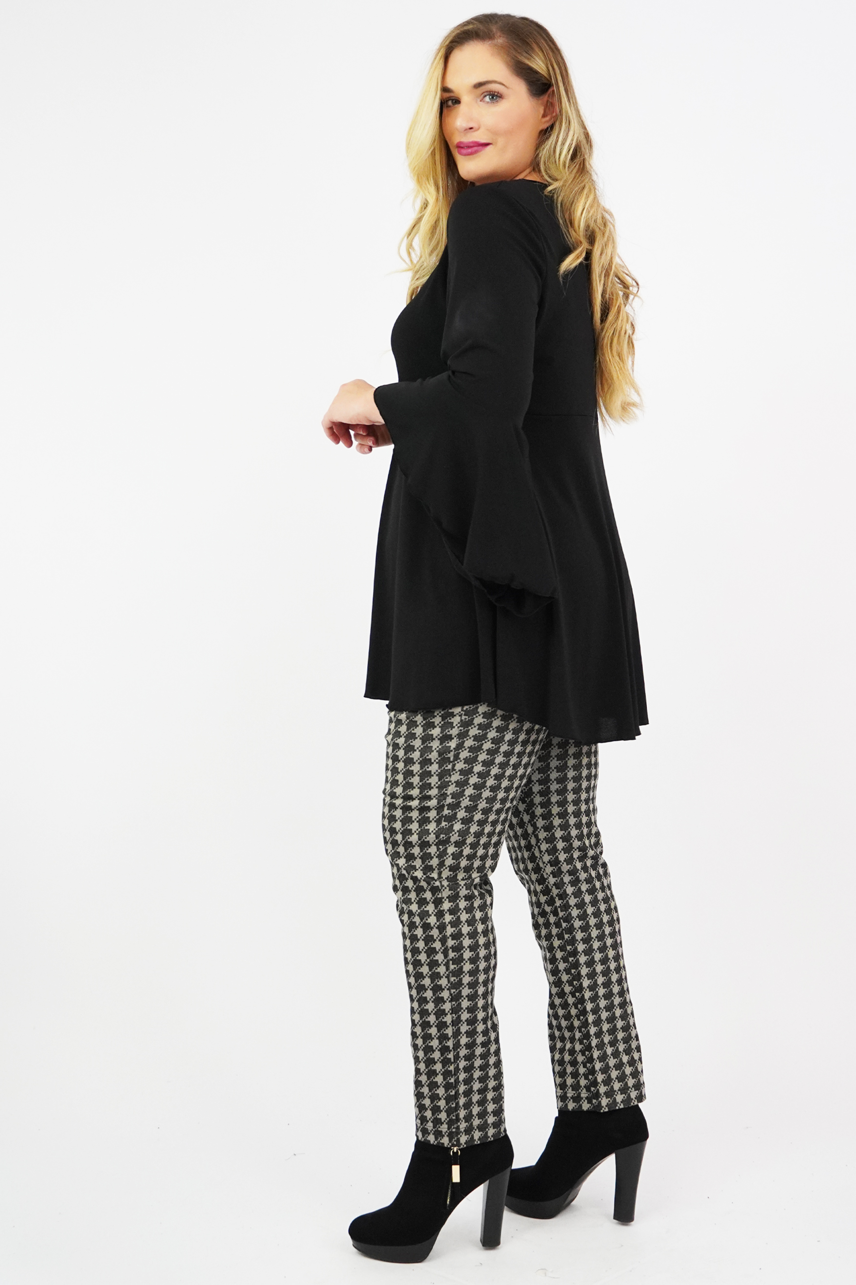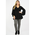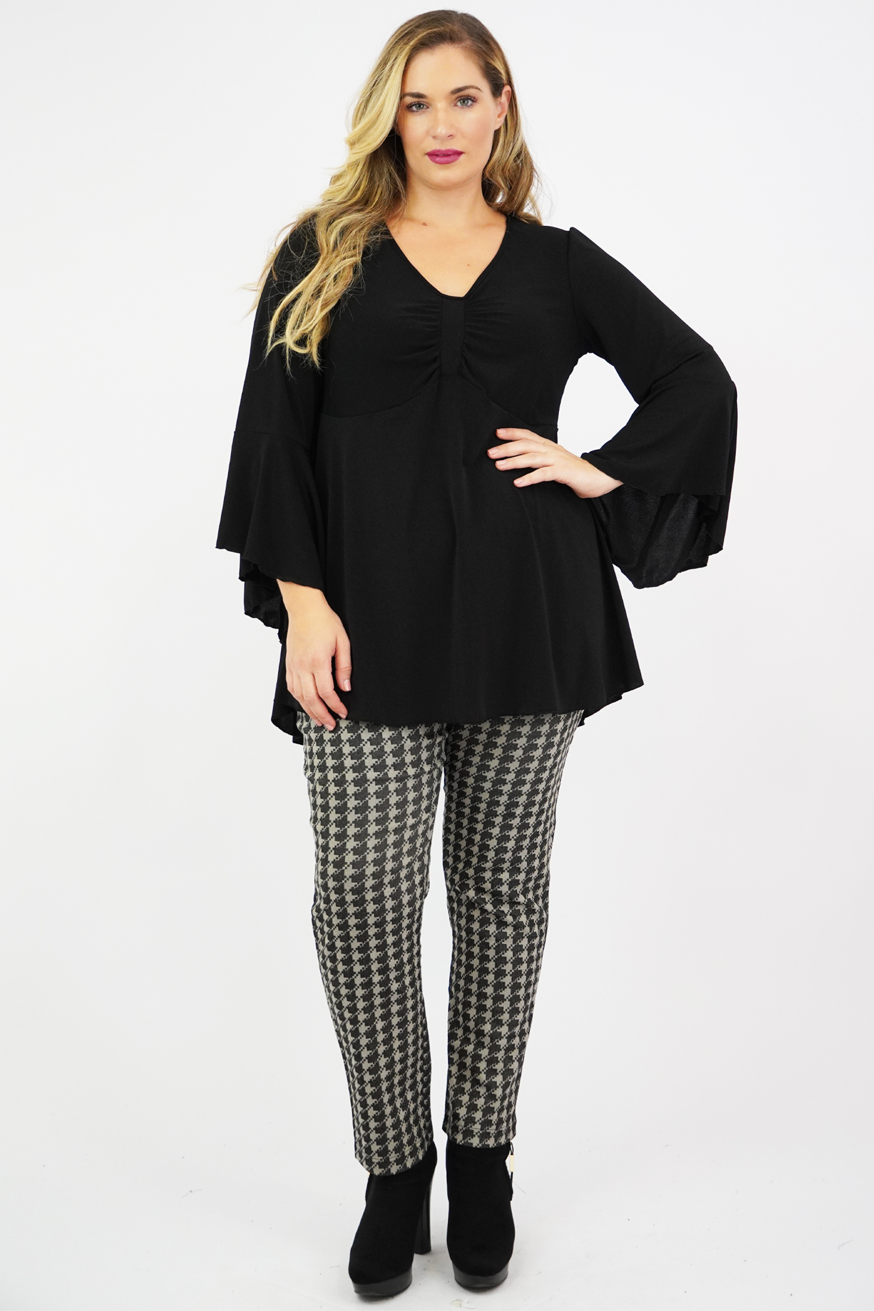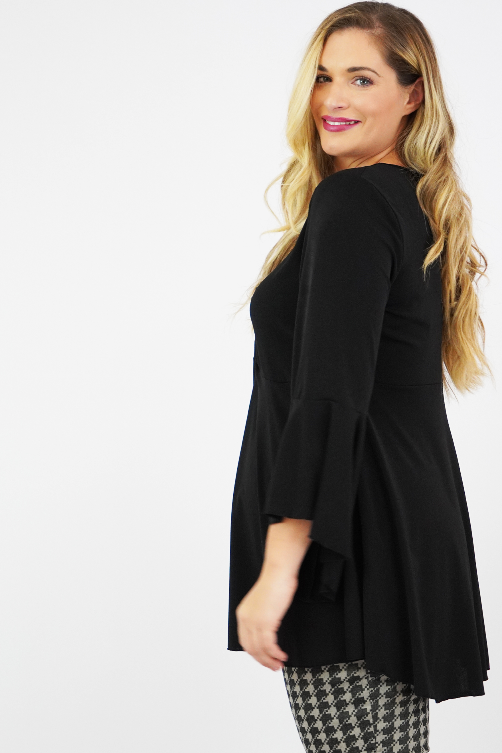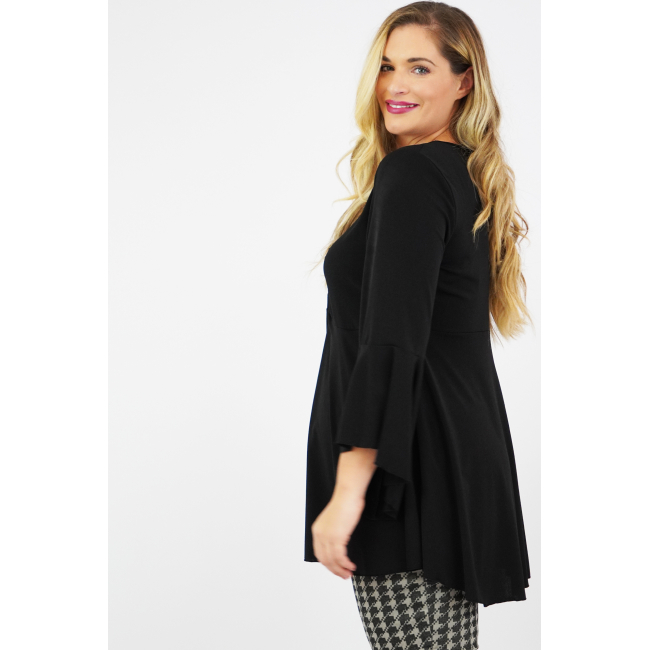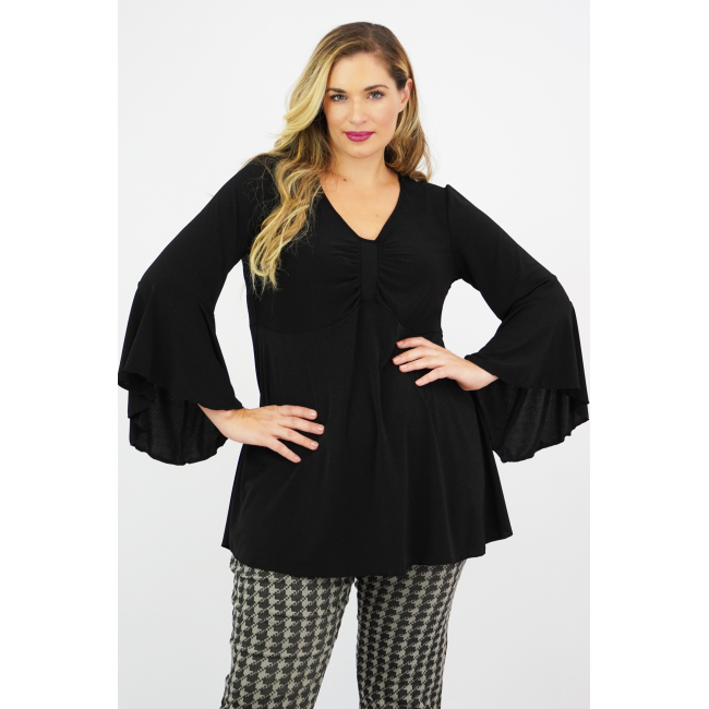 Μπλούζα bubble crep, άνιση, V ντεκολτέ με κάθετη σούρα, μανίκια με άνισο βολάν στο τελείωμα, διακριτική ραφή στη μέση, σε Α άνετη γραμμή