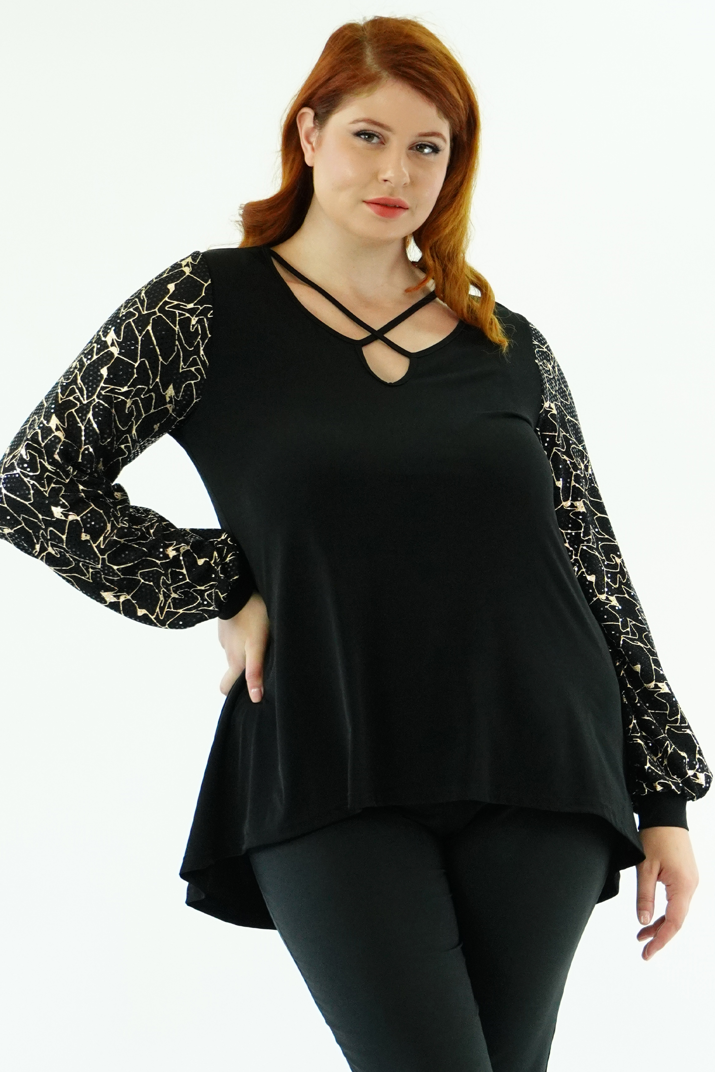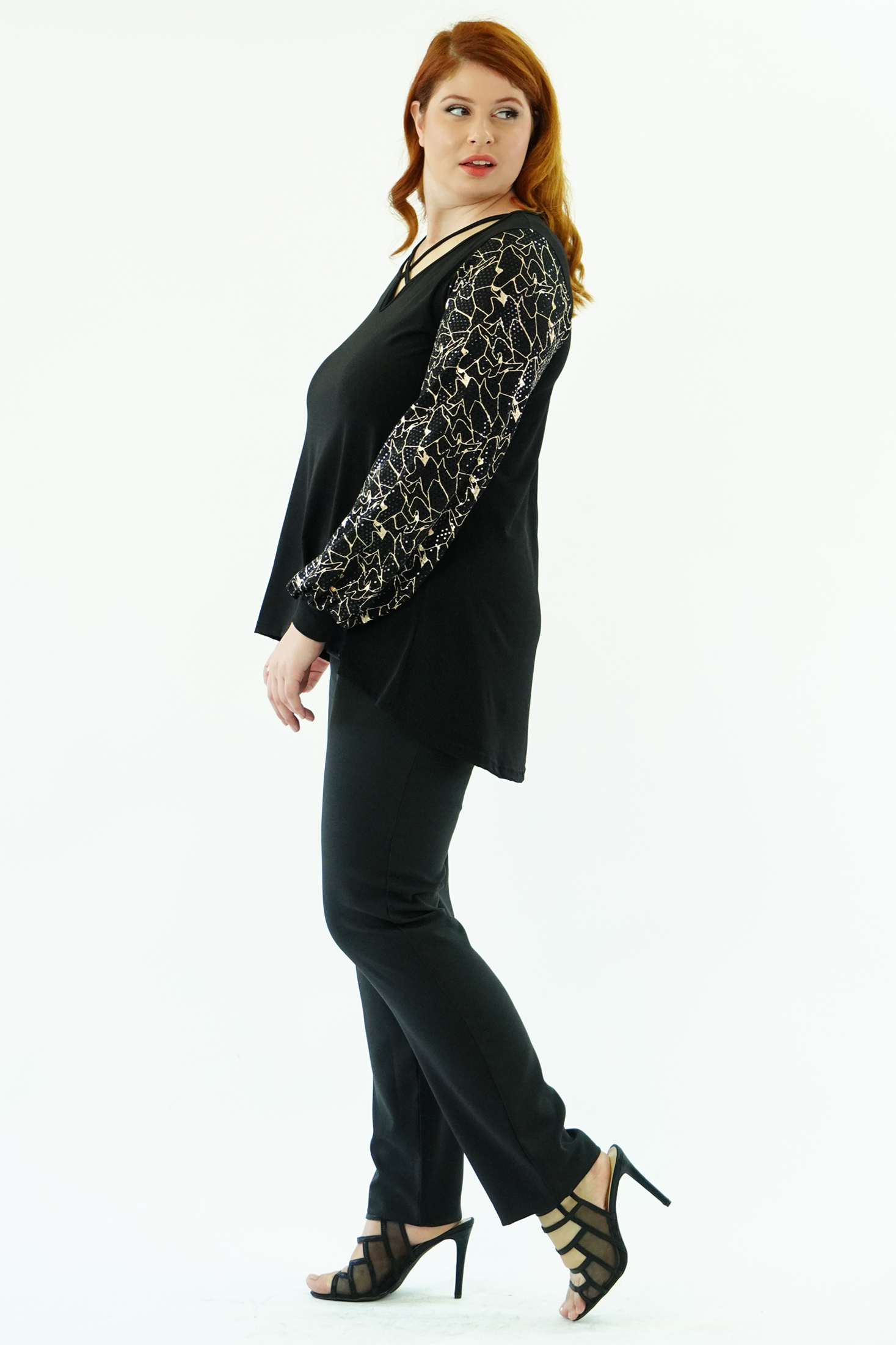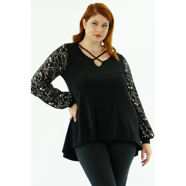 Μπλούζα Jersey άνιση, V ντεκολτέ με χιαστί διακοσμιτικό ρέλι, μανίκια σε Givre' Lurex ύφασμα, ελαστική μανσέτα, σε Α πολύ άνετη γραμμή