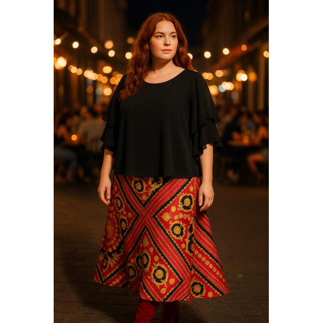 Ο στυλίστας την έχει συνδυάσει με την μάξι Φούστα σε satin Versace εμπριμέ ύφασμα, λοξό πατρόν για να καλύπτει άνετα νούμερο, ζωνάκι λάστιχο στη μέση, σε Α άνετη γραμμή