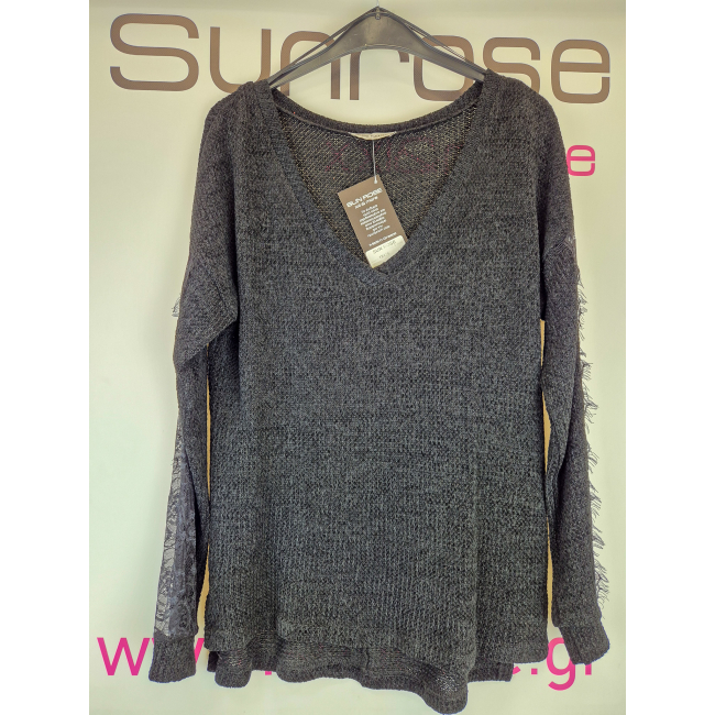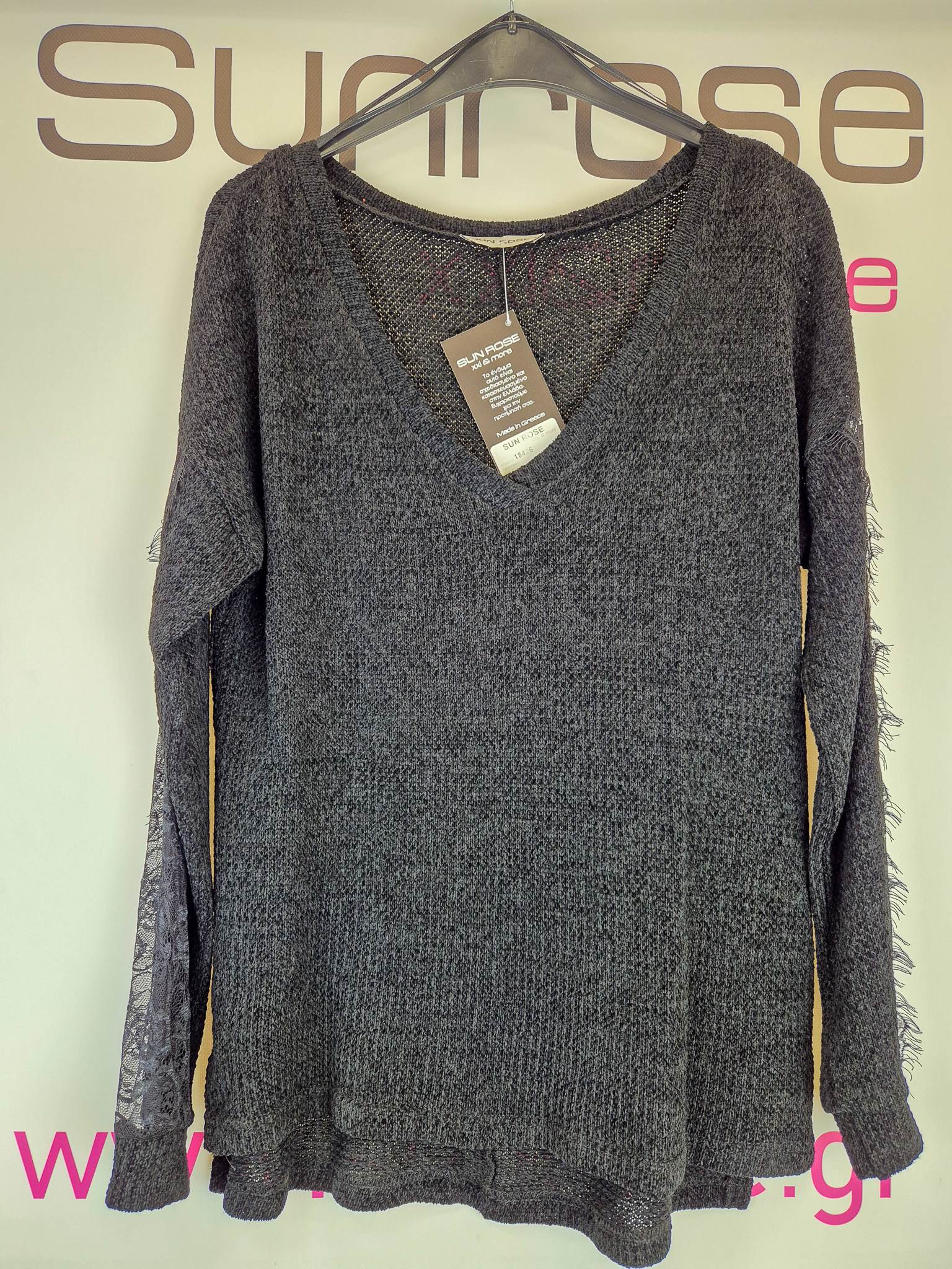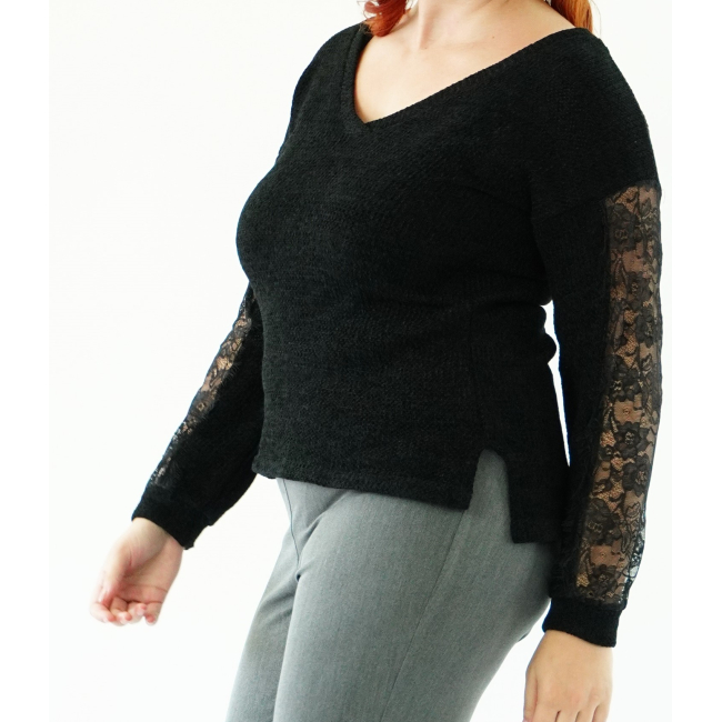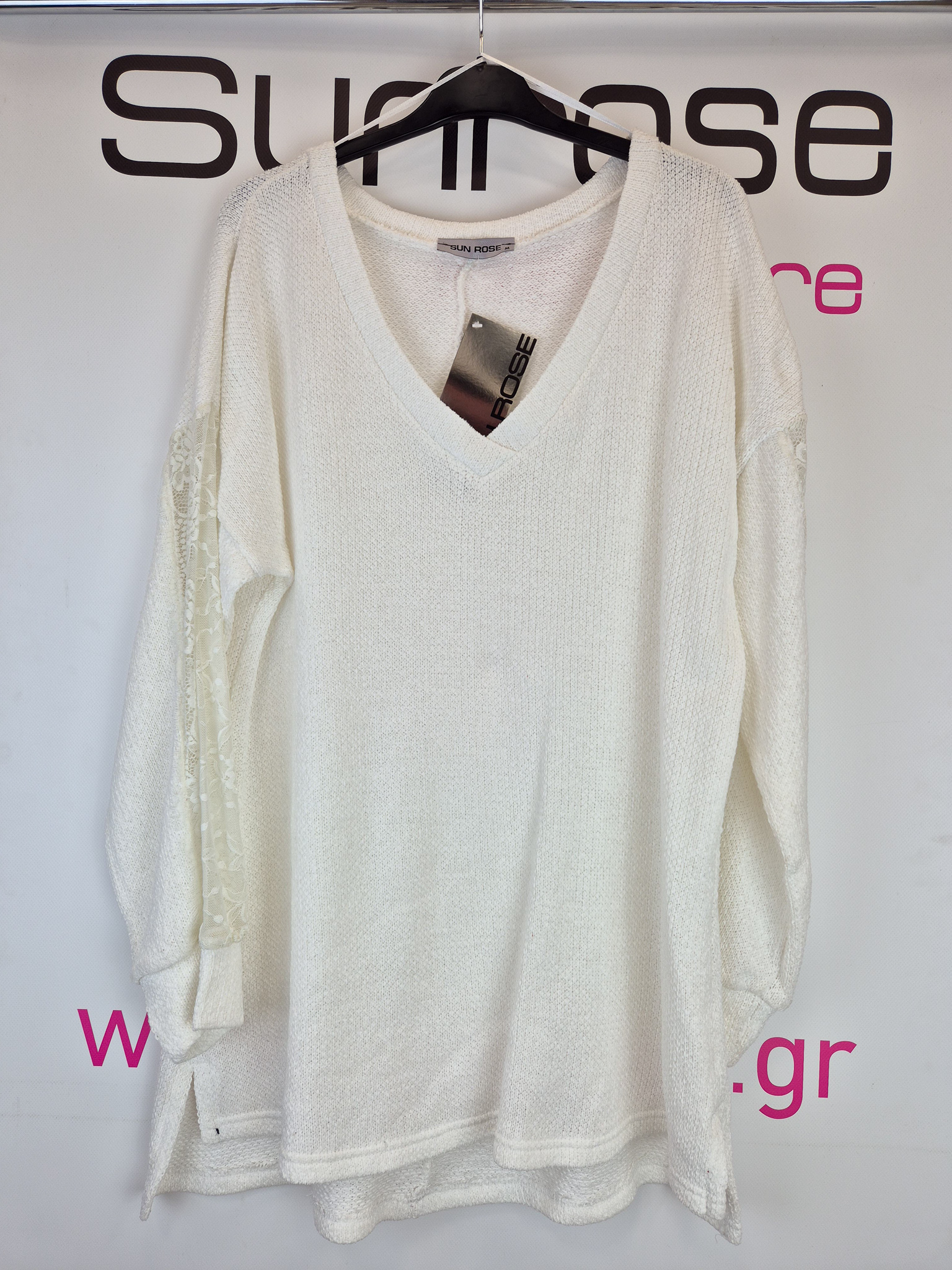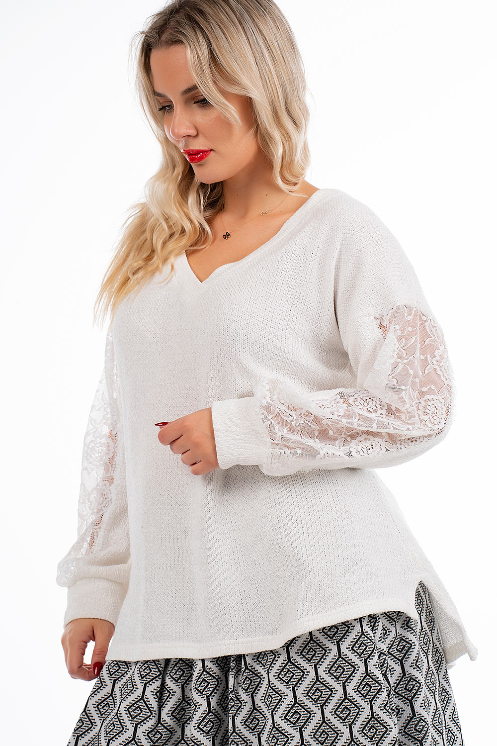 Μπλούζα/Πουλόβερ σε πλεκτό κοπής ραφής, V ντεκολτέ, ζαπονέ μανίκια με τρέσσα δαντέλα στο πάνω μέρος, σε Α άνετη γραμμή με διακριτικό σκίσιμο στο πλάι