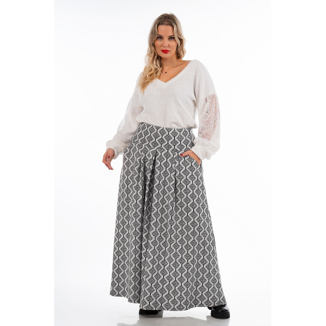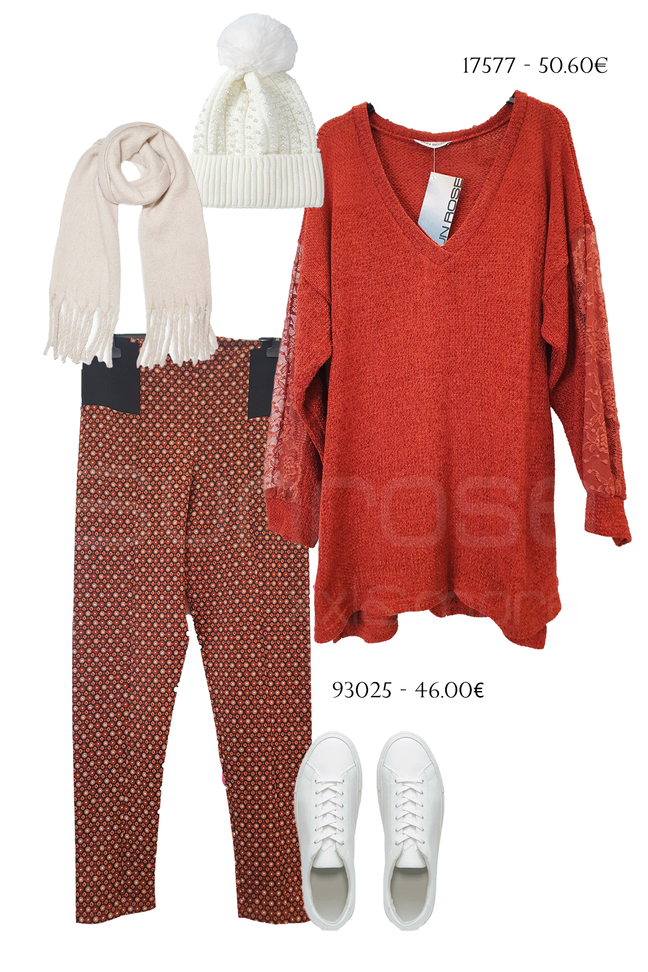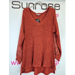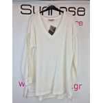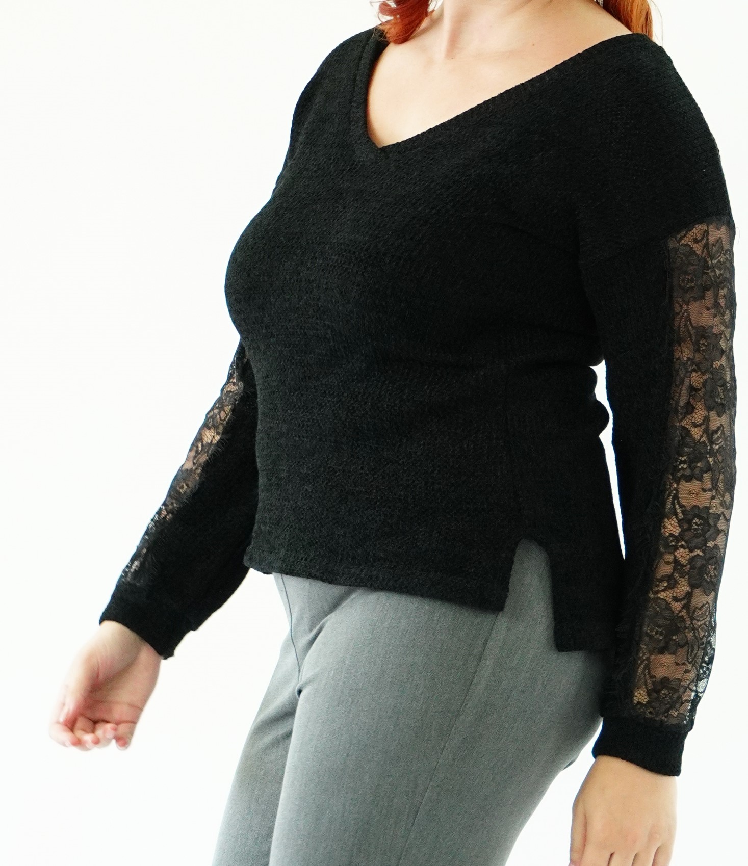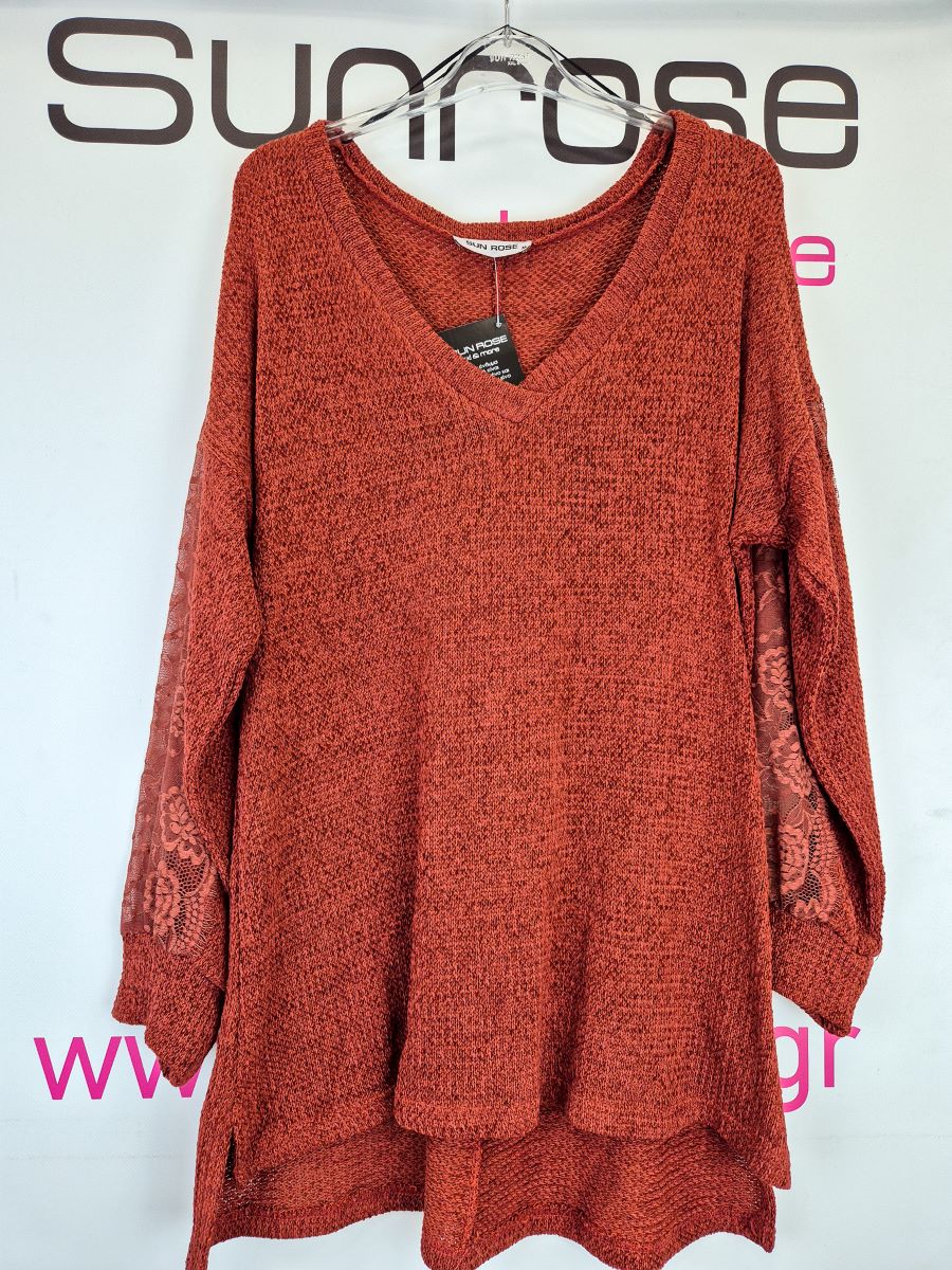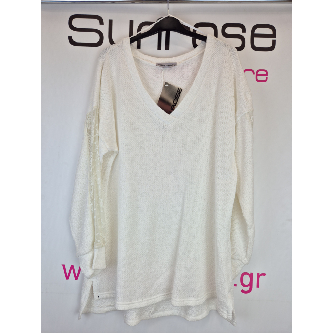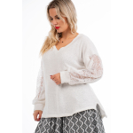 Μπλούζα/Πουλόβερ σε πλεκτό κοπής ραφής, V ντεκολτέ, ζαπονέ μανίκια με τρέσσα δαντέλα στο πάνω μέρος, σε Α άνετη γραμμή με διακριτικό σκίσιμο στο πλάι
