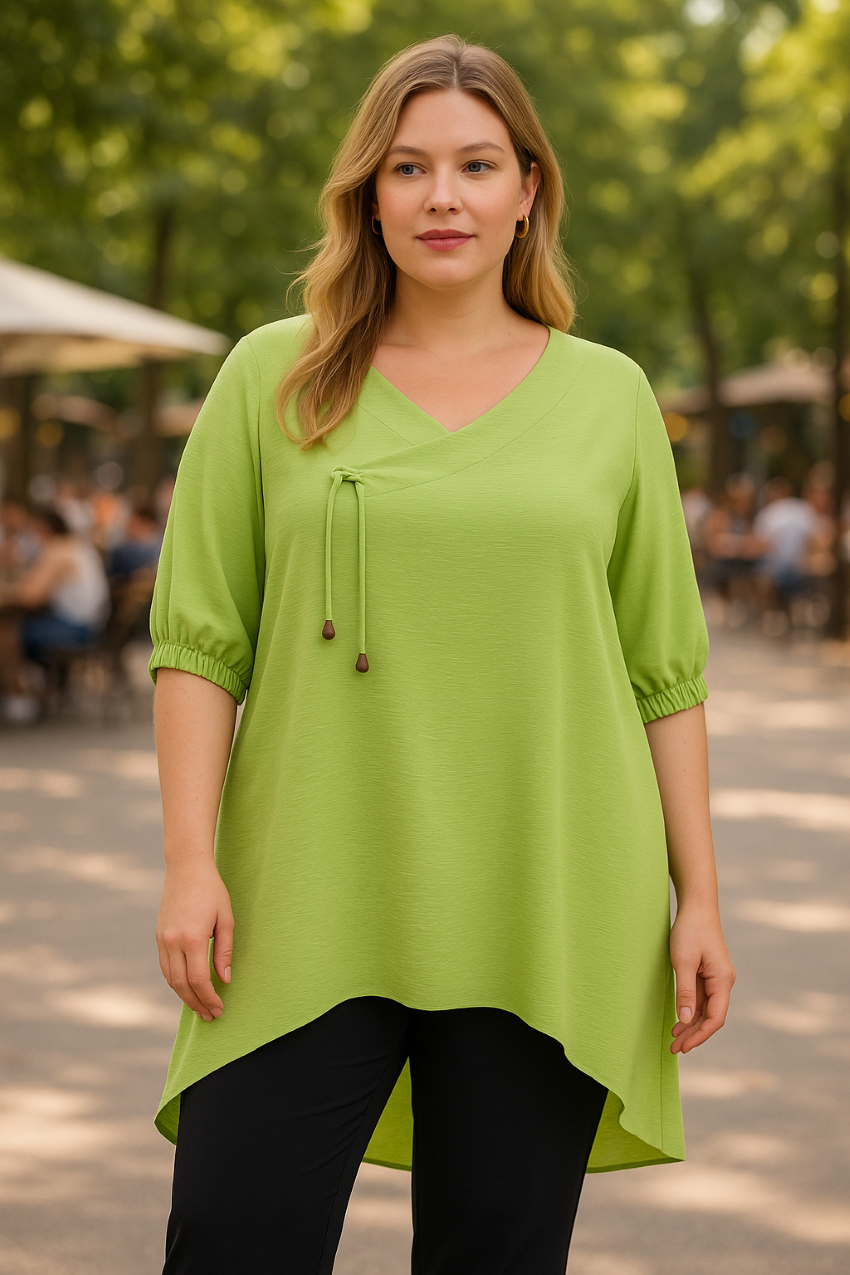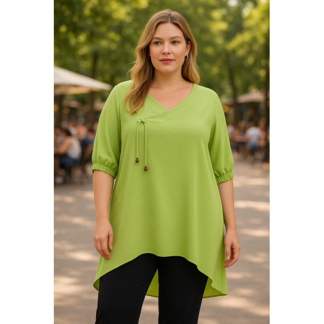 Μπλουζοφόρεμα άνισο, σε loose γραμμή με ιδιαίτερο όμορφο ντεκολτέ, μανίκια στον αγκώνα με λάστιχο στο τελείωμά τους, σε Α πολύ άνετη γραμμή