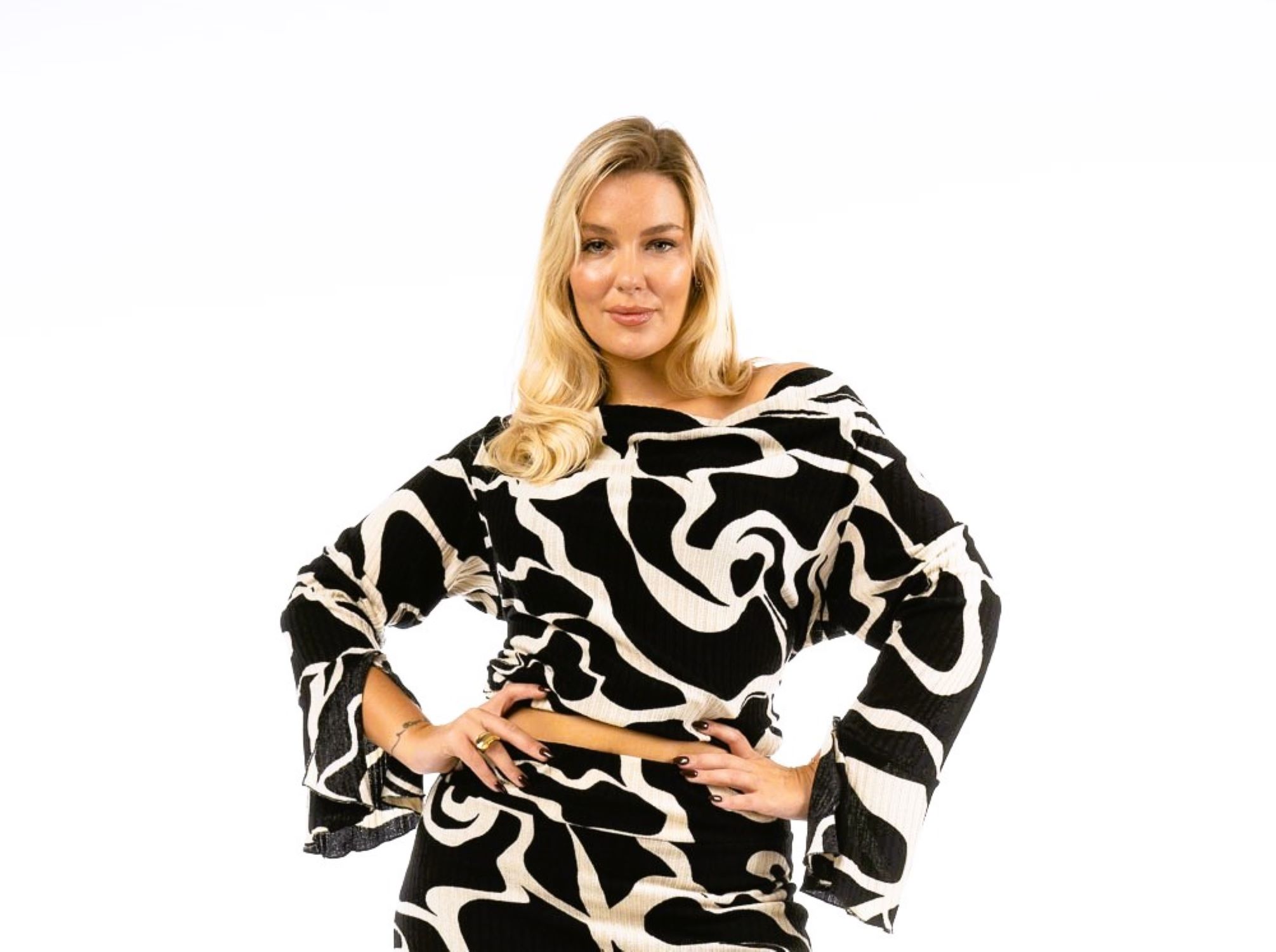 Μπλούζα με ντραπέ ντεκολτέ και με την δυνατότητα να γίνει "χαμόγελο" και off shoulder, μανίκια με μικρό βολάν στο τελείωμά τους, λάστιχο στο κάτω μέρος για δημιουργία ballon (σκεπάζει κοιλιά).