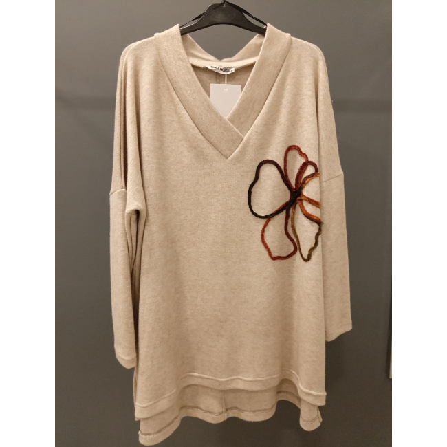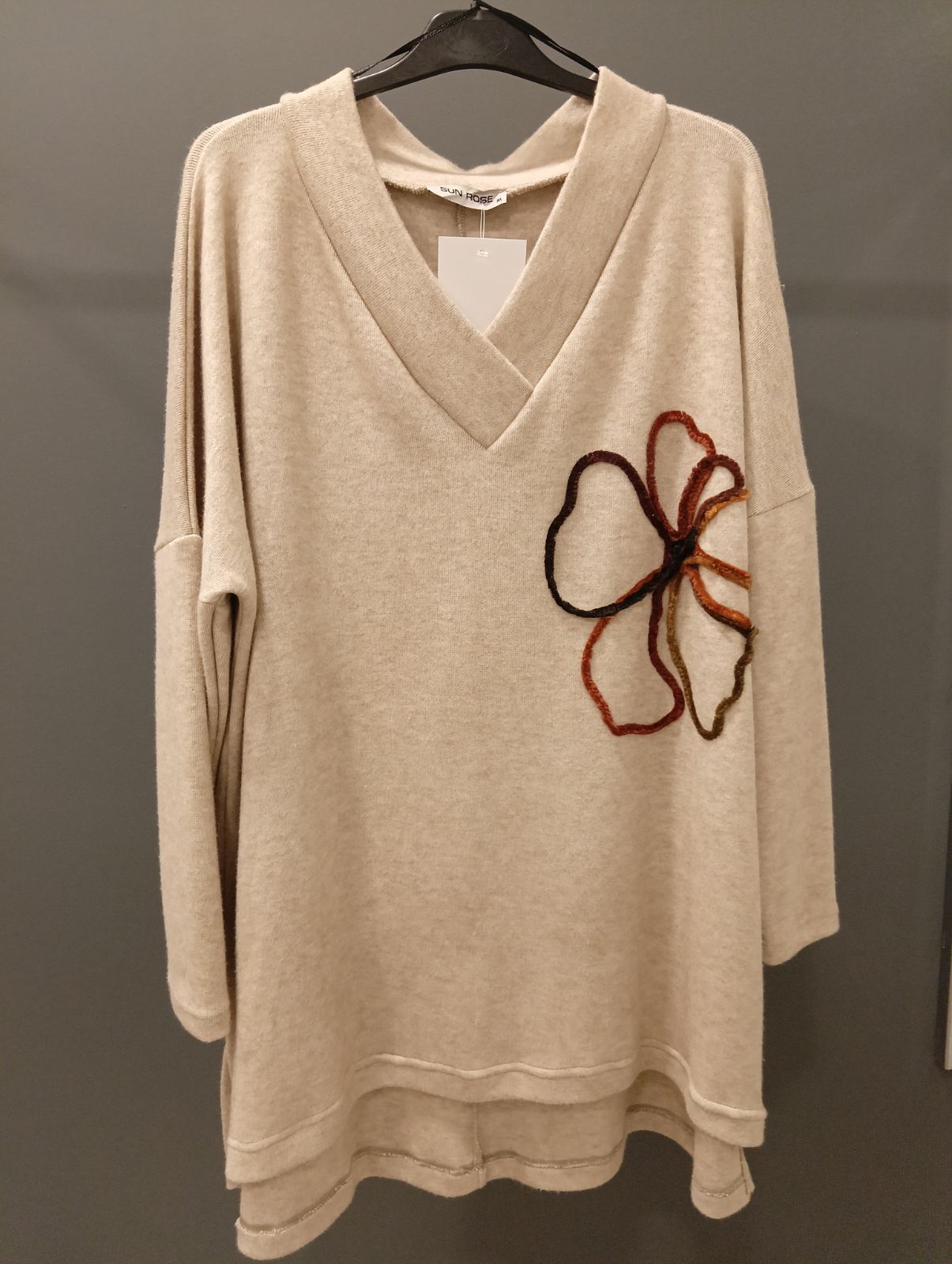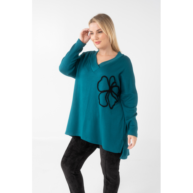 Oversize Μπλούζα σε Kashmir ύφασμα κοπής/ραφής ελαστικό με βελούδινη ζεστασιά, άνισο, V ντεκολτέ, ελεύθερα μανίκια, βελούδο κέντημα μπροστά, σε ίσια πολύ άνετη γραμμή