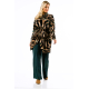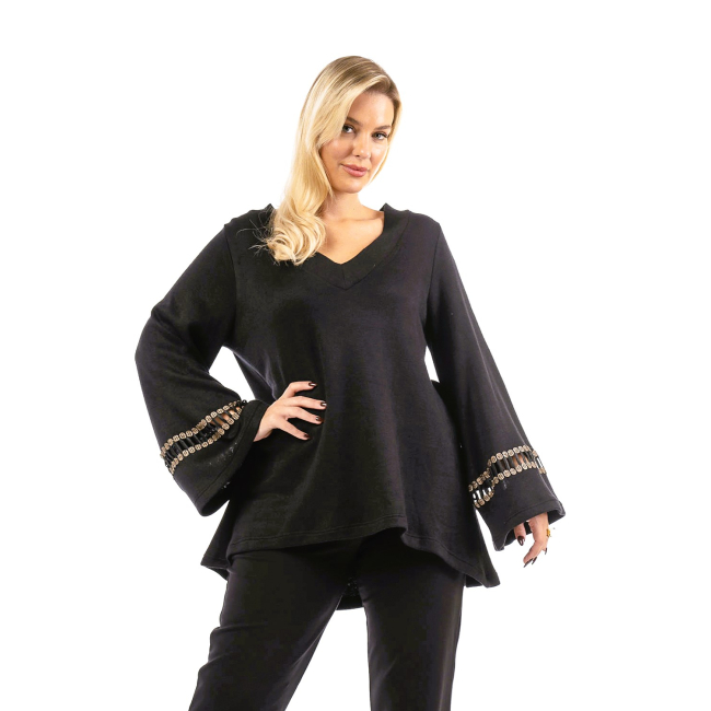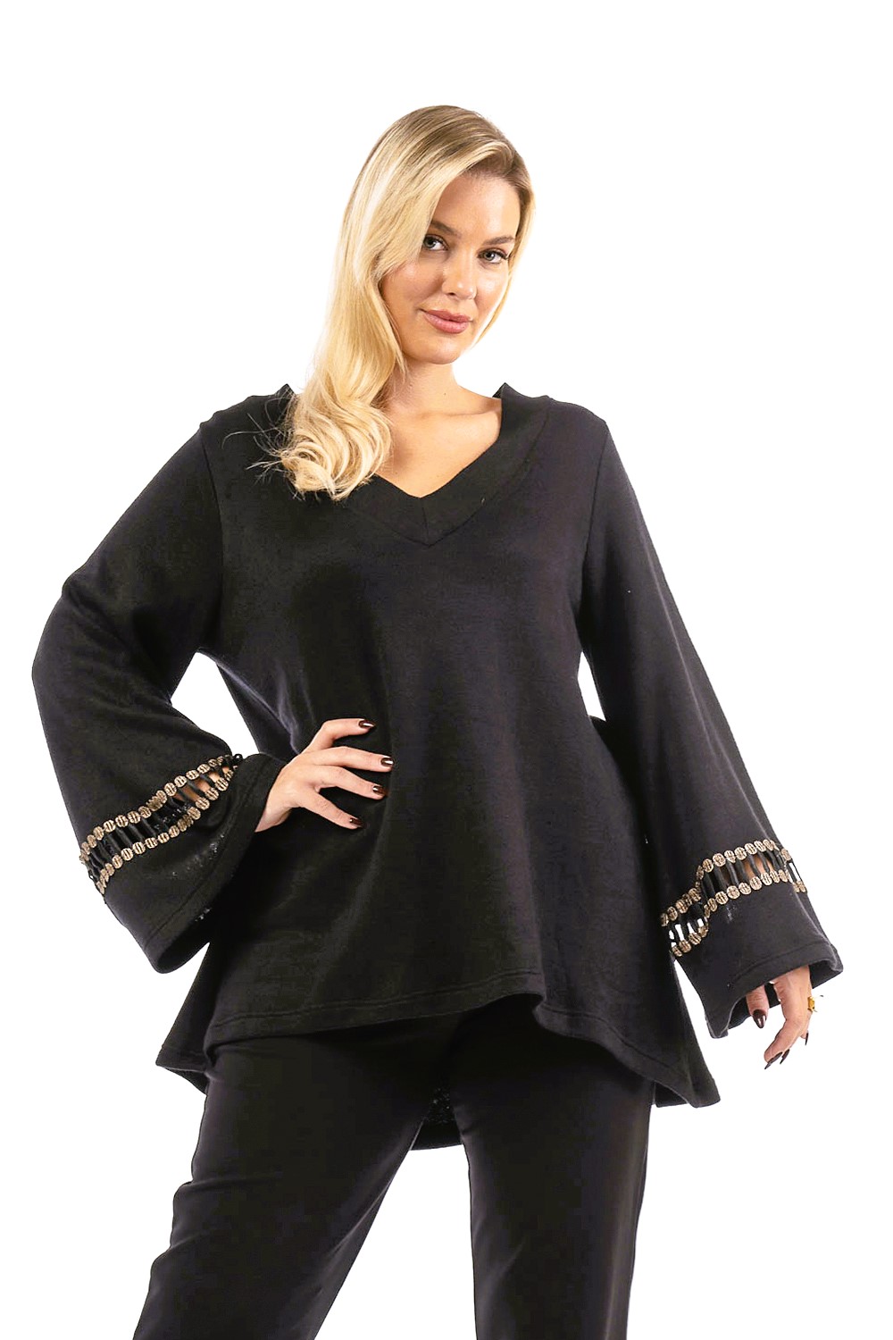 Μπλουζοφόρεμα σε πλεκτό ύφασμα κοπής ραφής με V ντεκολτέ, μανίκια σε Α γραμμή με διάτρητη τρέσα στο τελείωμά τους, σε Α πολύ άνετη γραμμή