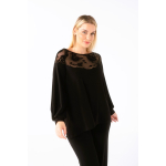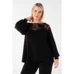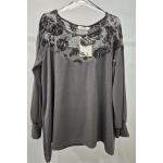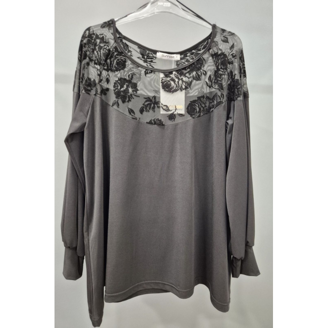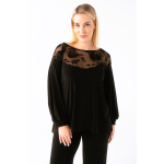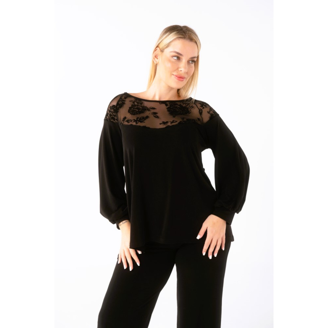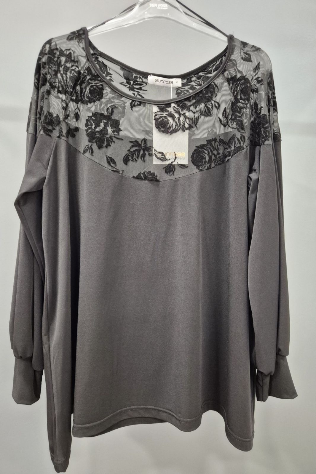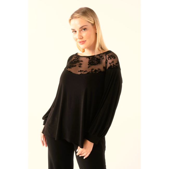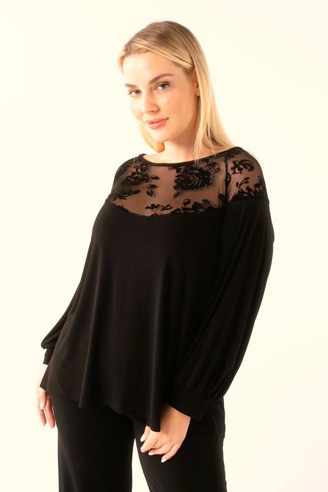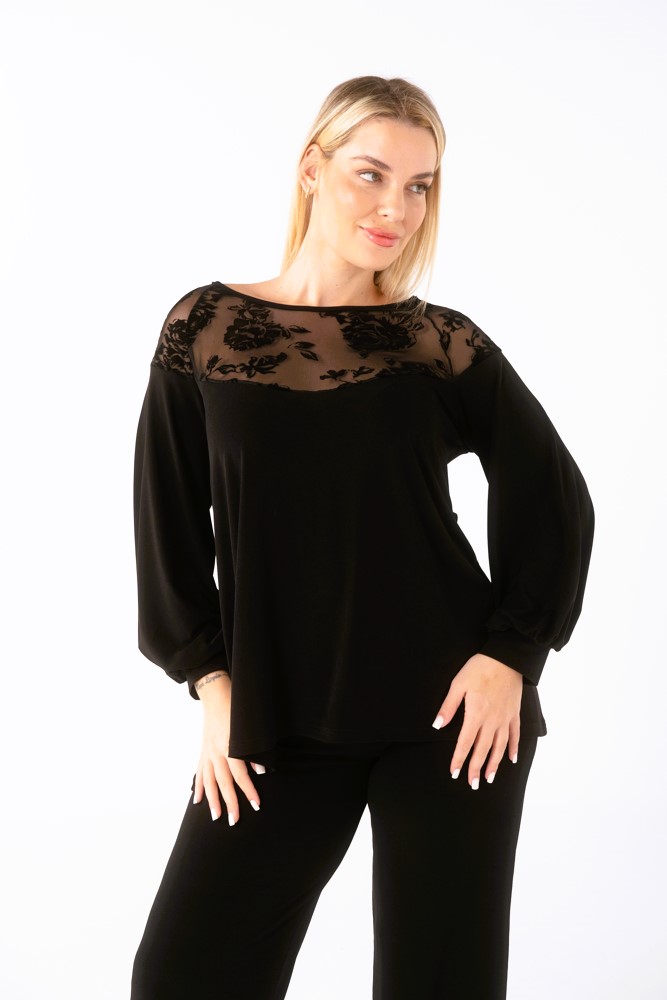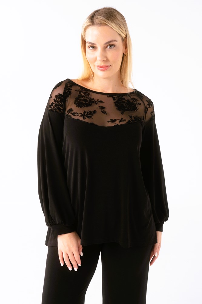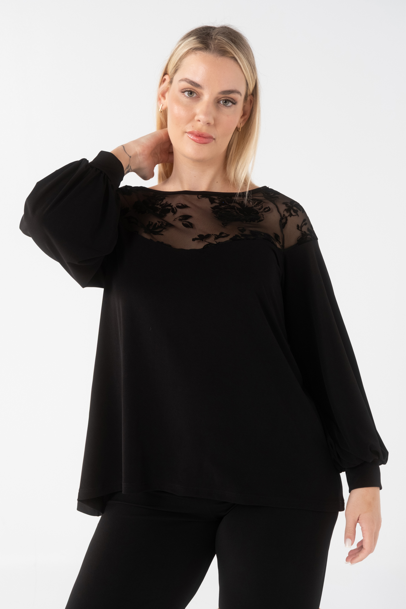 Jersey Μπλούζα, στρογγυλή λαιμόκοψη, ελαστικό τούλι επάνω με στάμπα βελούδονο τριαντάφυλλο, μανίκια με μανσέτα, σε ίσια άνετη γραμμή