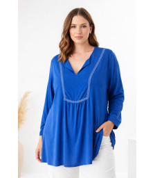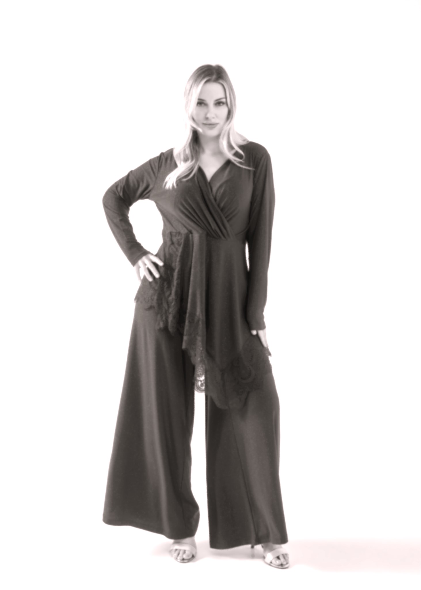 Μπλουζοφόρεμα άνισο με Κρουαζέ μπούστο, διακριτική ραφή στην μέση, τρουακάρ μανίκια, δαντέλα του ίδιου χρώματος δεξιά και στο τελείωμα σε Α πολύ άνετη γραμμή.