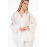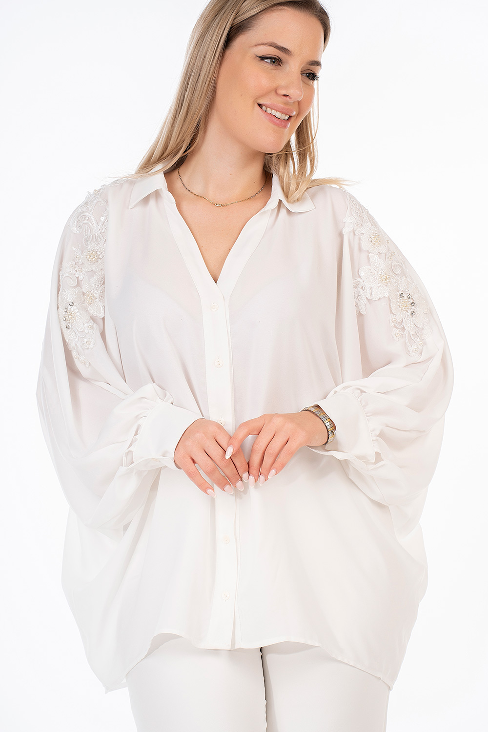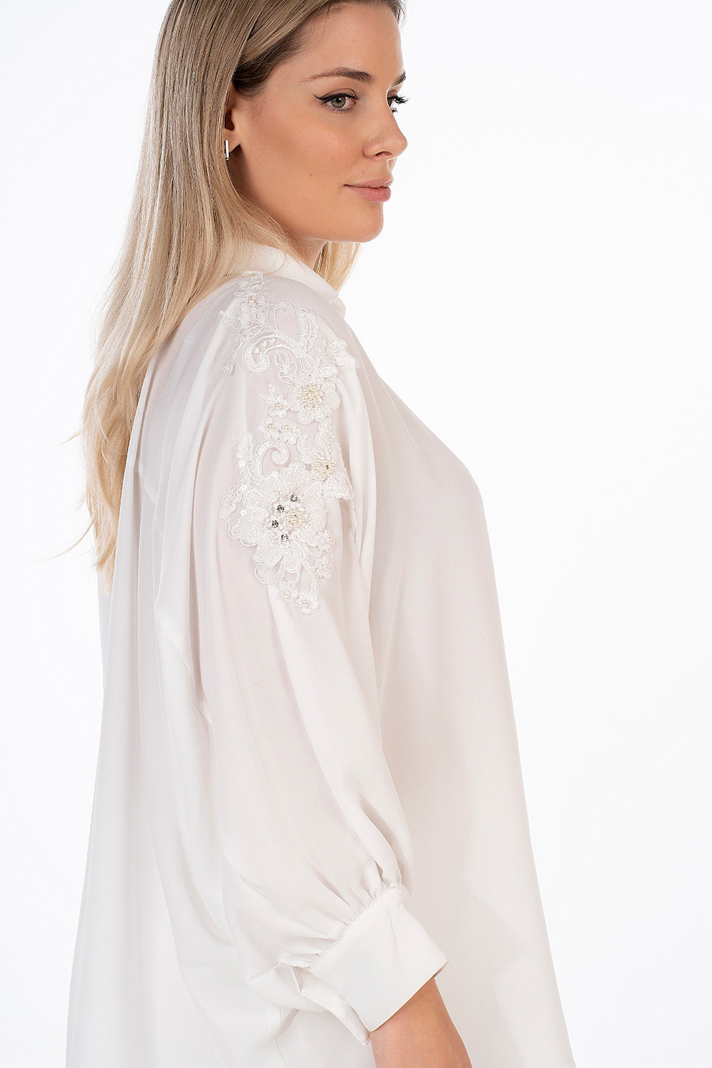 Ένα εξαιρετικής ποιότητας και κομψότητας Πουκάμισο oversize & onesize σε ζορζέτα ύφασμα με απλικέ μοτίφ στα μανίκια. Σε πολύ άνετη γραμμή